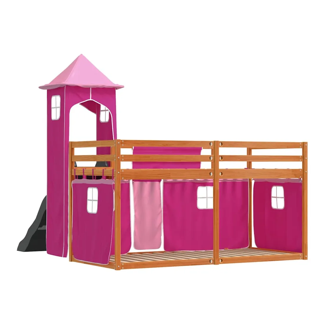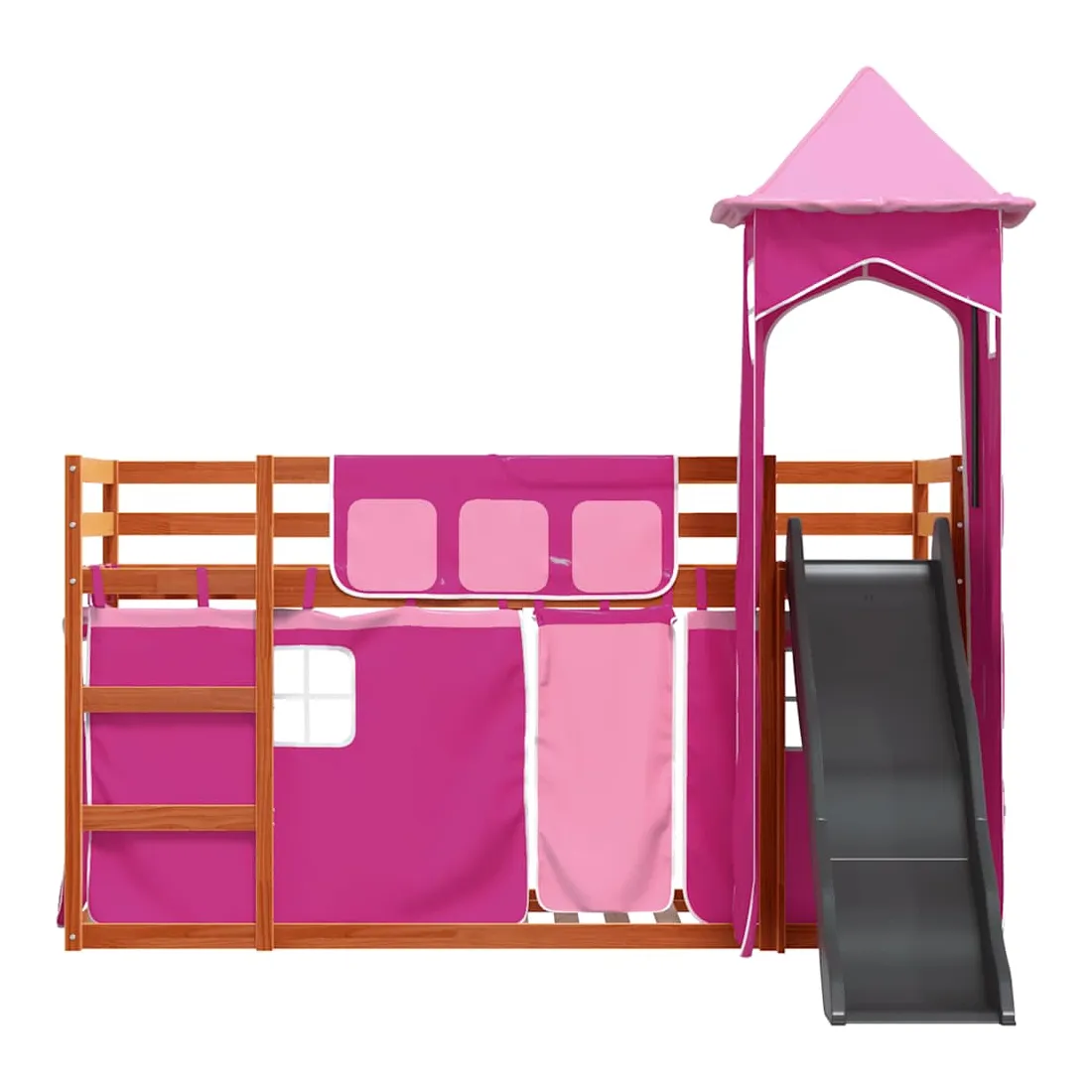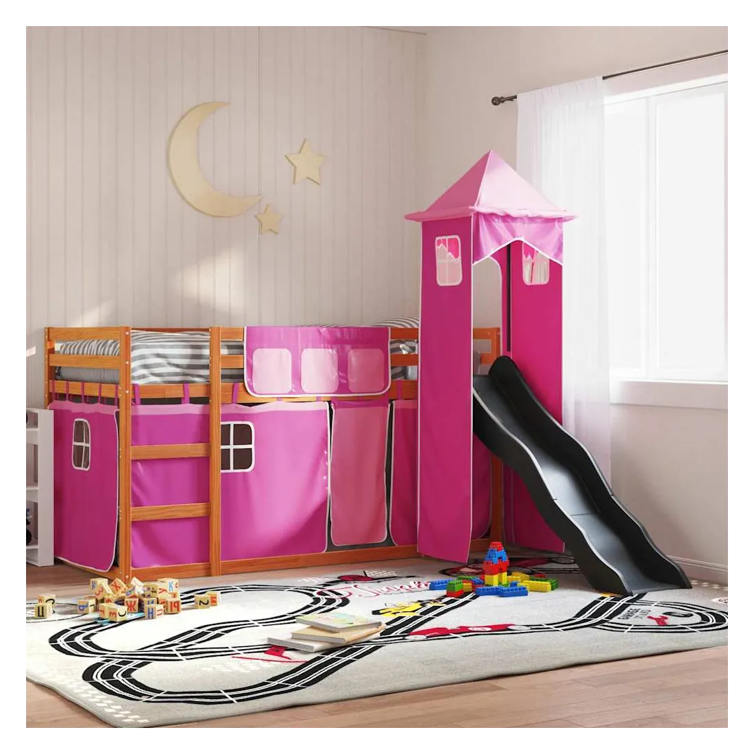 Ce lit superposé en bois est élégant et fonctionnel, ce qui en fait un supplément parfait à toute pièce dont l'espace est limité. Bois de pin massif : ce lit superposé est fabriqué en bois de pin massif pour plus de stabilité et de durabilité. Le bois de pin a un grain droit et les nœuds donnent au matériau son aspect rustique caractéristique.Très amusant : vous pouvez combiner les rideaux avec le lit superposé bas pour créer la base secrète de votre enfant, ce qui permet de s’amuser à l’heure du coucher et d’ajouter un point d'intérêt à la chambre à coucher !Barrières de sécurité : le lit supérieur est équipé de garde-corps de sécurité sur les 4 côtés, afin que votre enfant puisse dormir sans craindre de tomber.Échelle et toboggan pratiques : ce lit superposé est doté d'un toboggan amusant qui apporte de la joie et transforme leur chambre en une aire de jeux intérieure. La combinaison d'une échelle d'escalade et d'un toboggan rend l'heure du coucher plus vivante et plus intéressante pour les enfants.Lattes robustes : les lattes de contreplaqué assurent une bonne répartition du poids, garantissant que le matelas reste en place à chaque torsion de votre corps pendant le sommeil. Bon à savoir :Un matelas n'est pas inclus avec ce lit. Nous offrons une sélection variée de matelas. Vous pouvez consulter notre boutique pour trouver un matelas assorti. Attention :Pour éviter qu'il ne bascule, ce produit doit être utilisé avec le dispositif de fixation murale fourni.