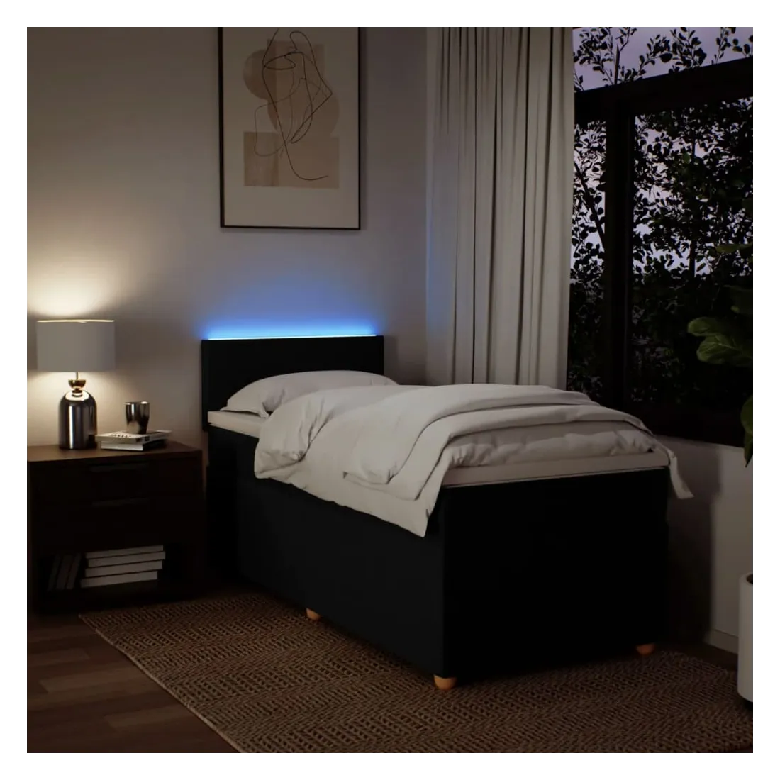 Utilisez ce lit à sommier pour profiter d'une nuit de sommeil réparatrice ! Il vous offre une relaxation maximale et un sommeil agréable. Matériau doux et durable : le tissu en polyester allie douceur, respirabilité et durabilité, vous garantissant un confort et une convivialité ultimes.Matelas à ressorts ensachés : ce matelas à ressorts ensachés comporte des ressorts ensachés individuels qui fonctionnent indépendamment pour offrir un soutien personnalisé en réagissant uniquement à la pression exercée dans chaque zone. Cette conception empêche « l'enroulement » et réduit le transfert de mouvement par rapport aux matelas traditionnels à ressorts ouverts. Chaque ressort ensaché soutient le corps individuellement.Lumières LED pour une ambiance agréable : ce lit est équipé de lumières LED qui peuvent être facilement réglées pour créer un spectacle lumineux personnalisé. Vous pouvez personnaliser les modes, les couleurs et la luminosité pour améliorer l'ambiance de votre espace intérieur.Surmatelas confortable : ce surmatelas améliore le soutien et le confort grâce à sa surface douce et respirante, tout en prolongeant la durée de vie de votre matelas. Sa housse amovible permet un lavage facile, ce qui facilite l'entretien. Bon à savoir :Ce produit est doté d'un connecteur USB qui nécessite une source d'alimentation USB de 5V certifiée (non incluse).Pour des raisons d'hygiène, le matelas ne peut pas être retourné si l'emballage est retiré ou ouvert.Seule la partie avec un symbole de ciseaux peut être coupée et seule la partie avec l'USB continuera à fonctionner comme avant.