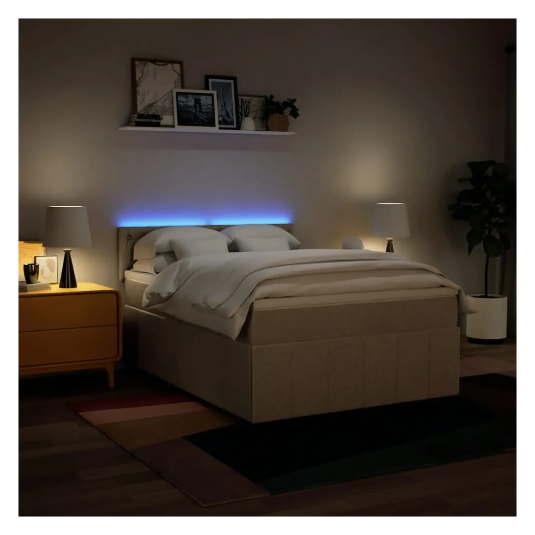 Utilisez ce lit à sommier pour profiter d'une nuit de sommeil réparatrice ! Il vous offre une relaxation maximale et un sommeil agréable. Matériau doux et durable : le tissu en polyester allie douceur, respirabilité et durabilité, vous garantissant un confort et une convivialité ultimes.Matelas à ressorts ensachés : ce matelas à ressorts ensachés comporte des ressorts ensachés individuels qui fonctionnent indépendamment pour offrir un soutien personnalisé en réagissant uniquement à la pression exercée dans chaque zone. Cette conception empêche « l'enroulement » et réduit le transfert de mouvement par rapport aux matelas traditionnels à ressorts ouverts. Chaque ressort ensaché soutient le corps individuellement.Lumières LED pour une ambiance agréable : ce lit est équipé de lumières LED qui peuvent être facilement réglées pour créer un spectacle lumineux personnalisé. Vous pouvez personnaliser les modes, les couleurs et la luminosité pour améliorer l'ambiance de votre espace intérieur.Surmatelas confortable : ce surmatelas améliore le soutien et le confort grâce à sa surface douce et respirante, tout en prolongeant la durée de vie de votre matelas. Sa housse amovible permet un lavage facile, ce qui facilite l'entretien. Bon à savoir :Ce produit est doté d'un connecteur USB qui nécessite une source d'alimentation USB de 5V certifiée (non incluse).Pour des raisons d'hygiène, le matelas ne peut pas être retourné si l'emballage est retiré ou ouvert.Seule la partie avec un symbole de ciseaux peut être coupée et seule la partie avec l'USB continuera à fonctionner comme avant.
