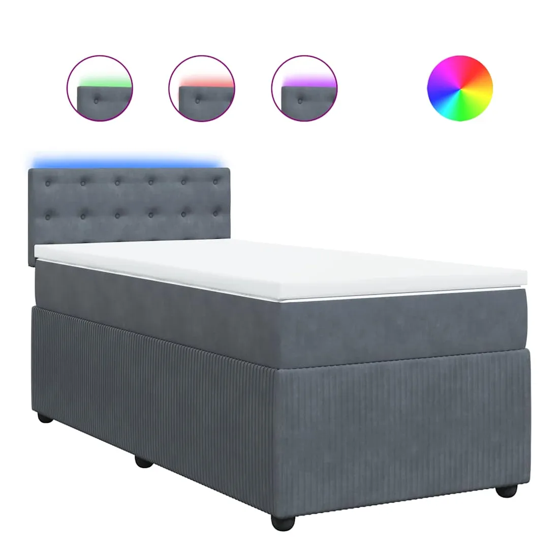 Utilisez ce lit à sommier pour profiter d'une nuit de sommeil réparatrice ! Il vous offre une relaxation maximale et un sommeil agréable. Matériau doux et confortable : le tissu en velours présente une surface douce et lisse qui offre une sensation agréable contre la peau, vous apportant chaleur et confort ultime.Matelas à ressorts ensachés : ce matelas à ressorts ensachés comporte des ressorts ensachés individuels qui fonctionnent indépendamment pour offrir un soutien personnalisé en réagissant uniquement à la pression exercée dans chaque zone. Cette conception empêche « l'enroulement » et réduit le transfert de mouvement par rapport aux matelas traditionnels à ressorts ouverts. Chaque ressort ensaché soutient le corps individuellement.Lumières LED pour une ambiance agréable : ce lit est équipé de lumières LED qui peuvent être facilement réglées pour créer un spectacle lumineux personnalisé. Vous pouvez personnaliser les modes, les couleurs et la luminosité pour améliorer l'ambiance de votre espace intérieur.Surmatelas confortable : ce surmatelas améliore le soutien et le confort grâce à sa surface douce et respirante, tout en prolongeant la durée de vie de votre matelas. Sa housse amovible permet un lavage facile, ce qui facilite l'entretien. Bon à savoir :Ce produit est doté d'un connecteur USB qui nécessite une source d'alimentation USB de 5V certifiée (non incluse).Pour des raisons d'hygiène, le matelas ne peut pas être retourné si l'emballage est retiré ou ouvert.Seule la partie avec un symbole de ciseaux peut être coupée et seule la partie avec l'USB continuera à fonctionner comme avant.