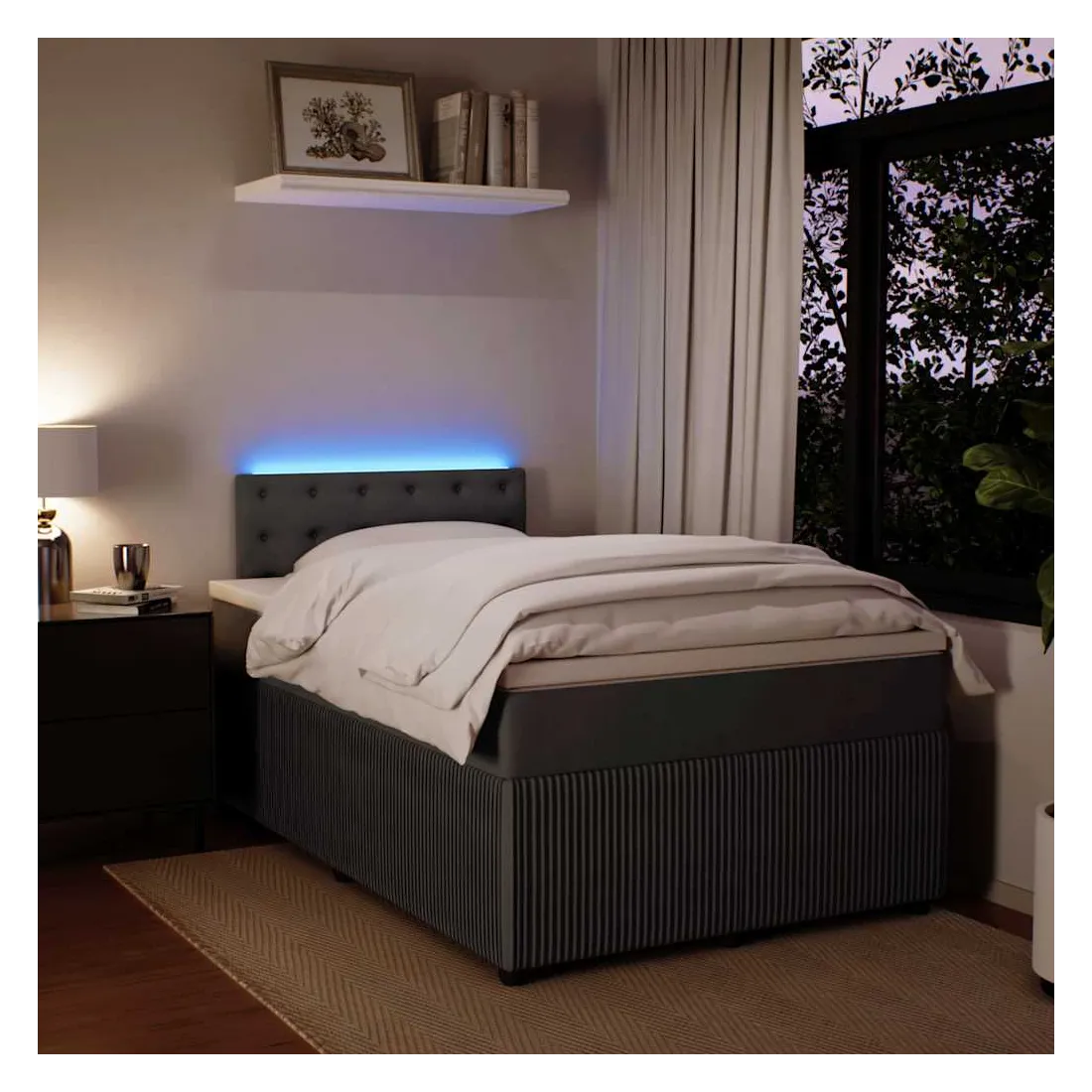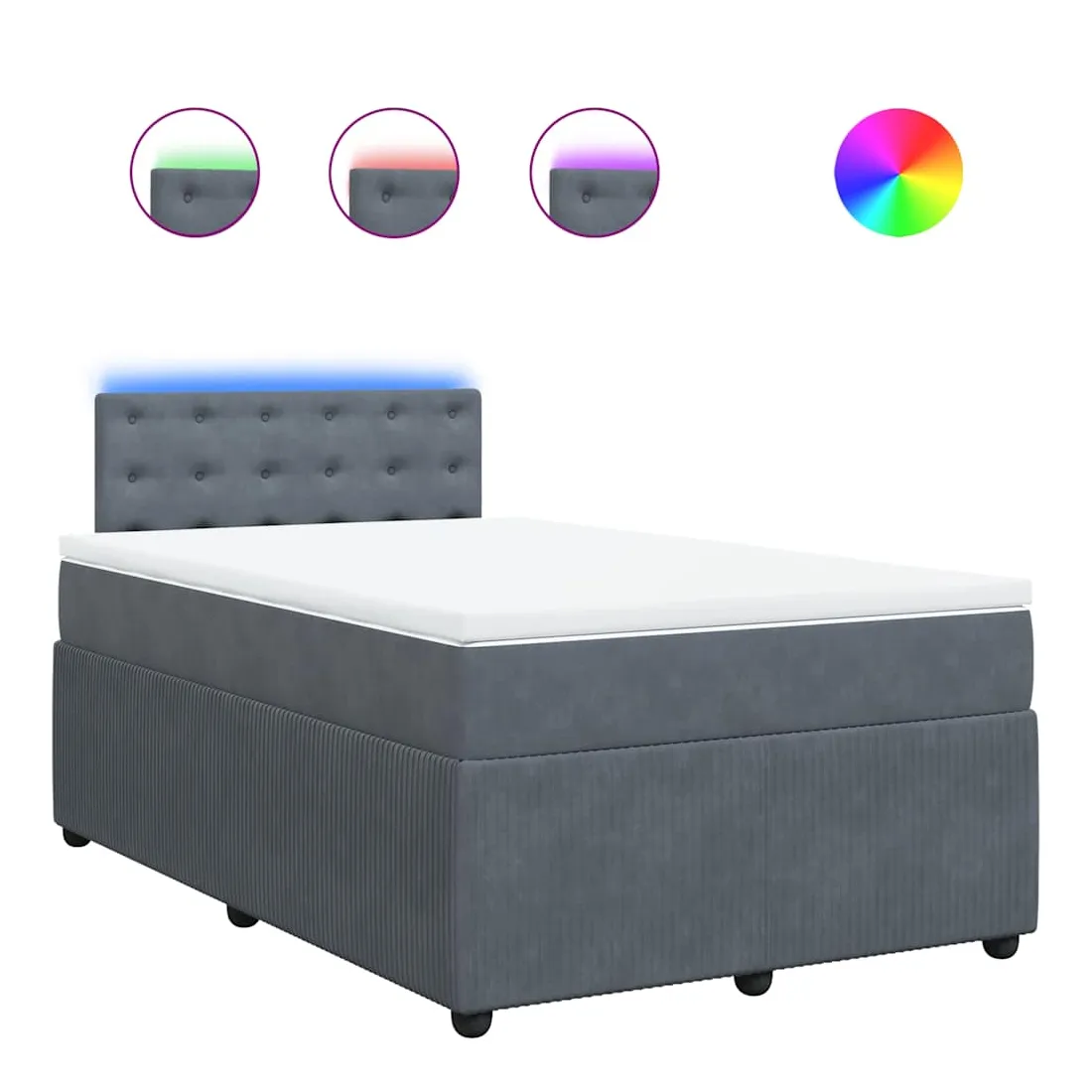 Utilisez ce lit à sommier pour profiter d'une nuit de sommeil réparatrice ! Il vous offre une relaxation maximale et un sommeil agréable. Matériau doux et confortable : le tissu en velours présente une surface douce et lisse qui offre une sensation agréable contre la peau, vous apportant chaleur et confort ultime.Matelas à ressorts ensachés : ce matelas à ressorts ensachés comporte des ressorts ensachés individuels qui fonctionnent indépendamment pour offrir un soutien personnalisé en réagissant uniquement à la pression exercée dans chaque zone. Cette conception empêche « l'enroulement » et réduit le transfert de mouvement par rapport aux matelas traditionnels à ressorts ouverts. Chaque ressort ensaché soutient le corps individuellement.Lumières LED pour une ambiance agréable : ce lit est équipé de lumières LED qui peuvent être facilement réglées pour créer un spectacle lumineux personnalisé. Vous pouvez personnaliser les modes, les couleurs et la luminosité pour améliorer l'ambiance de votre espace intérieur.Surmatelas confortable : ce surmatelas améliore le soutien et le confort grâce à sa surface douce et respirante, tout en prolongeant la durée de vie de votre matelas. Sa housse amovible permet un lavage facile, ce qui facilite l'entretien. Bon à savoir :Ce produit est doté d'un connecteur USB qui nécessite une source d'alimentation USB de 5V certifiée (non incluse).Pour des raisons d'hygiène, le matelas ne peut pas être retourné si l'emballage est retiré ou ouvert.Seule la partie avec un symbole de ciseaux peut être coupée et seule la partie avec l'USB continuera à fonctionner comme avant.