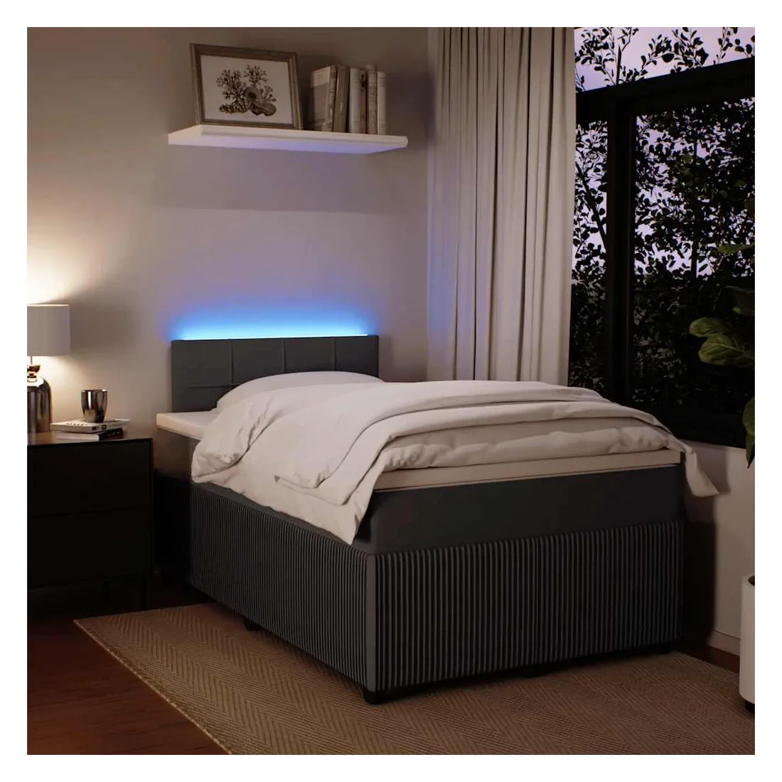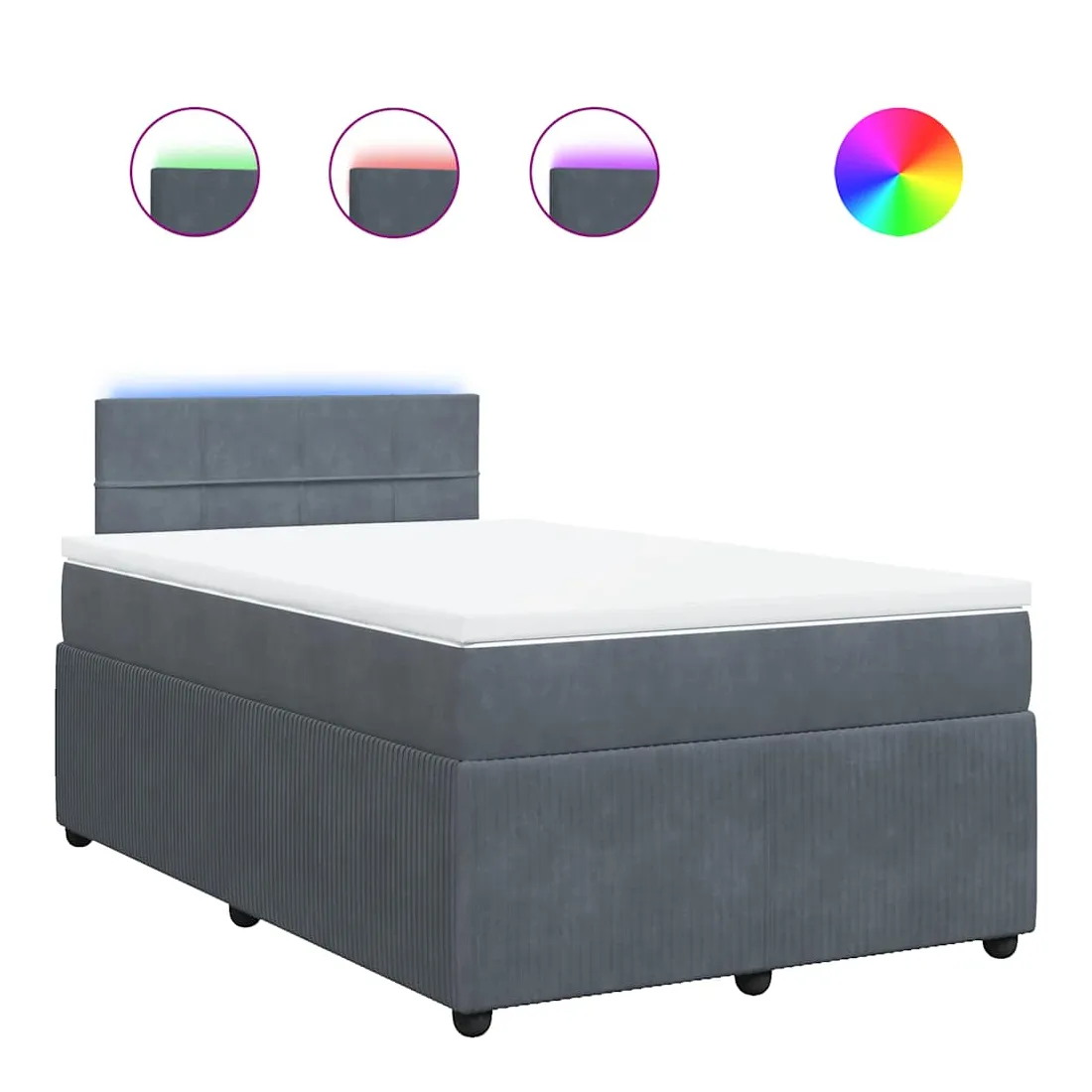 Utilisez ce lit à sommier pour profiter d'une nuit de sommeil réparatrice ! Il vous offre une relaxation maximale et un sommeil agréable. Matériau doux et confortable : le tissu en velours présente une surface douce et lisse qui offre une sensation agréable contre la peau, vous apportant chaleur et confort ultime.Matelas à ressorts ensachés : ce matelas à ressorts ensachés comporte des ressorts ensachés individuels qui fonctionnent indépendamment pour offrir un soutien personnalisé en réagissant uniquement à la pression exercée dans chaque zone. Cette conception empêche « l'enroulement » et réduit le transfert de mouvement par rapport aux matelas traditionnels à ressorts ouverts. Chaque ressort ensaché soutient le corps individuellement.Lumières LED pour une ambiance agréable : ce lit est équipé de lumières LED qui peuvent être facilement réglées pour créer un spectacle lumineux personnalisé. Vous pouvez personnaliser les modes, les couleurs et la luminosité pour améliorer l'ambiance de votre espace intérieur.Surmatelas confortable : ce surmatelas améliore le soutien et le confort grâce à sa surface douce et respirante, tout en prolongeant la durée de vie de votre matelas. Sa housse amovible permet un lavage facile, ce qui facilite l'entretien. Bon à savoir :Ce produit est doté d'un connecteur USB qui nécessite une source d'alimentation USB de 5V certifiée (non incluse).Pour des raisons d'hygiène, le matelas ne peut pas être retourné si l'emballage est retiré ou ouvert.Seule la partie avec un symbole de ciseaux peut être coupée et seule la partie avec l'USB continuera à fonctionner comme avant.