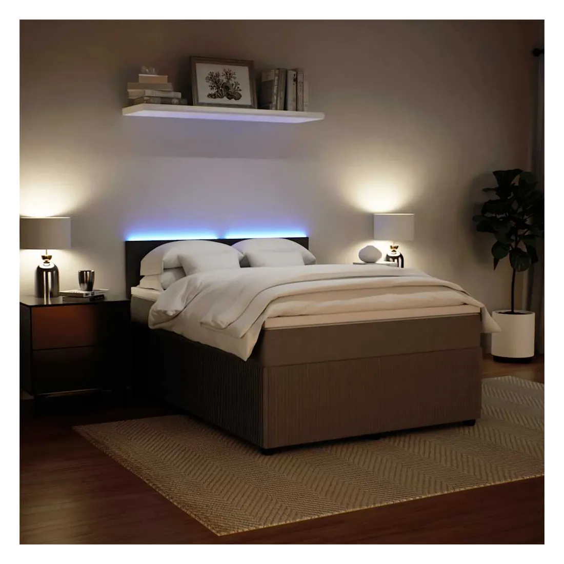 Utilisez ce lit à sommier pour profiter d'une nuit de sommeil réparatrice ! Il vous offre une relaxation maximale et un sommeil agréable. Matériau doux et confortable : le tissu en velours présente une surface douce et lisse qui offre une sensation agréable contre la peau, vous apportant chaleur et confort ultime.Matelas à ressorts ensachés : ce matelas à ressorts ensachés comporte des ressorts ensachés individuels qui fonctionnent indépendamment pour offrir un soutien personnalisé en réagissant uniquement à la pression exercée dans chaque zone. Cette conception empêche « l'enroulement » et réduit le transfert de mouvement par rapport aux matelas traditionnels à ressorts ouverts. Chaque ressort ensaché soutient le corps individuellement.Lumières LED pour une ambiance agréable : ce lit est équipé de lumières LED qui peuvent être facilement réglées pour créer un spectacle lumineux personnalisé. Vous pouvez personnaliser les modes, les couleurs et la luminosité pour améliorer l'ambiance de votre espace intérieur.Surmatelas confortable : ce surmatelas améliore le soutien et le confort grâce à sa surface douce et respirante, tout en prolongeant la durée de vie de votre matelas. Sa housse amovible permet un lavage facile, ce qui facilite l'entretien. Bon à savoir :Ce produit est doté d'un connecteur USB qui nécessite une source d'alimentation USB de 5V certifiée (non incluse).Pour des raisons d'hygiène, le matelas ne peut pas être retourné si l'emballage est retiré ou ouvert.Seule la partie avec un symbole de ciseaux peut être coupée et seule la partie avec l'USB continuera à fonctionner comme avant.