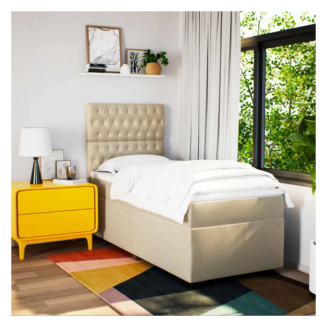 Utilisez ce lit à sommier pour profiter d'une nuit de sommeil réparatrice ! Il vous offre une relaxation maximale et un sommeil agréable. Matériau doux et durable : le tissu en polyester allie douceur, respirabilité et durabilité, vous garantissant un confort et une convivialité ultimes.Matelas à ressorts ensachés : ce matelas à ressorts ensachés comporte des ressorts ensachés individuels qui fonctionnent indépendamment pour offrir un soutien personnalisé en réagissant uniquement à la pression exercée dans chaque zone. Cette conception empêche « l'enroulement » et réduit le transfert de mouvement par rapport aux matelas traditionnels à ressorts ouverts. Chaque ressort ensaché soutient le corps individuellement.Tête de lit réglable en hauteur : la tête de lit est réglable en hauteur pour s'adapter à vos préférences.Surmatelas confortable : ce surmatelas améliore le soutien et le confort grâce à sa surface douce et respirante, tout en prolongeant la durée de vie de votre matelas. Sa housse amovible permet un lavage facile, ce qui facilite l'entretien.Lattes pour un soutien optimal : le cadre de lit est complété par des lattes pour offrir un soutien et une respirabilité essentiels à votre matelas. Bon à savoir :Pour des raisons d'hygiène, le matelas ne peut pas être retourné si l'emballage est retiré ou ouvert.