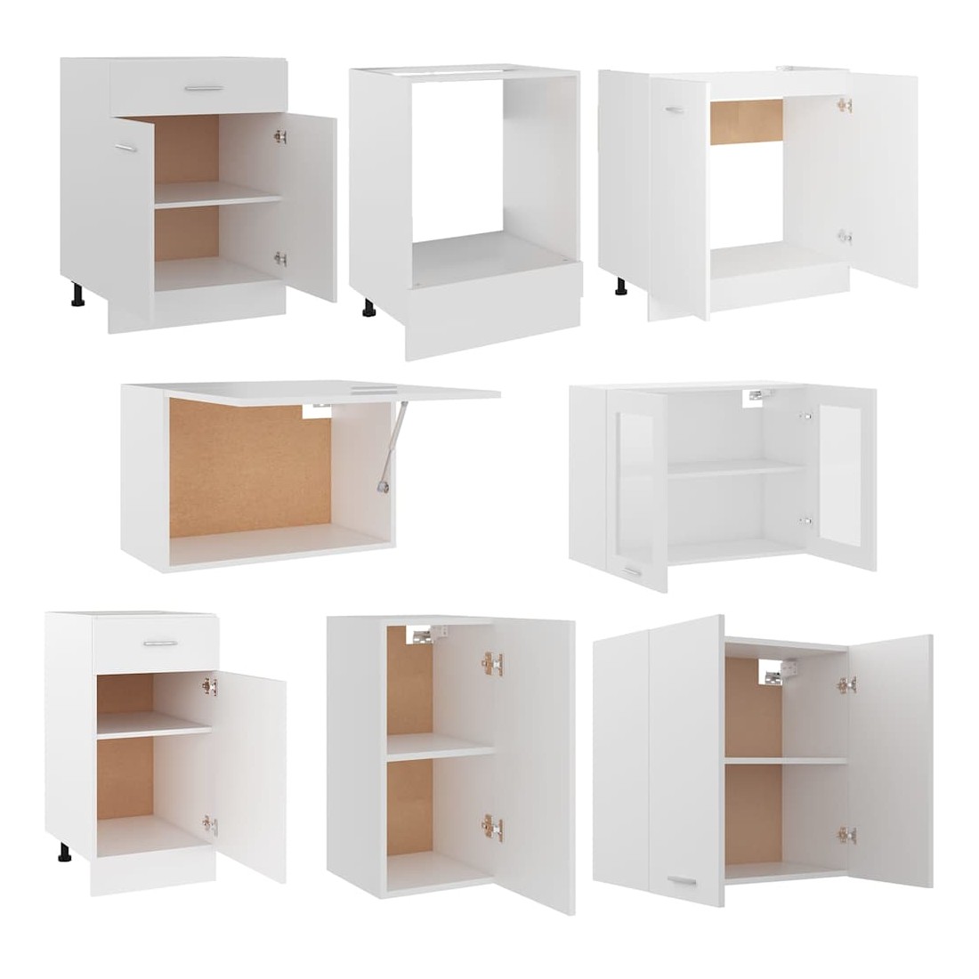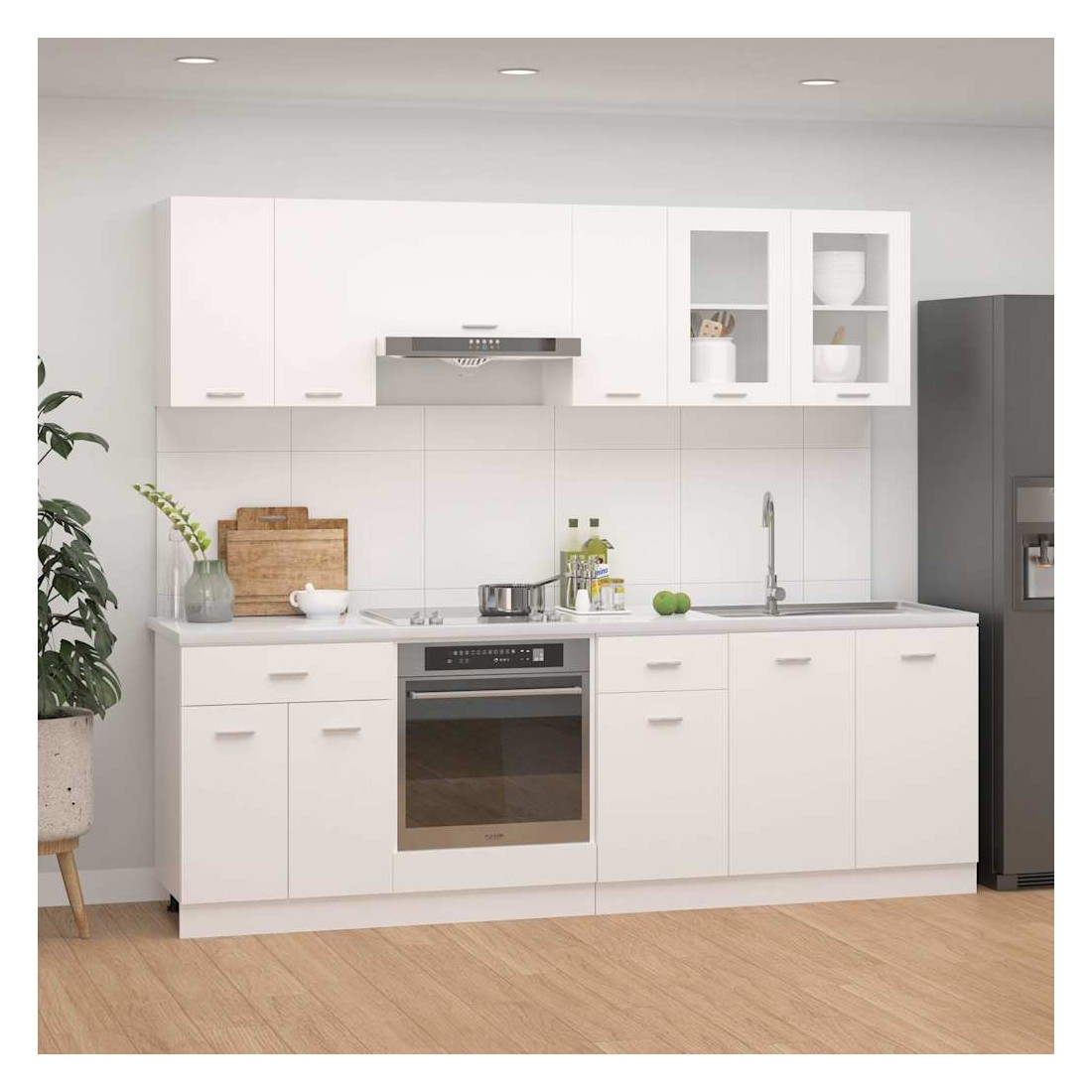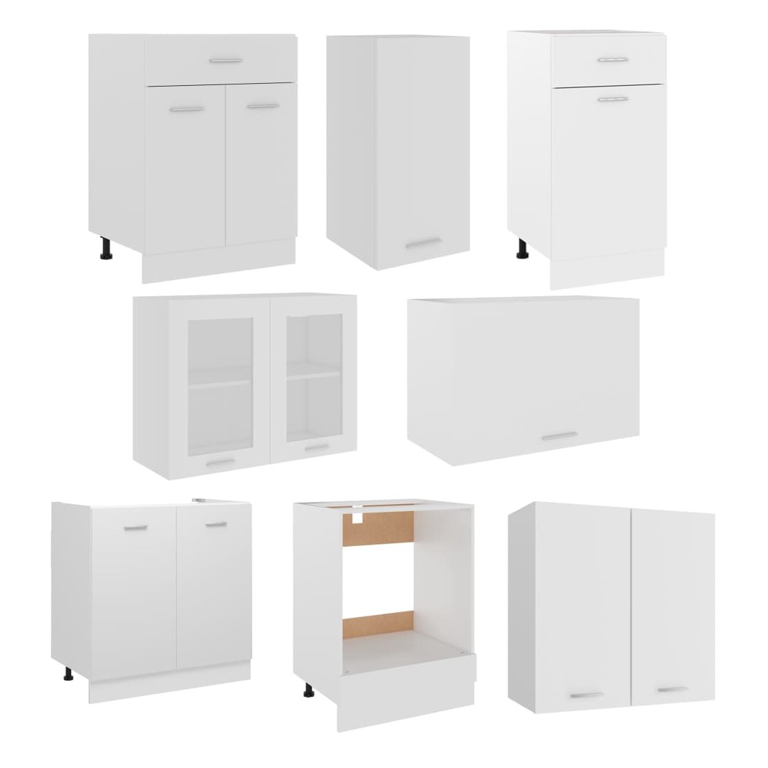 Cet ensemble de 8 meubles de cuisine, au design élégant, optimise l'espace de votre cuisine et offre un vaste espace de rangement pour vos effets personnels ! Ces meubles sont durables et fonctionnels, et vous permettent de mieux organiser votre cuisine. Ils offrent également suffisamment d'espace pour ranger bols, assiettes, casseroles et autres ustensiles de cuisine. De plus, cet ensemble est facile à nettoyer à l'aide d'un chiffon humide. Remarque : le plan de travail, le robinet, l'évier et les appareils électriques ne sont pas inclus dans la livraison. Avertissement : ce produit doit être sécurisé en installant un plan de travail.