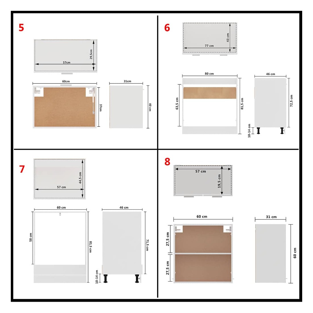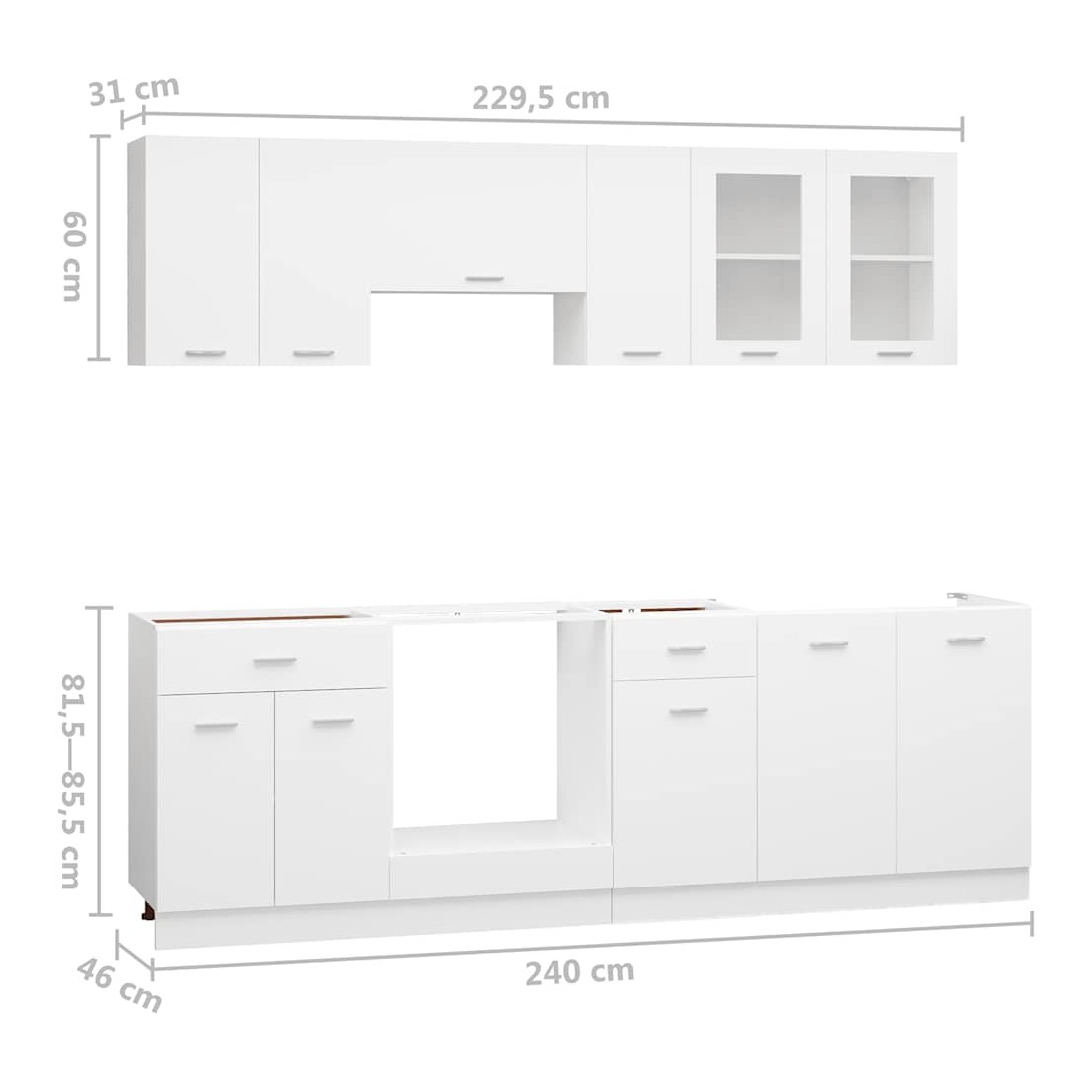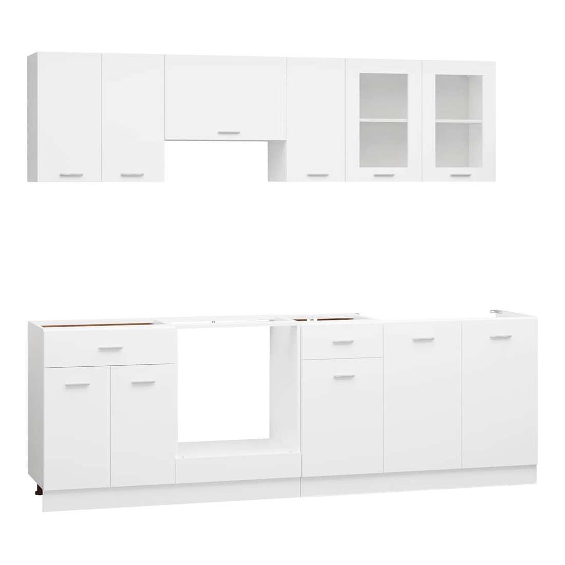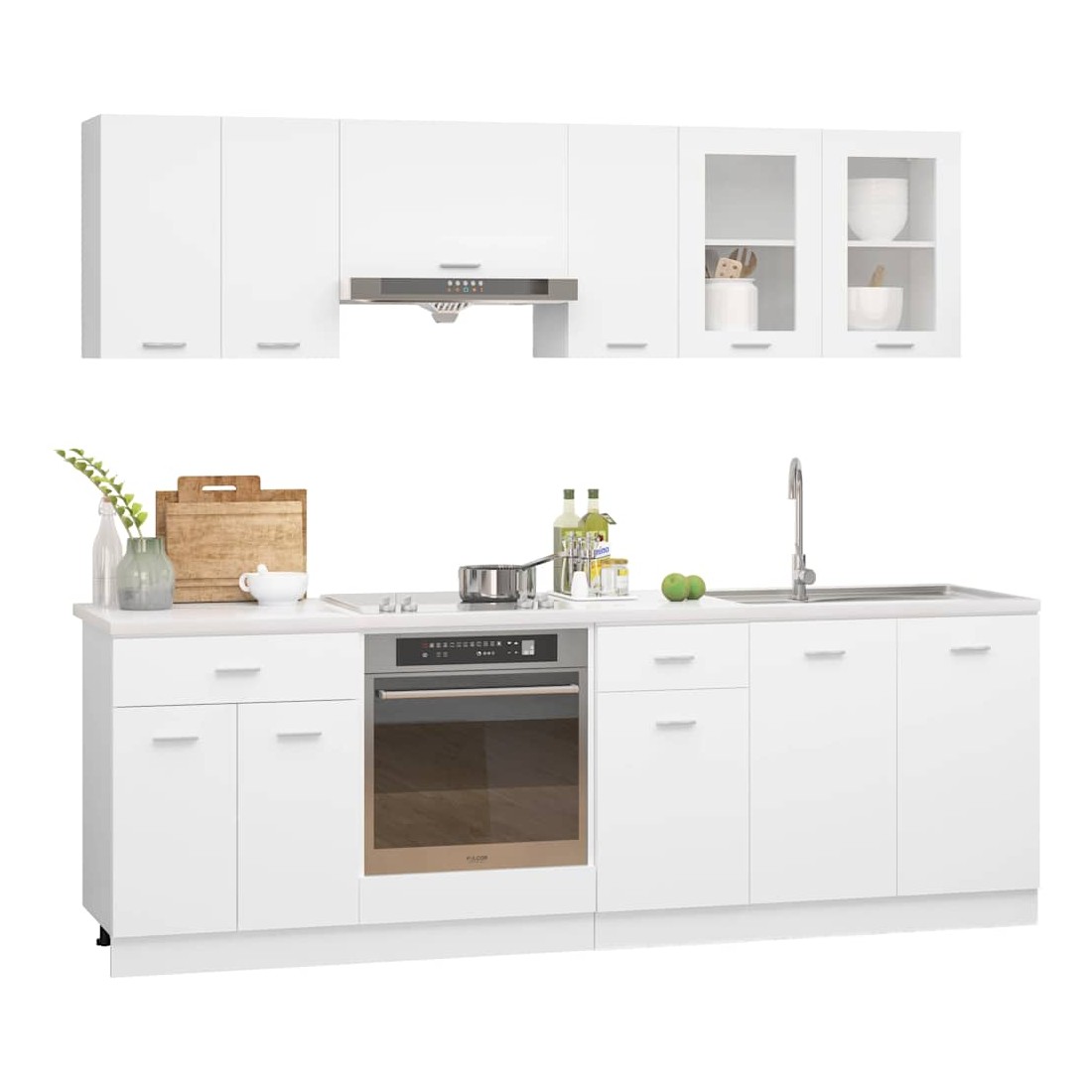 Cet ensemble de 8 meubles de cuisine, au design élégant, optimise l'espace de votre cuisine et offre un vaste espace de rangement pour vos effets personnels ! Ces meubles sont durables et fonctionnels, et vous permettent de mieux organiser votre cuisine. Ils offrent également suffisamment d'espace pour ranger bols, assiettes, casseroles et autres ustensiles de cuisine. De plus, cet ensemble est facile à nettoyer à l'aide d'un chiffon humide. Remarque : le plan de travail, le robinet, l'évier et les appareils électriques ne sont pas inclus dans la livraison. Avertissement : ce produit doit être sécurisé en installant un plan de travail.