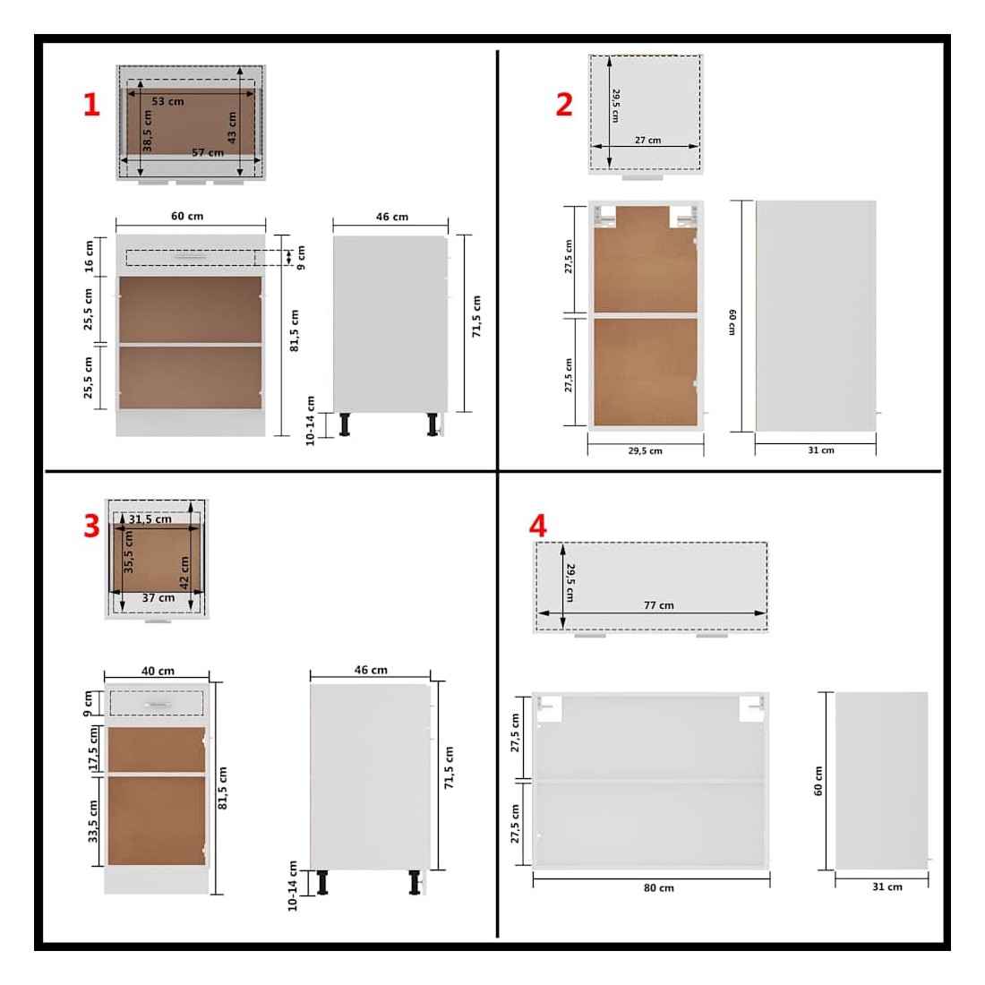 - 1 x Meuble bas d'évier : 80 x 46 x 81,5 cm (L x P x H)