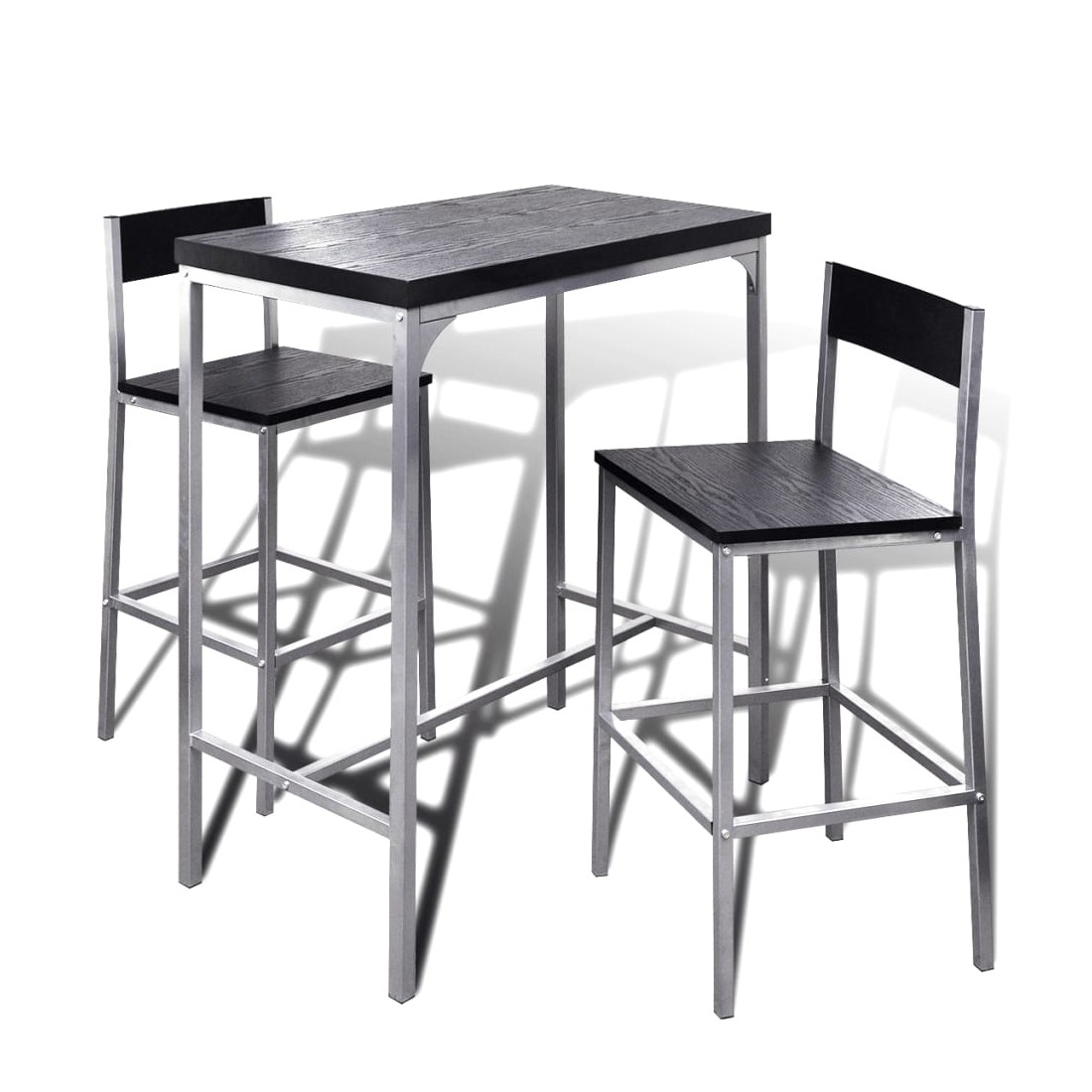 Cet ensemble de bar à petit-déjeuner élégant et moderne allie style et fonctionnalité. Les lignes épurées et la conception compacte le rendent idéal pour les appartements ou autres lieux comme les cafés, les pubs ou les vérandas. Les tabourets peuvent être rentrés sous la table lorsqu'ils ne sont pas utilisés pour économiser plus d'espace. Cet ensemble de bar à petit déjeuner est fabriqué en MDF de haute qualité en noir, facile à nettoyer et convient à tout décor. Les cadres en acier de qualité rendent l'ensemble très stable et durable. L'assemblage est assez simple. La livraison comprend 1 table haute et 2 tabourets.
