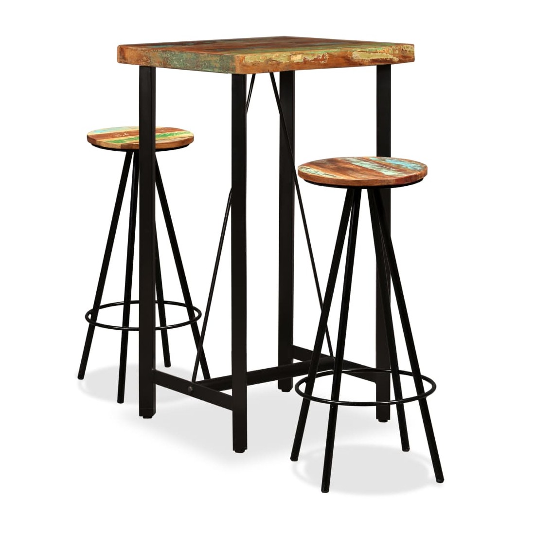 Cet ensemble de bar cool a un style industriel et sera un supplément distinctif à n'importe quelle maison, bar ou restaurant. La table de bar est fait de bois de récupération massif, ce qui signifie qu'il a les caractéristiques de différents bois comme le teck, le bois de manguier, l'acacia, etc. Le bois récupéré est solide, stable, durable et beau. Les signes d'usure donnent à chaque pièce un aspect unique et les pieds en acier s'ajoutent au style industriel spectaculaire. Chaque étape du processus de construction est réalisée avec le plus grand soin, que ce soit la recombinaison, le polissage, la peinture ou le laquage. La livraison comprend 1 table de bar et 2 tabourets de bar. L'assemblage est facile. Remarque importante : Les grains et les couleurs du bois peuvent varier d'une pièce à l'autre, ce qui rend chaque pièce unique et légèrement différente de la suivante ; la livraison est aléatoire.