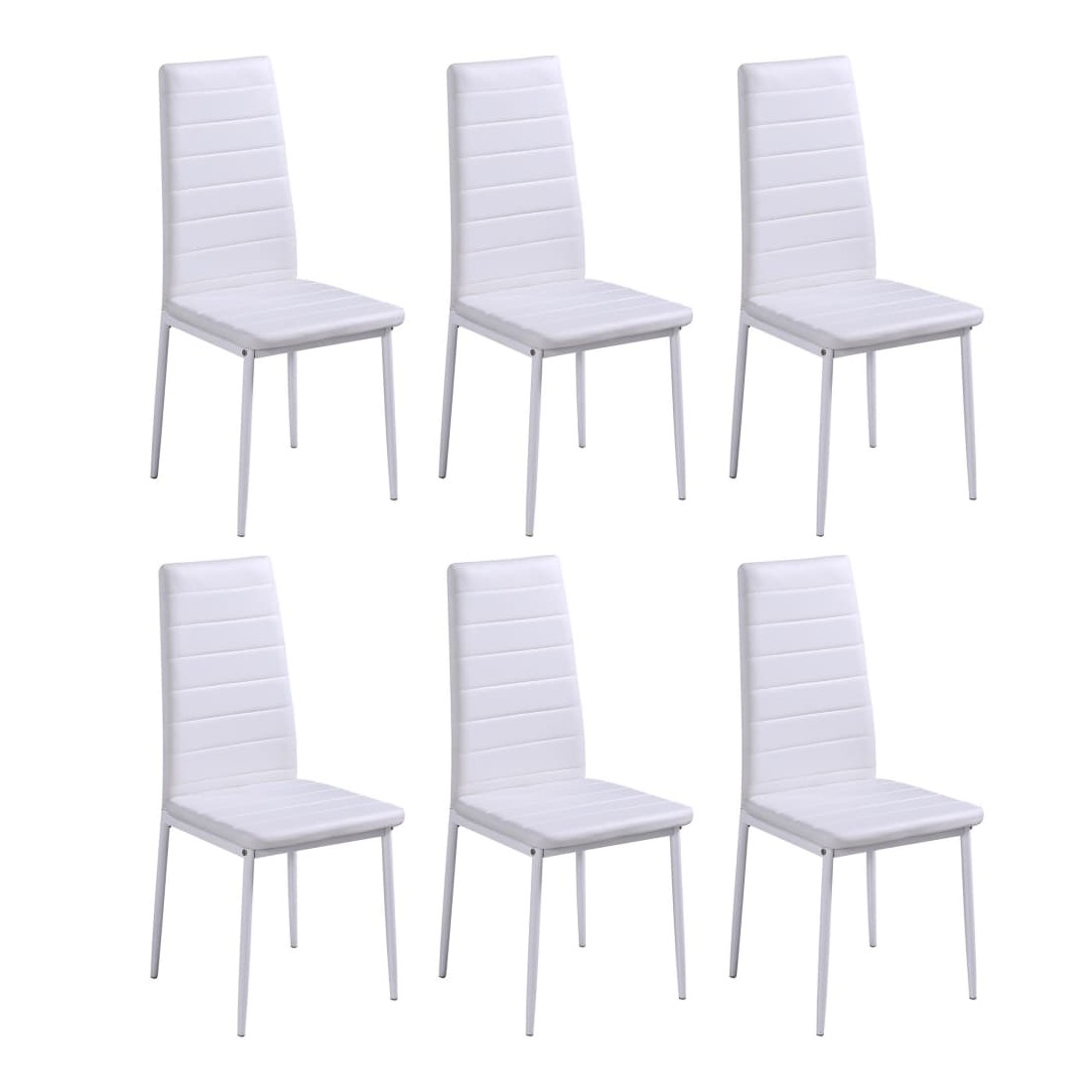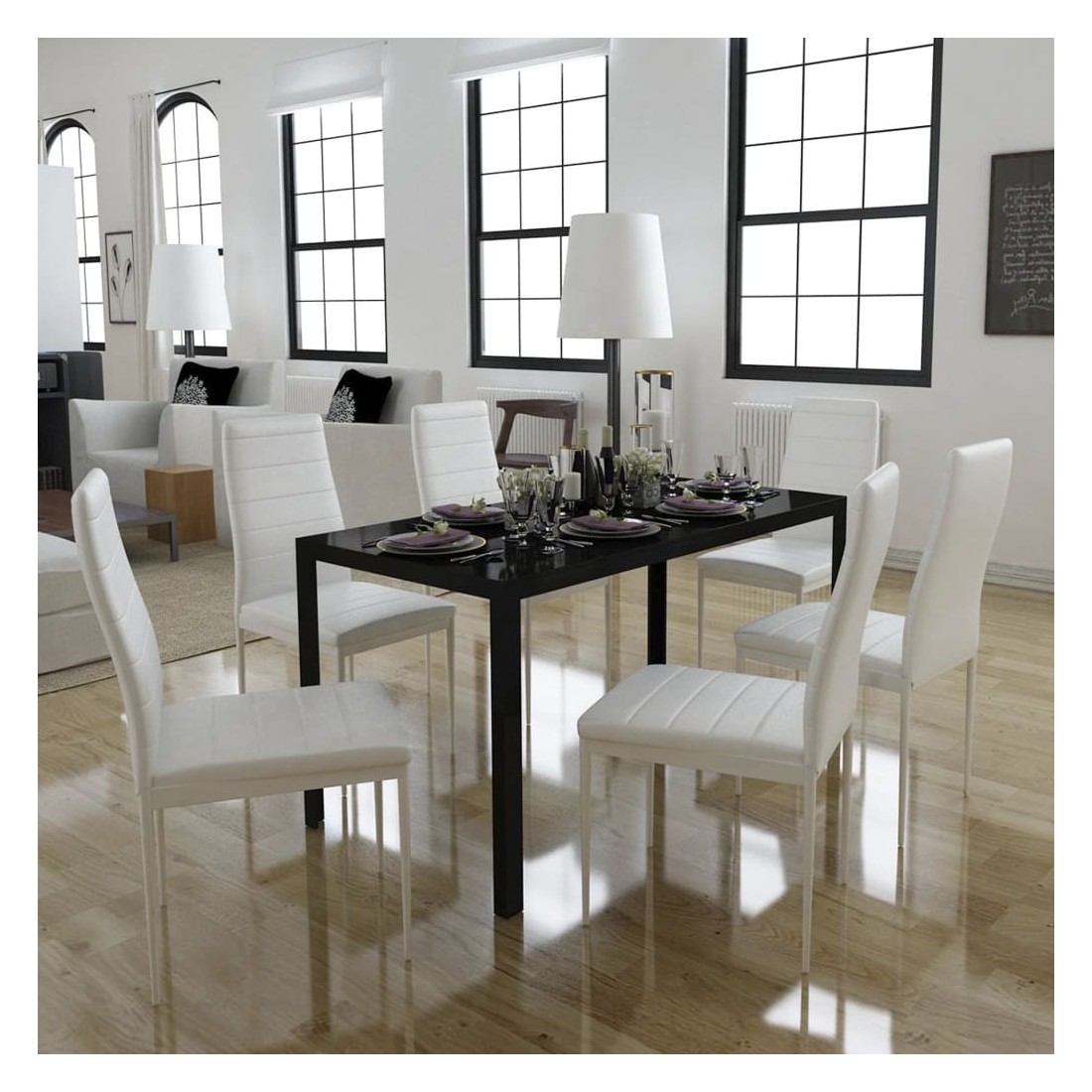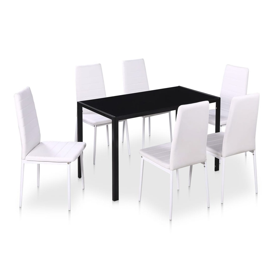 Cet ensemble de table à manger, composé de 7 pièces, a un design moderne et élégant et est parfait pour ceux qui cherchent à ajouter une touche de style à leur intérieur. Le dessus de table est en verre trempé très résistant et facile à nettoyer. Chaque chaise est recouverte de cuir artificiel de haute qualité. L'assise souple et rembourrée est très confortable. La livraison comprend 1 table et 6 chaises.