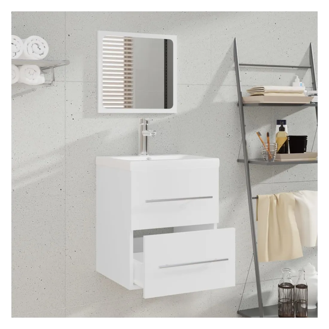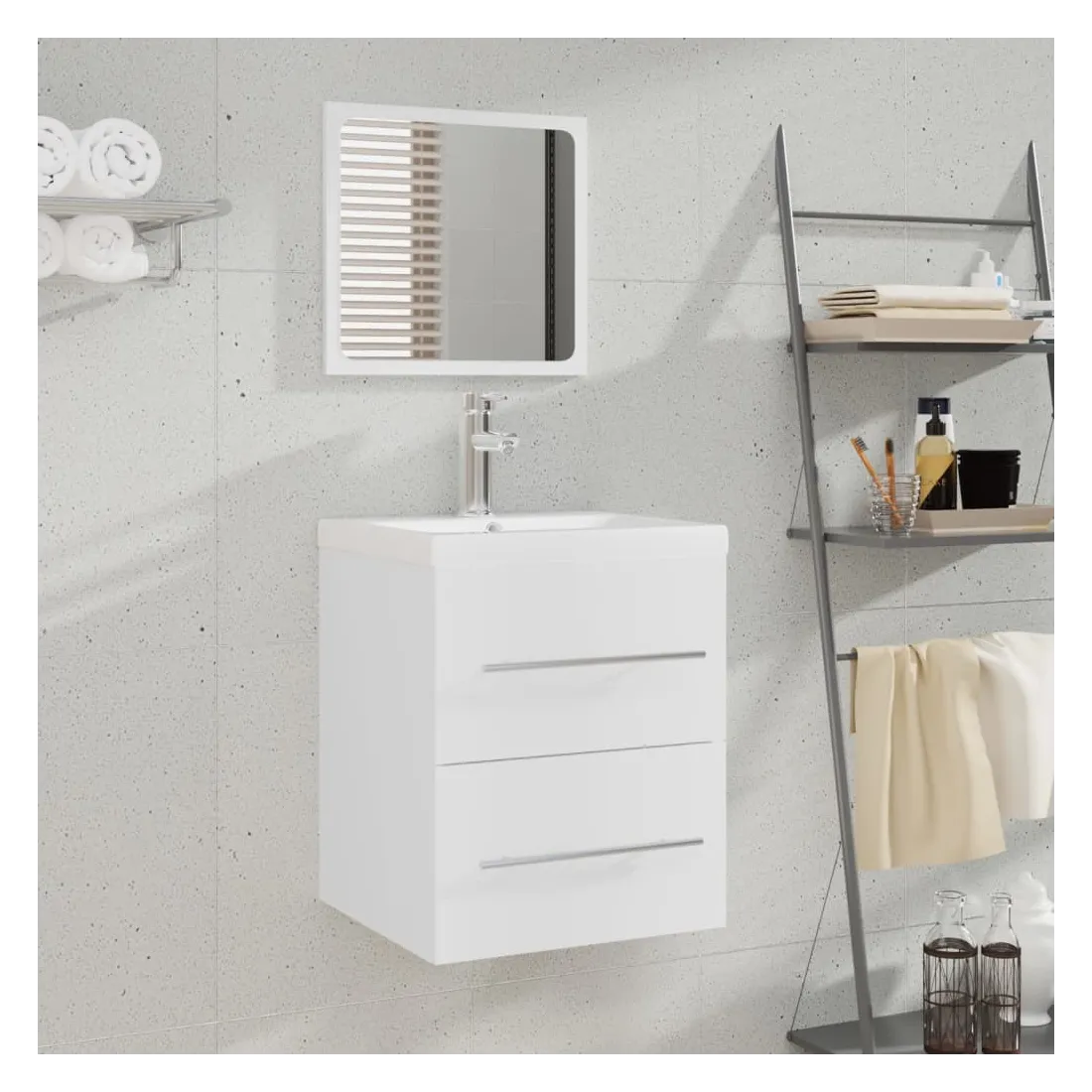 Ce meuble lavabo avec bassin intégré, doté d'un espace de rangement spacieux, est un supplément chic et intemporel à toute salle de bain ou salle d'eau. Matériau durable : le meuble sous évier est fabriqué en bois d'ingénierie, qui est d'une qualité exceptionnelle avec une surface lisse et se caractérise également par sa solidité, stabilité et résistance à l'humidité.Grand espace de rangement : le meuble lavabo de salle de bain dispose d'un tiroir, offrant un grand espace de rangement pour ranger des articles dans votre salle de bain.Design pratique : le dessus de ce meuble de salle de bain est idéal pour placer le lavabo.Fonction murale : l'armoire de salle de bain peut être fixée au mur pour ajouter de l'espace de stockage supplémentaire. De cette façon, vous pouvez maximiser votre espace au sol et garder la zone propre.Fonction de trop-plein : un trop-plein est également équipé pour vidanger l'eau lorsqu'il est trop plein. Remarque :Les vis et les chevilles pour l'intérieur du mur ne sont pas incluses. Recherchez et utilisez des vis et des chevilles adaptées à vos murs. Si vous n'êtes pas sûr, demandez conseil à un professionnel. Lisez et suivez attentivement chaque étape des instructions.Chaque produit est livré avec un manuel de montage dans la boîte pour un montage facile.