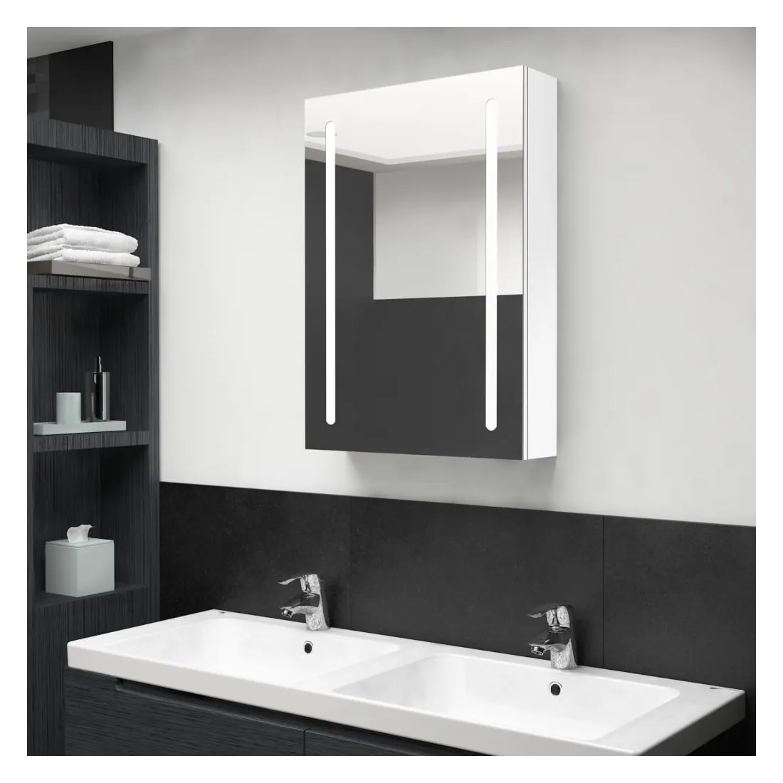 Introduisez une esthétique agréable dans votre salle de bain avec notre armoire à miroir de courtoisie LED ! Notre armoire murale à LED ajoute une touche de style contemporain et une lumière douce et éclairante à toute pièce ! Elle est faite de panneaux MDF de qualité avec une finition mélaminée, garantissant une utilisation à long terme. Grâce aux deux bandes lumineuses à LED écoénergétiques, vous pouvez vous voir sous la lumière la plus pure pour le maquillage, les soins de la peau et les soins de la peau. Elle illumine votre chambre, votre visage et votre sourire. À l’intérieur, vous trouverez 3 tablettes offrant un espace de rangement suffisant pour tous vos articles de toilette et accessoires de beauté. Vous pouvez facilement allumer/éteindre la lumière avec le bouton du bas. Élégant et fonctionnel, ce meuble saura sûrement rendre le design de votre pièce à l’origine exceptionnel ! L'armoire est facile à installer sur le mur. Remarque :Ce produit est doté d'un connecteur USB, mais la source d'alimentation certifiée de USB 5V n'est pas incluse.