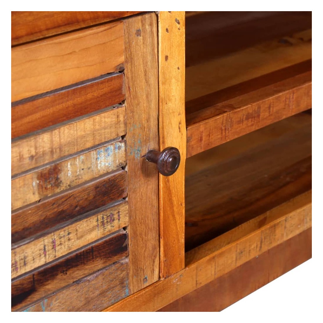 Ce meuble TV en bois au style antique est à la fois élégant et pratique grâce aux vastes espaces de rangement des tiroirs et des étagères. Il est sûrement un excellent supplément à votre salon ou à votre chambre à coucher. Ce meuble TV est fabriqué en bois de récupération, ce qui signifie que chaque meuble est unique et légèrement différent l'un de l'autre. Les meubles en bois de récupération ont les caractéristiques de différentes variétés de bois comme le teck, le bois de manguier, l'acacia, le bois recyclé, le bois dur, etc. Le bois de récupération est solide, stable, durable et beau. Les trous de clous ou les grains transparents apportent leurs histoires avec eux et invitent une autre génération afin de les inspirer par les leurs. En gardant ce meuble dans votre maison montrera vot