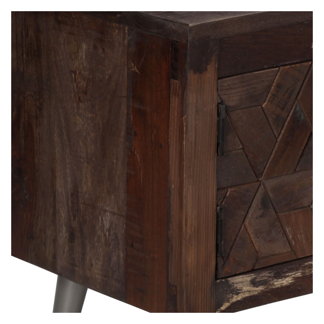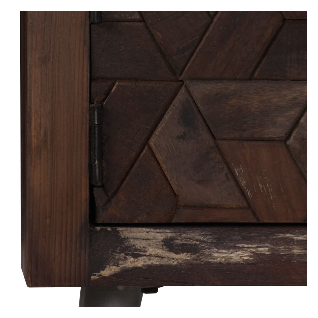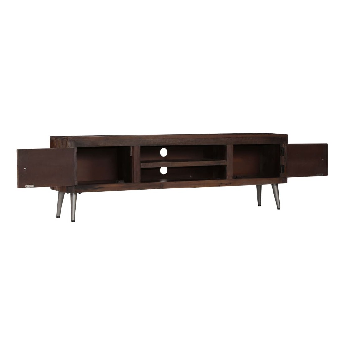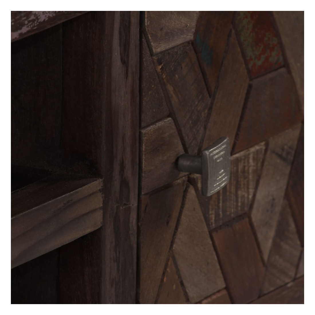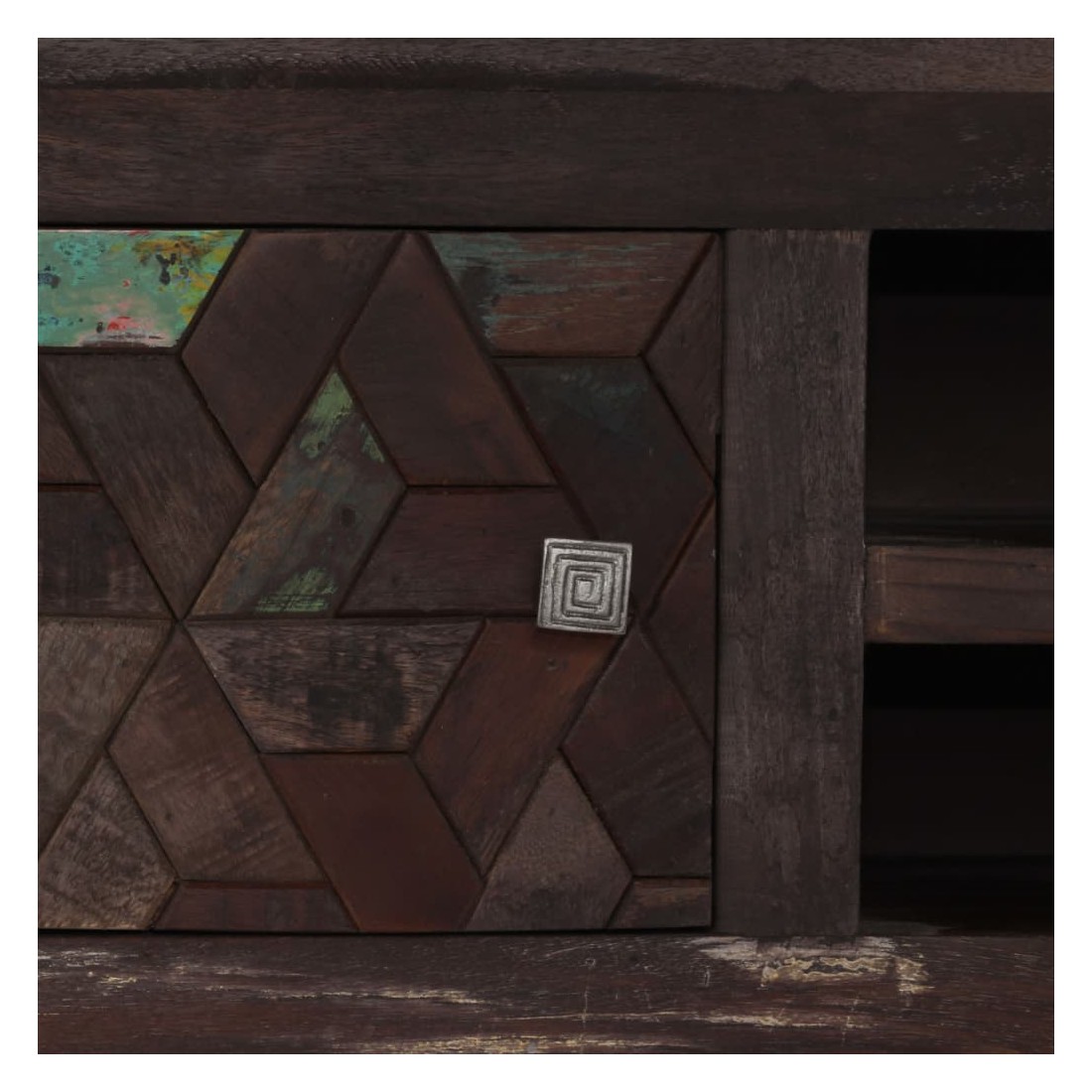 Ce meuble de télévision en bois solide apportera une touche décorative et pratique à votre salon. Il pourrait également être utilisé comme armoire latérale ou buffet. L'armoire est faite de bois de récupération massif provenant de solives, de planchers et de poutres de soutien de vieux bâtiments démolis et peut être composée de différents types de bois comme pin, teck, hêtre, chêne, cèdre, bois de manguier, acacia, etc. Cela signifie que le bois de récupération conserve les caractéristiques de ces différents types de bois. Le bois de récupération est déjà vieilli, patiné et séché, donc il ne rétrécit pas et ne se plie pas. Les belles veines de bois rendent chaque meuble unique et légèrement différent l'un de l'autre. Les signes d'usure et la structure du grain visible témoignent de la