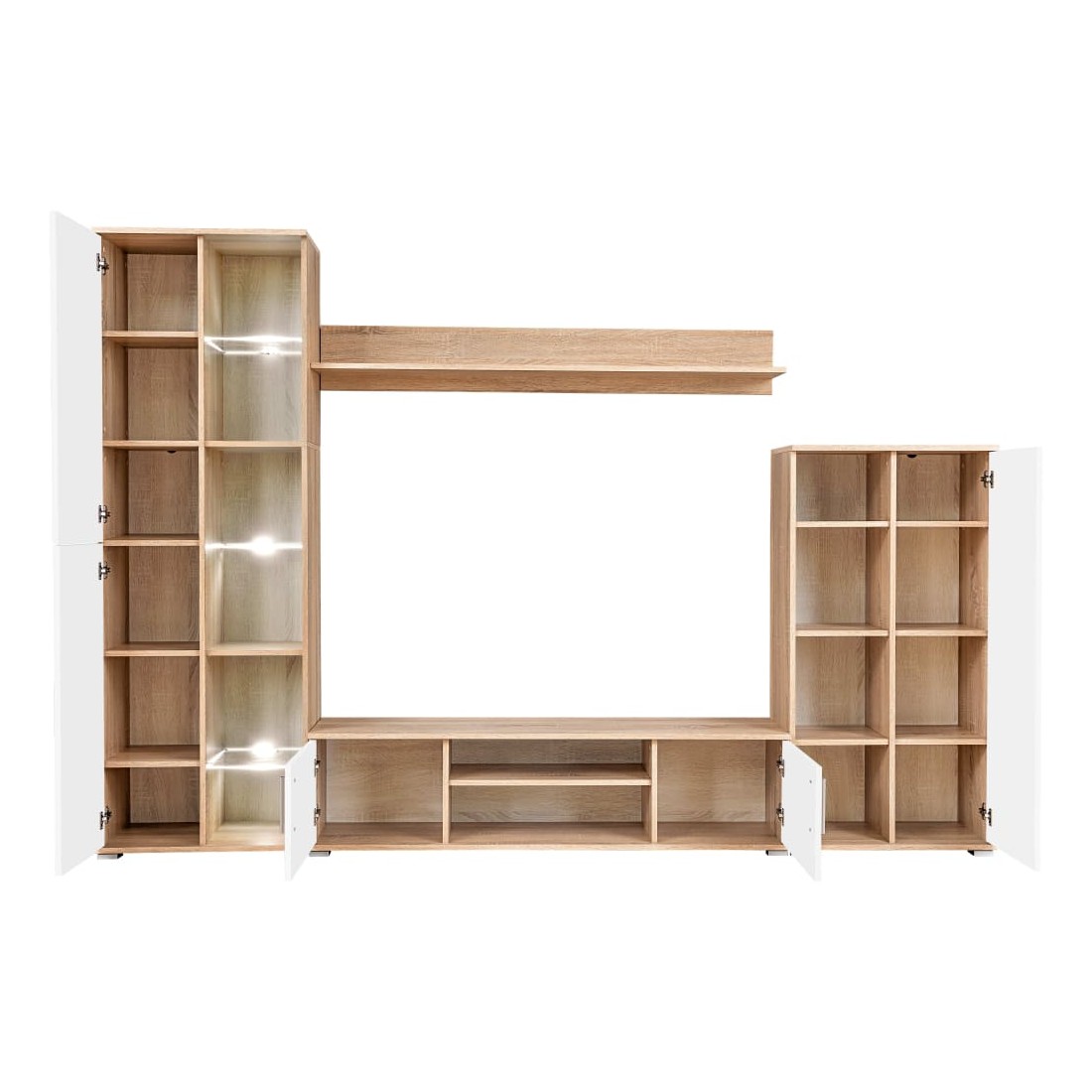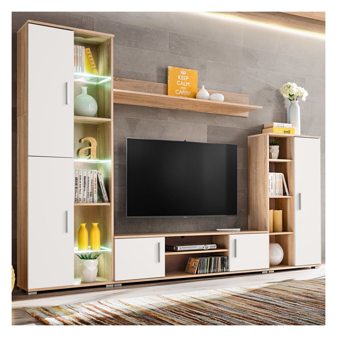 Cette unité murale s'intégrera parfaitement dans votre salon en optimisant votre espace sans compromettre le style. L'unité murale, composée de deux armoires latérales de tailles différentes, d'un meuble TV et d'une étagère de présentation, offre suffisamment d'espace pour ranger vos appareils multimédia, lecteur DVD, supports multimédia, livres et toutes sortes de petits objets. Elle sera également idéale pour exposer des objets décoratifs, des cadres photo ou même des plantes en pot. L'armoire de gauche comporte trois étagères en verre avec un éclairage LED blanc à faible consommation d'énergie pour créer une atmosphère séduisante. Notre vitrine murale est faite de bois d'ingénierie de haute qualité et a des poignées et des pieds en métal, ce qui lui donne un aspect contemporain qui s'adapte à tous les décors. L'assemblage est facile.