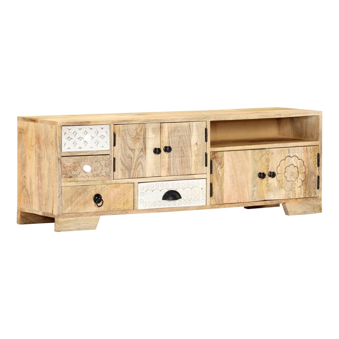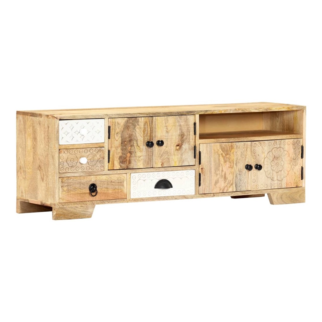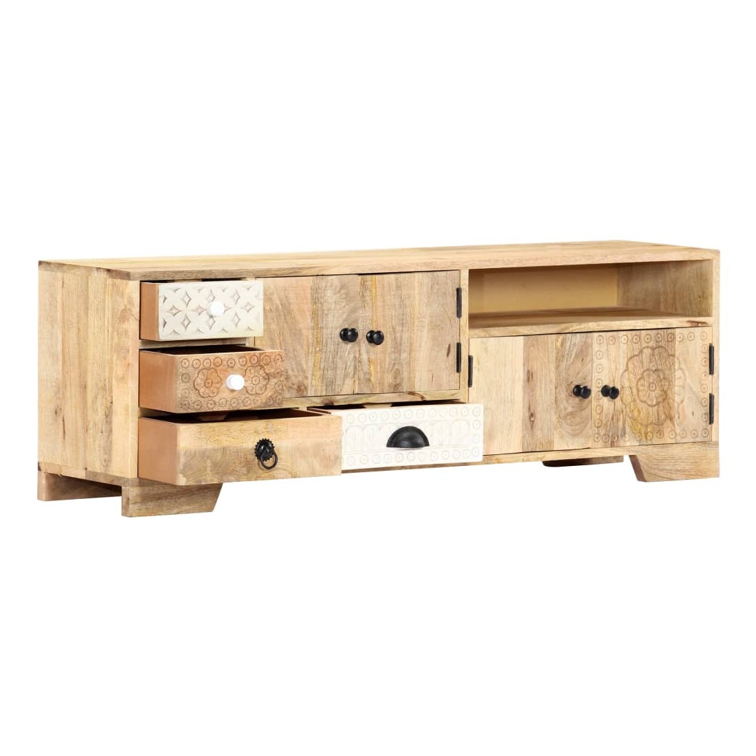 Si vous souhaitez apporter une touche de charme rustique à votre décoration d'intérieur, notre meuble TV en bois massif sera pour vous. Équipé de 4 tiroirs, de 2 compartiments avec portes et d'un compartiment pour divers articles, ce meuble TV sera définitivement un supplément pratique et accrocheur dans votre maison. Fabriquée en bois de manguier massif avec une finition naturelle, cette armoire HiFi dégage un look original. Le savoir-faire exquis et les magnifiques grains de bois de manguier rendent chaque meuble unique et légèrement différent l'un de l'autre. De plus, les motifs sculptés décoratifs et les poignées en métal ajoutent à la beauté du buffet. Remarque importante : les variations de couleur et de grain du bois rendent chacune de nos armoires à plasma unique et légèrement différente l'une de l'autre. La livraison est aléatoire, ce qui garantit l'exclusivité et l'individualité de votre produit.