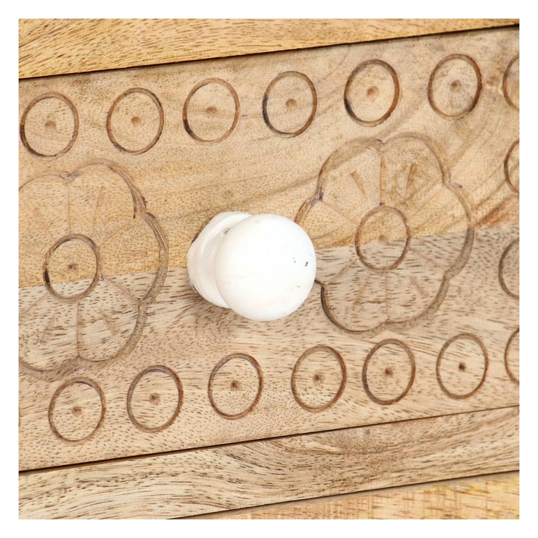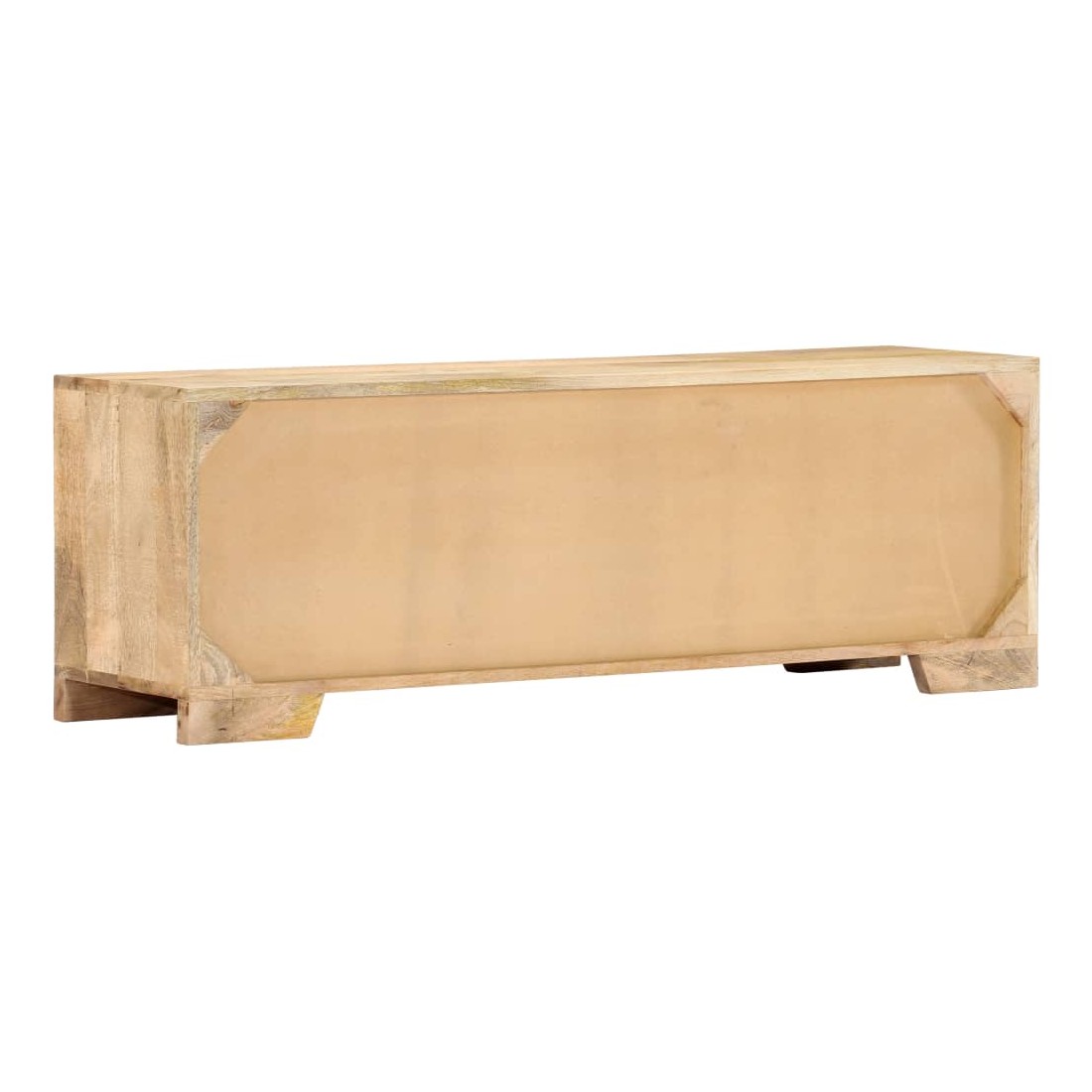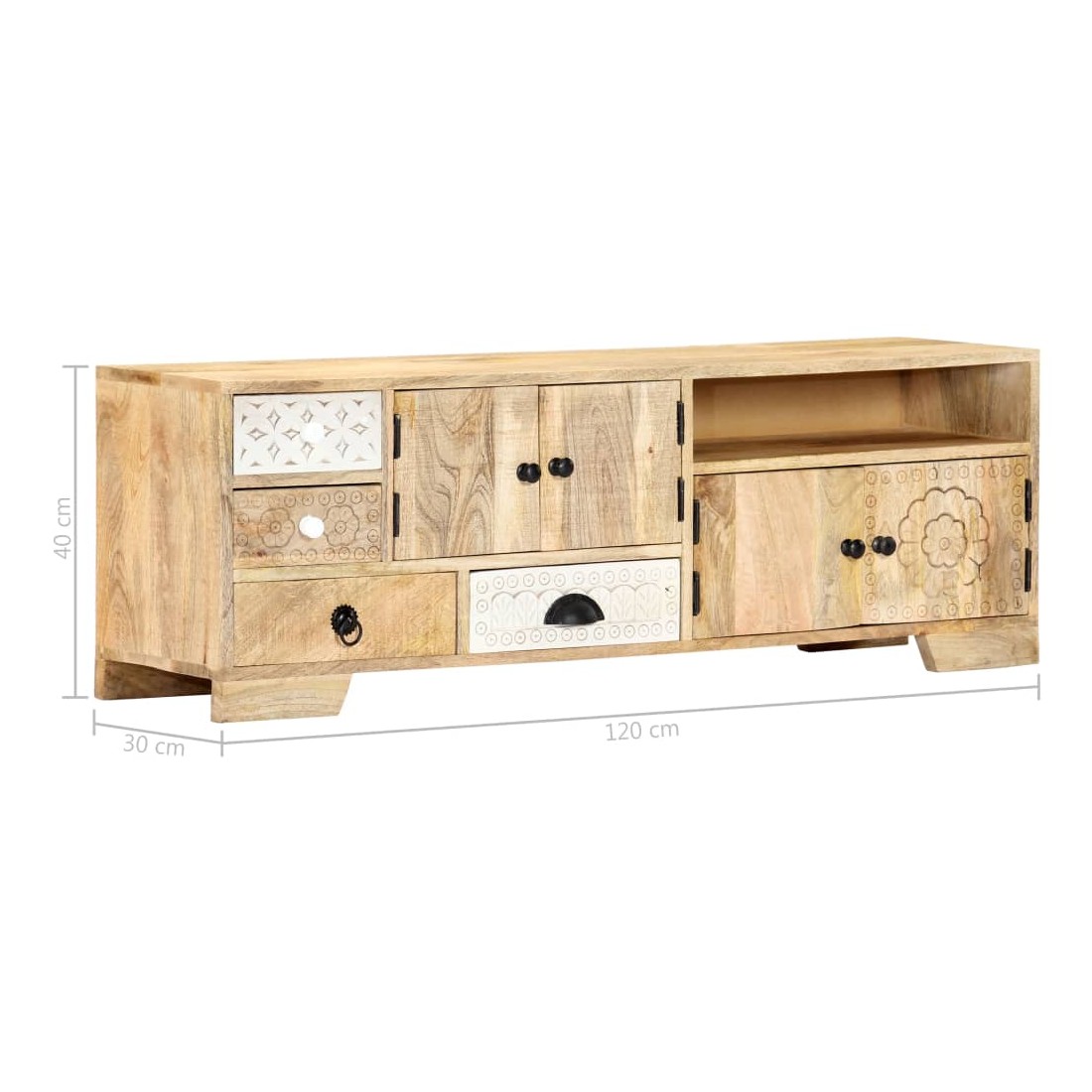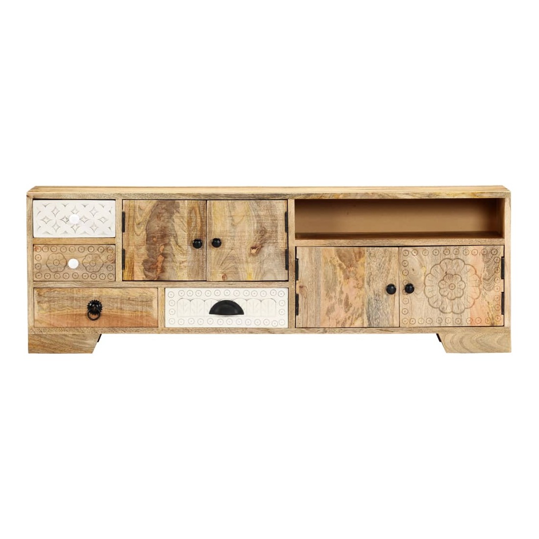 Si vous souhaitez apporter une touche de charme rustique à votre décoration d'intérieur, notre meuble TV en bois massif sera pour vous. Équipé de 4 tiroirs, de 2 compartiments avec portes et d'un compartiment pour divers articles, ce meuble TV sera définitivement un supplément pratique et accrocheur dans votre maison. Fabriquée en bois de manguier massif avec une finition naturelle, cette armoire HiFi dégage un look original. Le savoir-faire exquis et les magnifiques grains de bois de manguier rendent chaque meuble unique et légèrement différent l'un de l'autre. De plus, les motifs sculptés décoratifs et les poignées en métal ajoutent à la beauté du buffet. Remarque importante : les variations de couleur et de grain du bois rendent chacune de nos armoires à plasma unique et légèrement différente l'une de l'autre. La livraison est aléatoire, ce qui garantit l'exclusivité et l'individualité de votre produit.