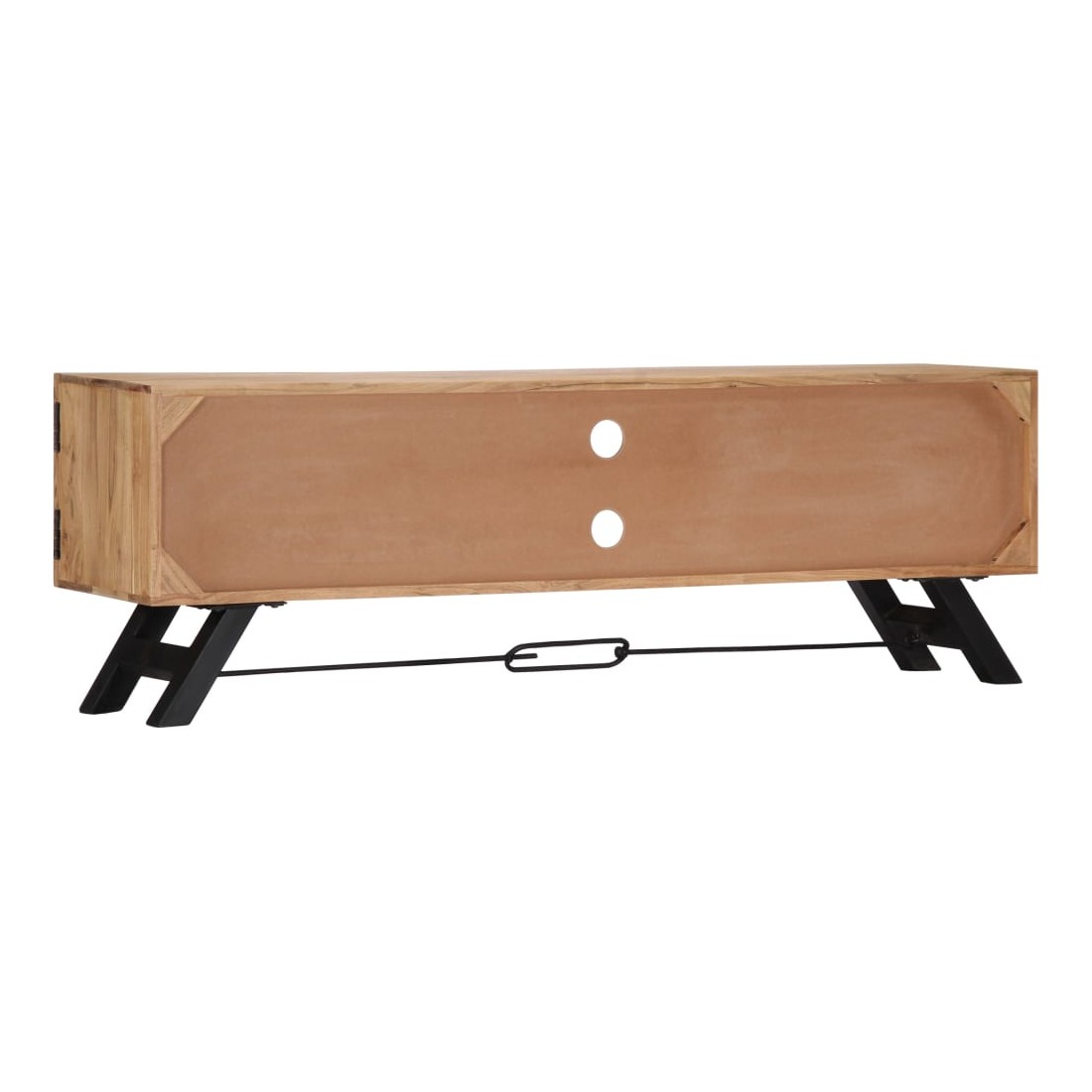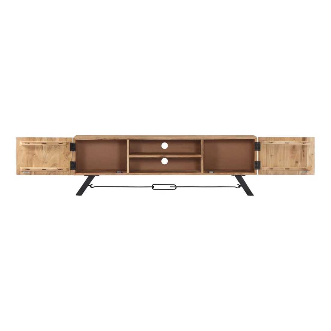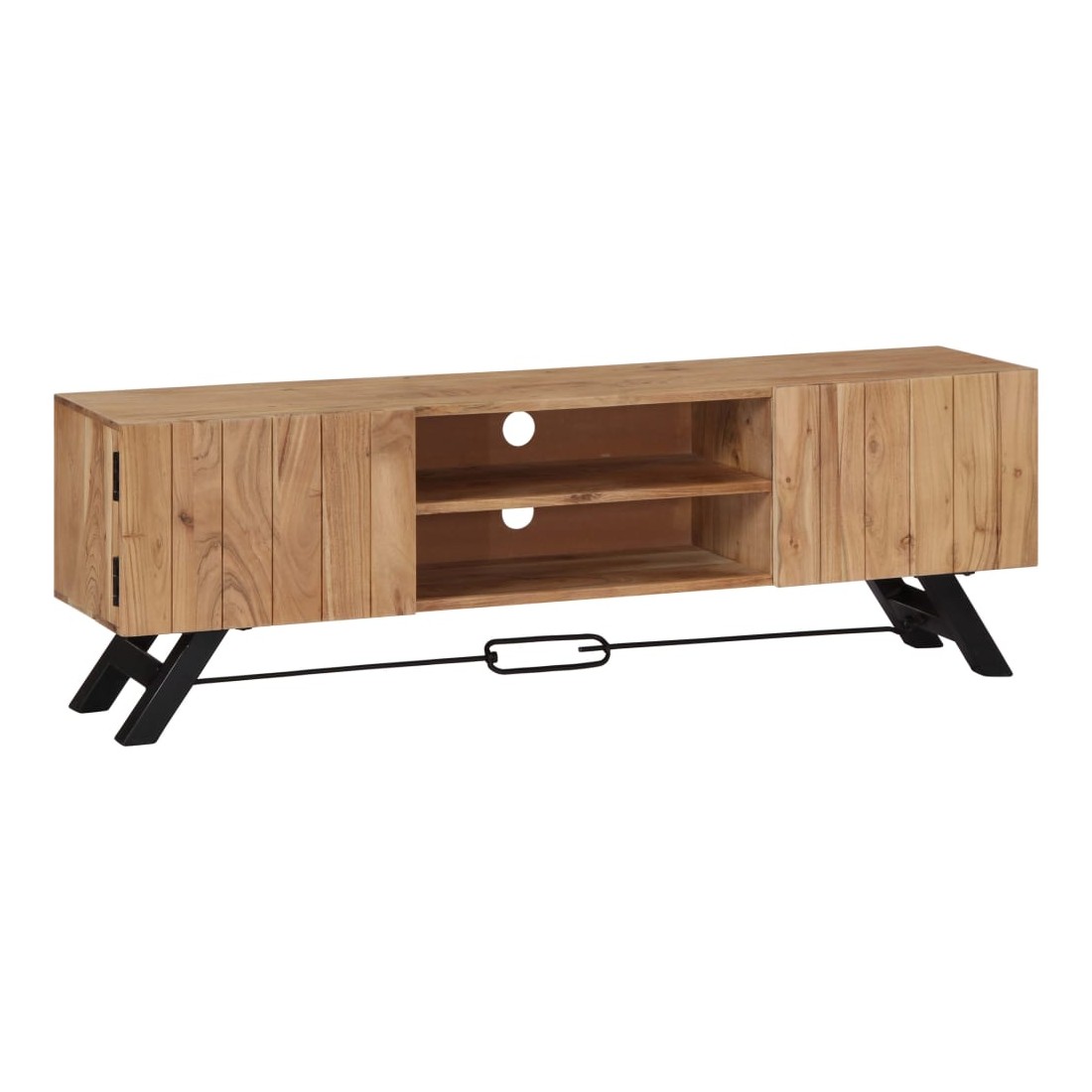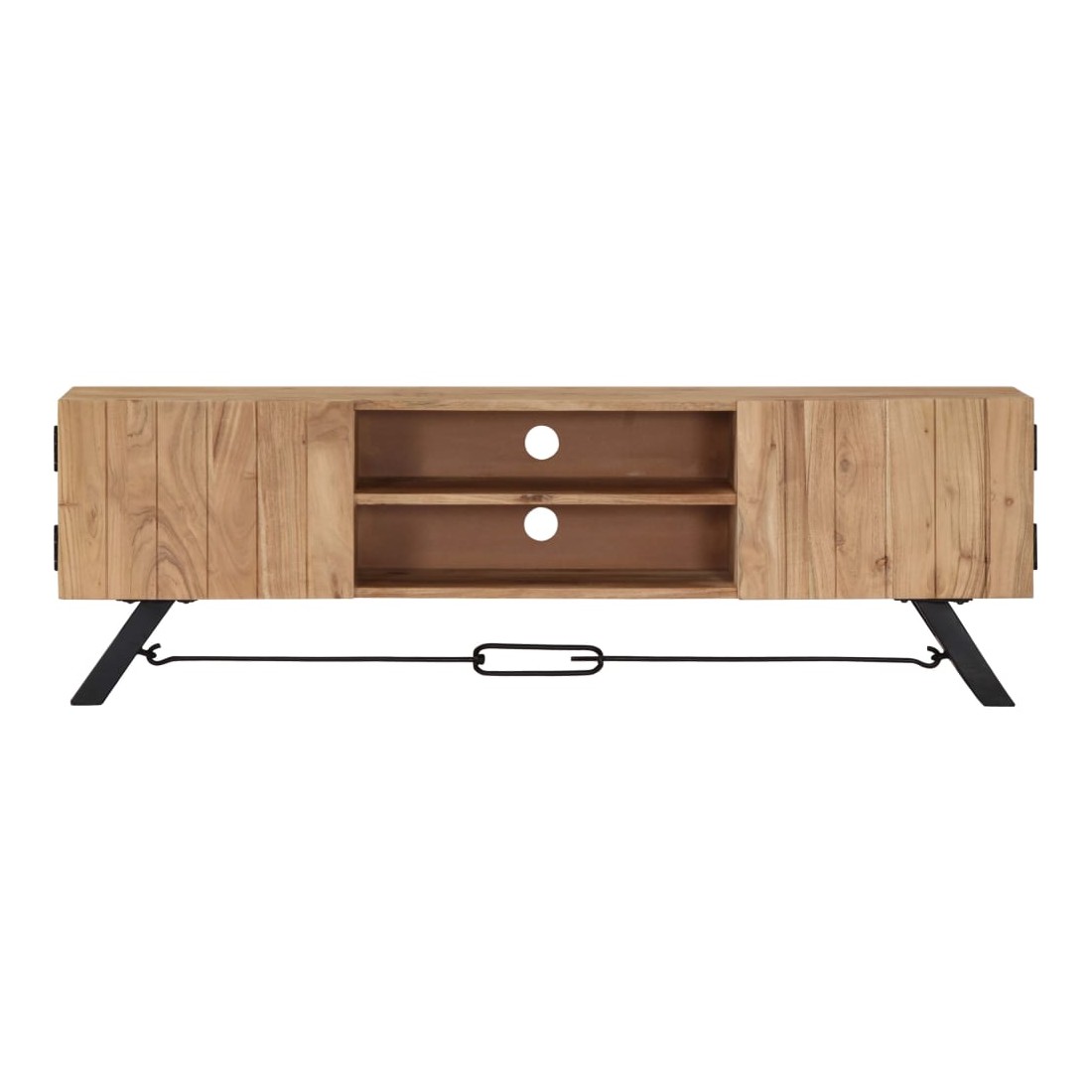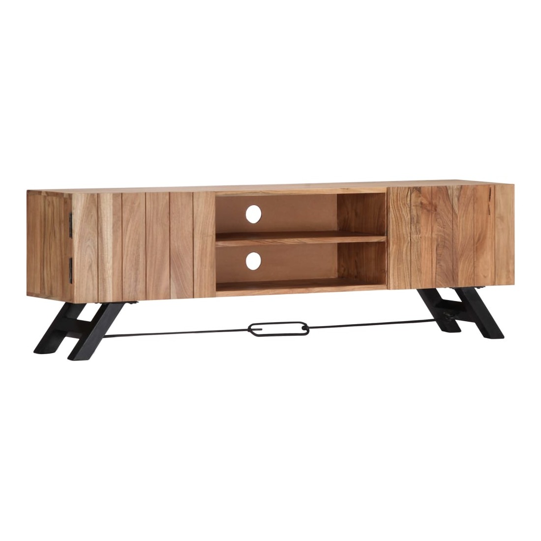 Ce meuble TV dégage un charme rustique. Il constituera un supplément à la fois pratique et attrayant à votre intérieur. Le buffet est en bois massif d'acacia qui a reçu une finition pour lui donner un bel aspect. En conséquence, ce buffet bas au design soigné est extrêmement stable, durable et esthétique. De plus, cette armoire en bois est entièrement fabriquée à la main et les gracieux grains de bois permettent à chaque meuble de se distinguer et de se différencier légèrement l'un de l'autre. Cette armoire HiFi comporte 2 compartiments et 2 armoires avec portes, offrant un espace confortable pour ranger vos appareils multimédia, livres, chaussures, ainsi que divers autres articles. Remarque importante : les grains de bois varient d'une pièce à l'autre, rendant chaque pièce unique. La livraison est aléatoire, ce qui garantit l'exclusivité et l'individualité de votre produit.
