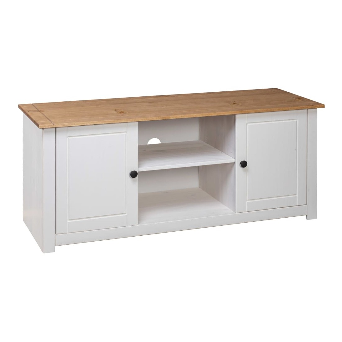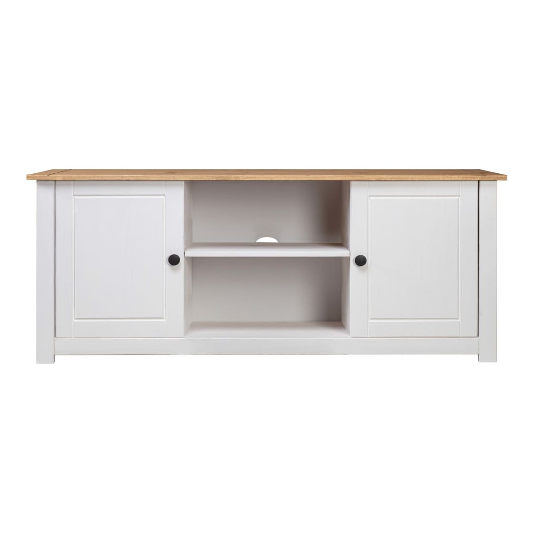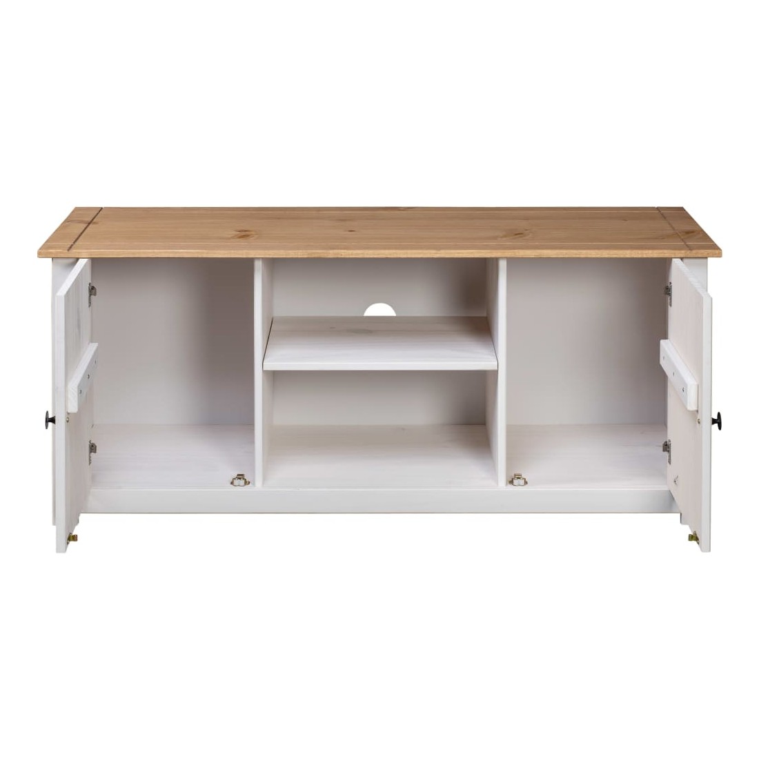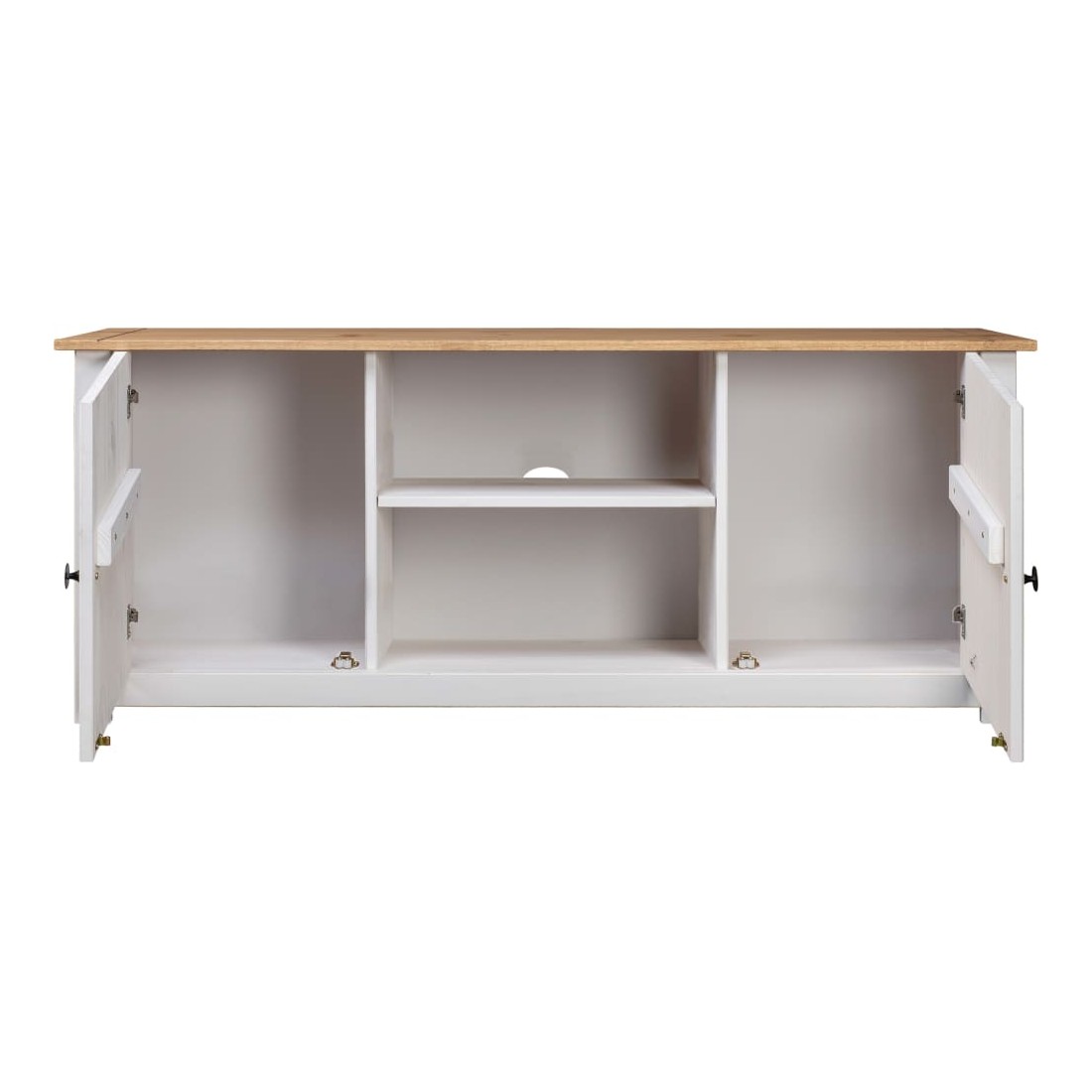Ce meuble TV en bois saisissant présente un design rustique et rétro qui deviendra le point central de votre salon ! Fabriqué en bois de pin massif, ce meuble TV est extrêmement robuste et durable. Son design élégant fera de la planche basse un élément décoratif convivial et extraordinairement décoratif pour votre maison. Le meuble stéréo a 2 portes et 2 compartiments, offrant un grand espace pour ranger toutes sortes d’objets plus petits comme des clés, des bloc-notes, des stylos, ainsi que d’autres bibelots organisés et à portée de main. En outre, le grand plateau est idéal pour placer votre téléviseur, votre routeur, vos appareils multimédia ou pour afficher des objets décoratifs. Le meuble HiFi est facile à assembler.