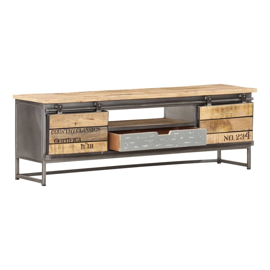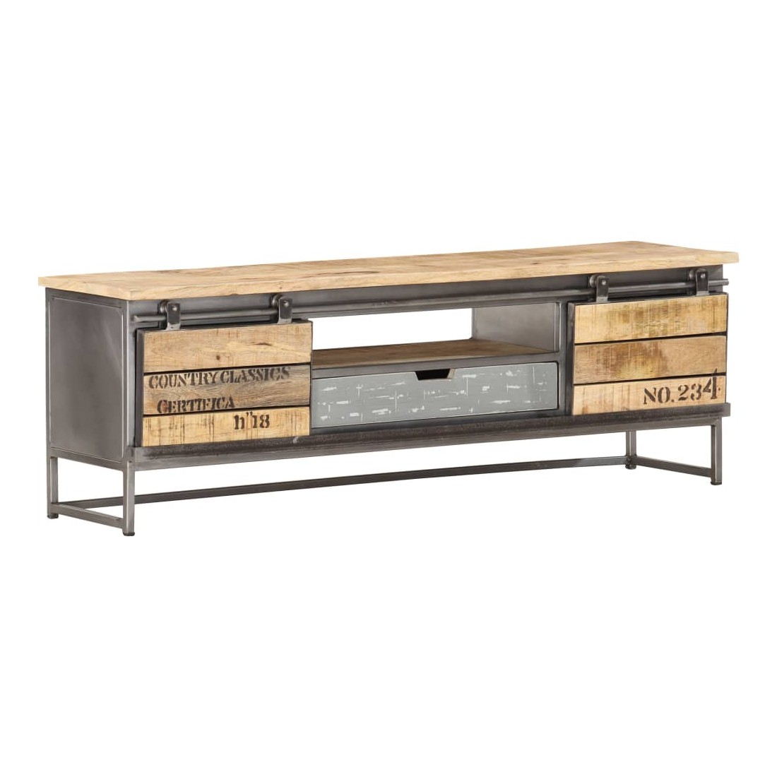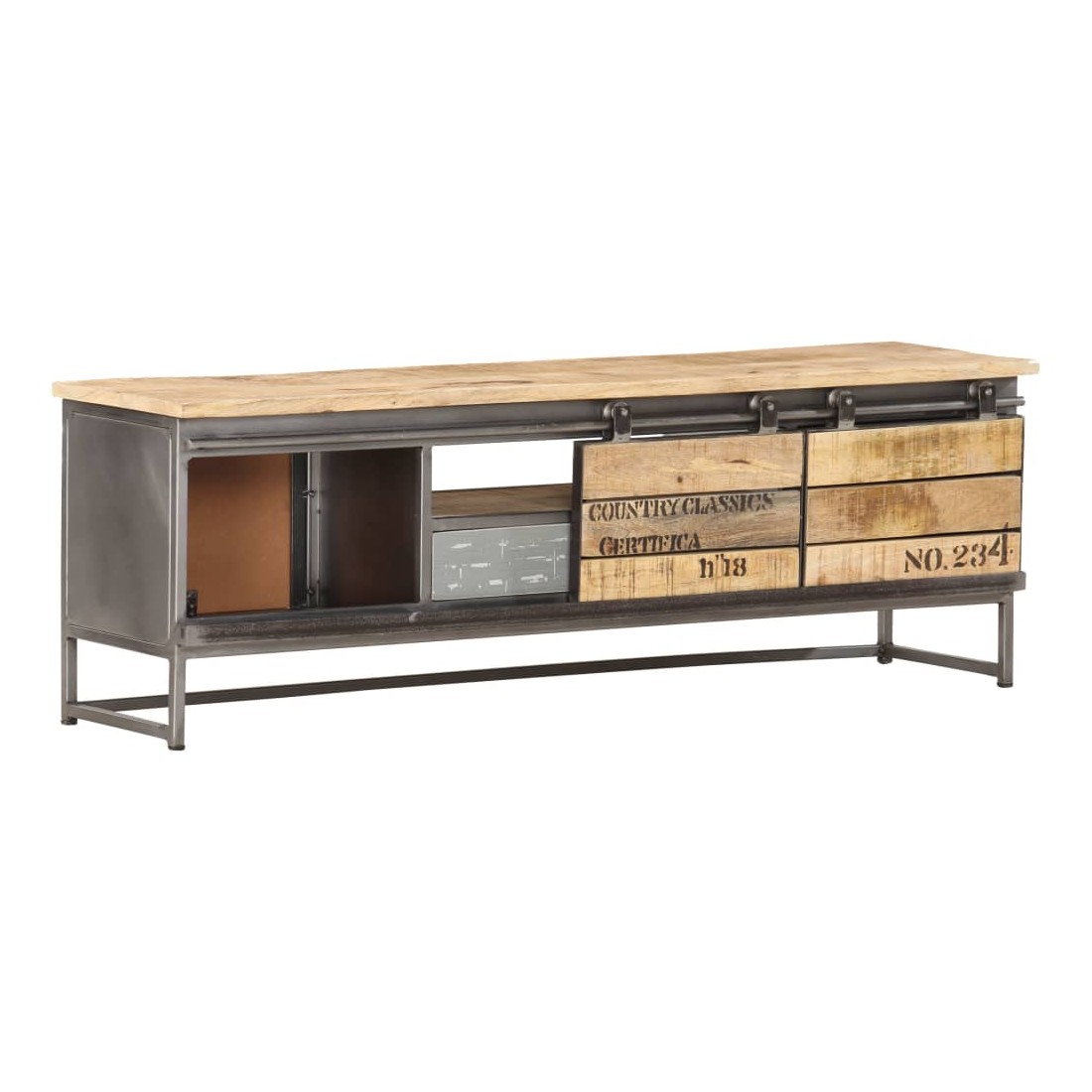Ce meuble de télévision combine un design moderne du milieu du siècle avec un style industriel et sera un excellent supplément à votre intérieur. Le meuble est en bois massif de manguier qui a reçu une belle finition par polissage et laquage pour lui donner un aspect raffiné. Les beaux grains de bois rendent chaque meuble unique et légèrement différent l'un de l'autre. Ce meuble TV a une surface solide et stable sur laquelle vous pouvez placer votre téléviseur, une corbeille de fruits, un vase ou d’autres objets de décoration. Cette armoire comprend 2 portes et 1 tiroir, offrant un grand espace pour ranger vos appareils multimédia, vos livres et divers autres objets. Le cadre en acier ajoute à la robustesse et à la stabilité du meuble ainsi qu'à son charme industriel. Le meuble TV est