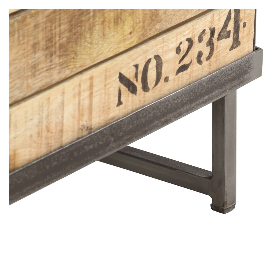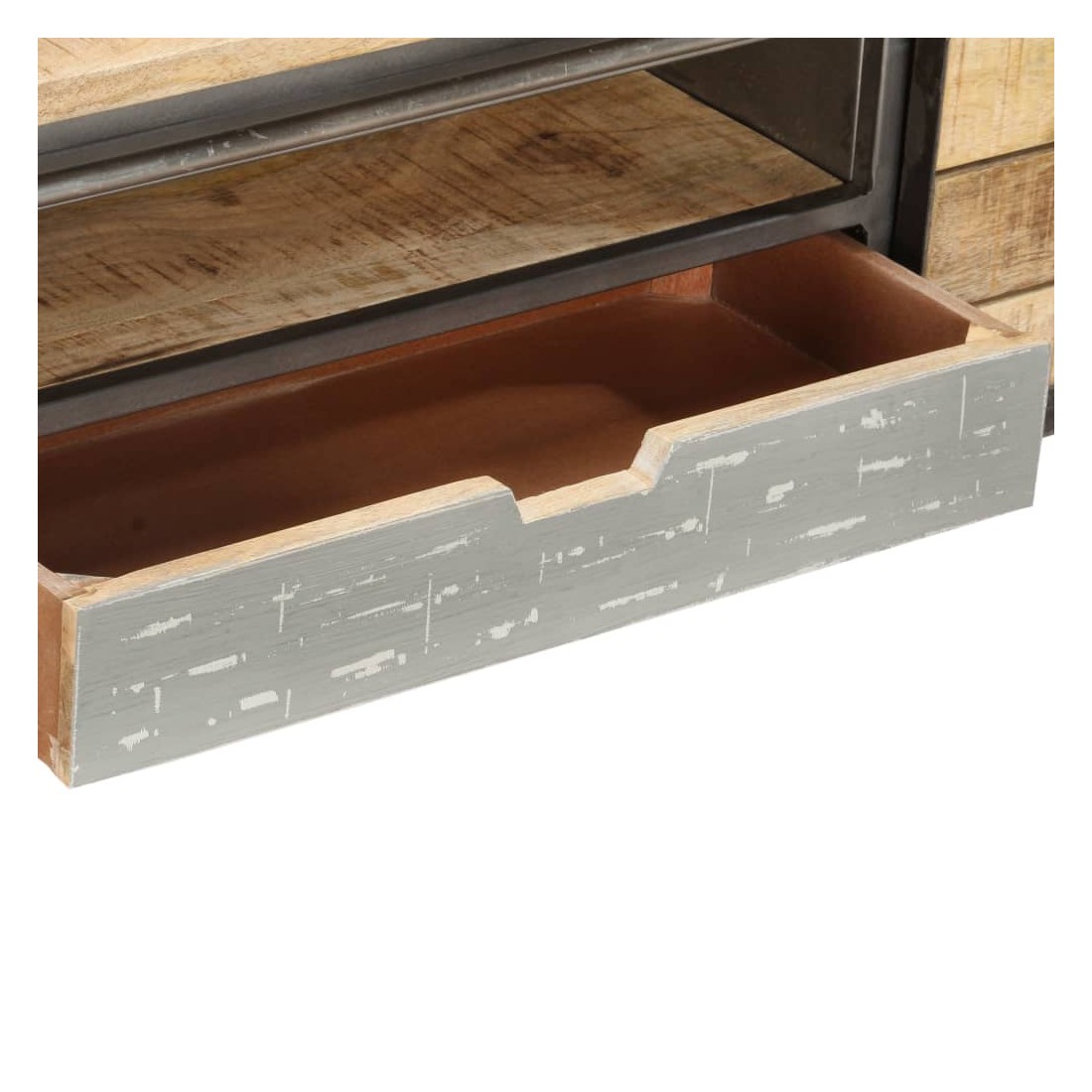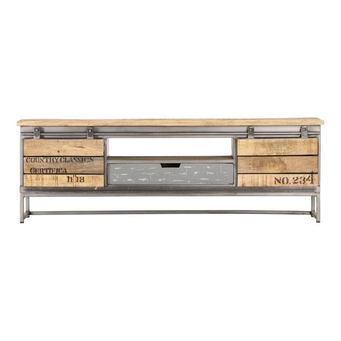 Ce meuble de télévision combine un design moderne du milieu du siècle avec un style industriel et sera un excellent supplément à votre intérieur. Le meuble est en bois massif de manguier qui a reçu une belle finition par polissage et laquage pour lui donner un aspect raffiné. Les beaux grains de bois rendent chaque meuble unique et légèrement différent l'un de l'autre. Ce meuble TV a une surface solide et stable sur laquelle vous pouvez placer votre téléviseur, une corbeille de fruits, un vase ou d’autres objets de décoration. Cette armoire comprend 2 portes et 1 tiroir, offrant un grand espace pour ranger vos appareils multimédia, vos livres et divers autres objets. Le cadre en acier ajoute à la robustesse et à la stabilité du meuble ainsi qu'à son charme industriel. Le meuble TV est
