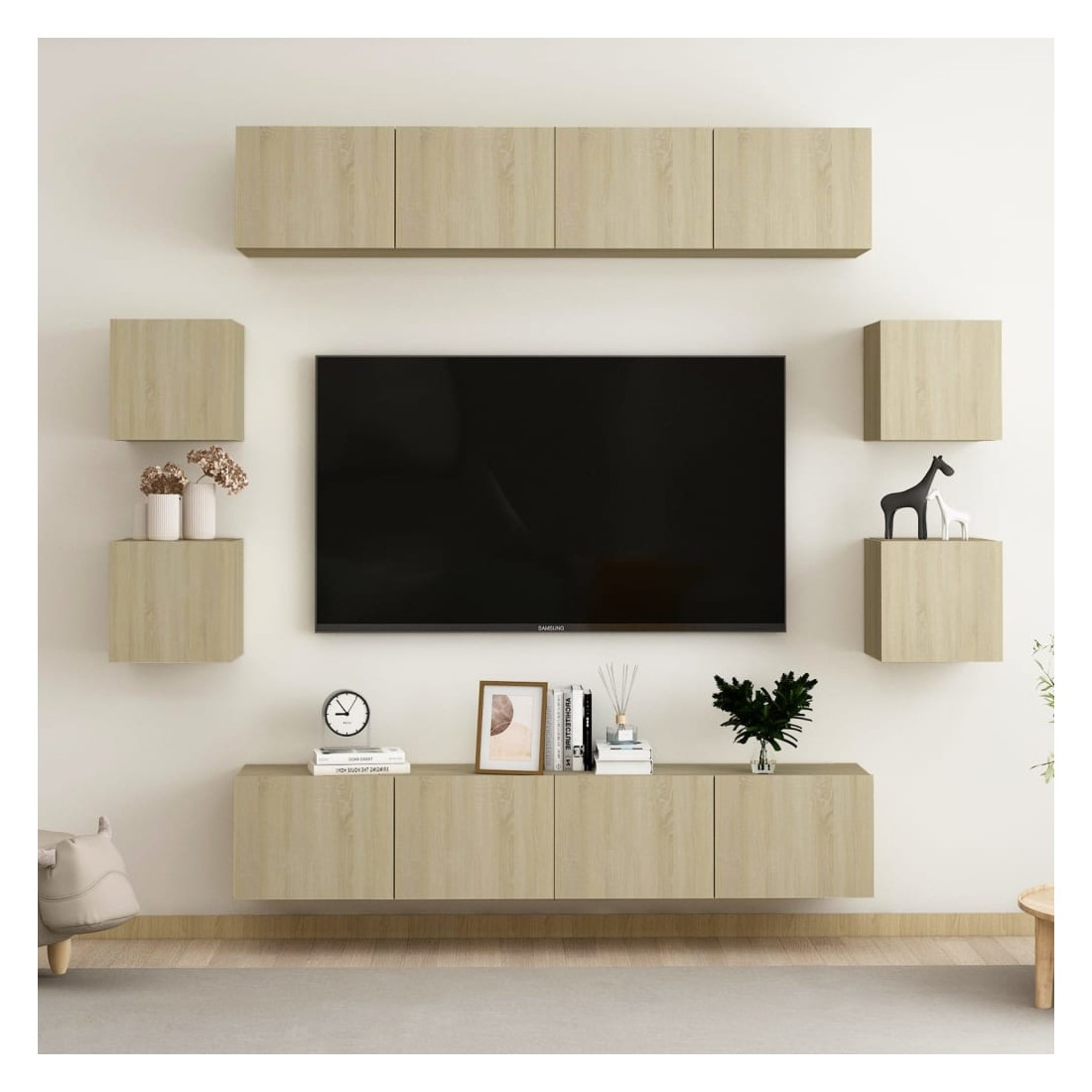 Cet ensemble de meuble TV robuste est destiné à être le point de mire de votre pièce avec un design à la fois tendance et pratique. Le meuble TV est fixé au mur, ce qui en fait un supplément intemporel à votre maison. Il offre de nombreux compartiments de rangement, ce qui en fait un endroit idéal pour stocker tous vos livres, magazines, DVD ou autres objets. Le meuble stéréo est facile à entretenir et à nettoyer avec un chiffon humide.