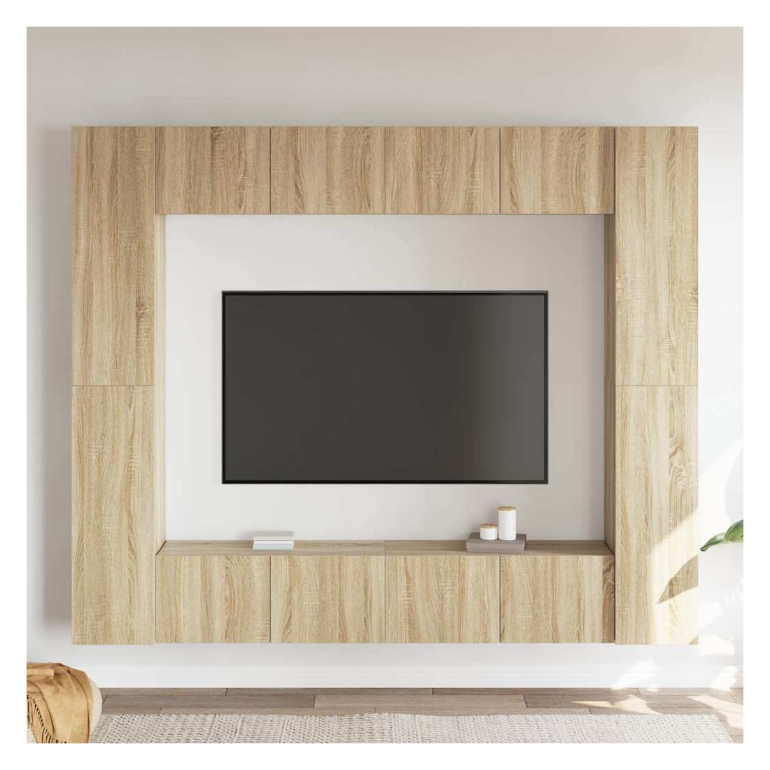 Cet ensemble de meuble TV robuste est destiné à être le point de mire de votre pièce avec un design à la fois tendance et pratique. Le meuble TV est fixé au mur, ce qui en fait un supplément intemporel à votre maison. Il offre de nombreux compartiments de rangement, ce qui en fait un endroit idéal pour stocker tous vos livres, magazines, DVD ou autres objets. Le meuble stéréo est facile à entretenir et à nettoyer avec un chiffon humide.