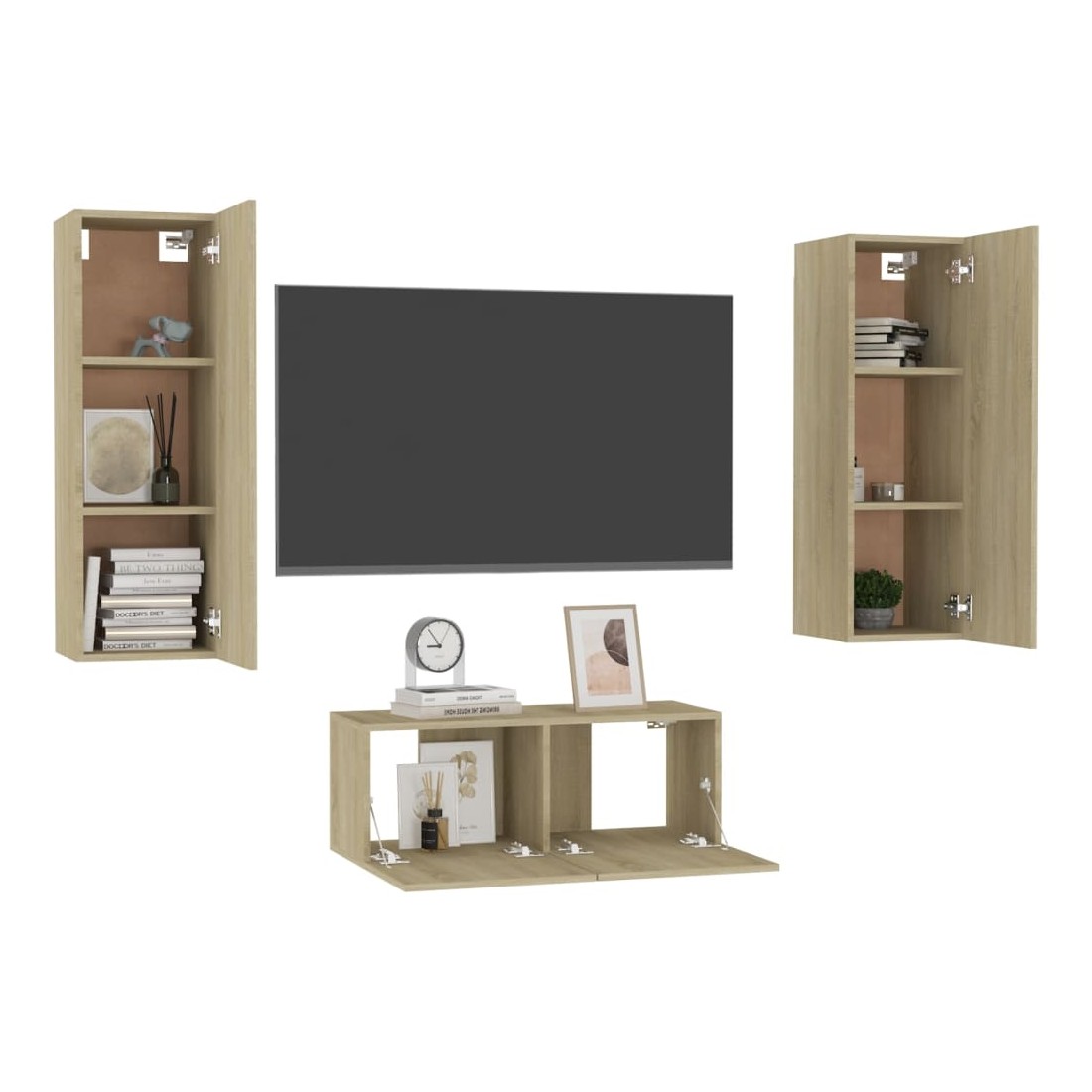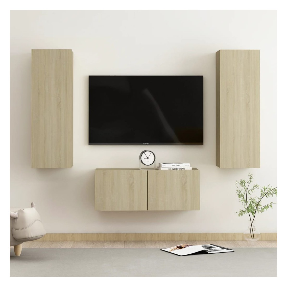 Cet ensemble de meuble TV robuste est destiné à être le point de mire de votre pièce avec un design à la fois tendance et pratique. Le meuble TV est fixé au mur, ce qui en fait un supplément intemporel à votre maison. Il offre de nombreux compartiments de rangement, ce qui en fait un endroit idéal pour stocker tous vos livres, magazines, DVD ou autres objets. Le meuble stéréo est facile à entretenir et à nettoyer avec un chiffon humide.