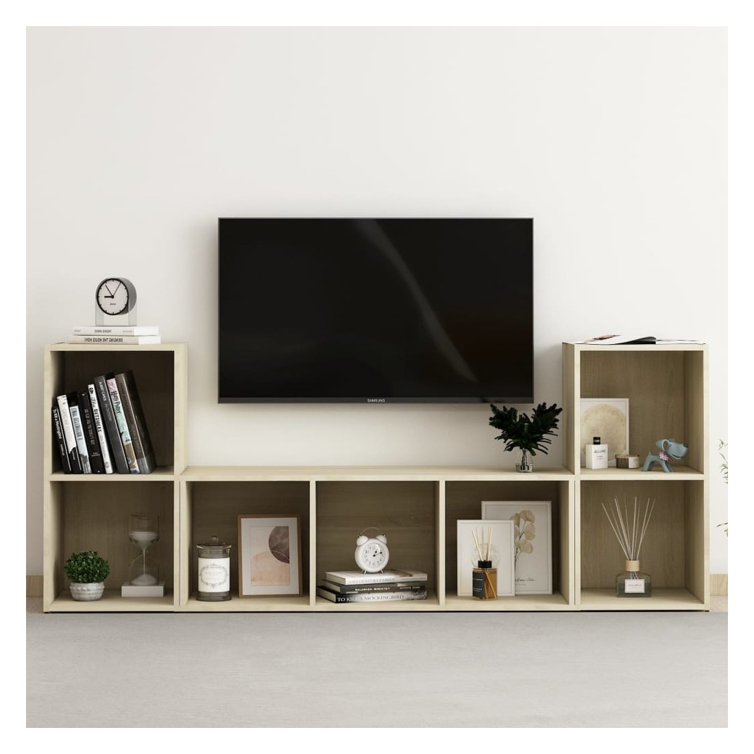 Cet ensemble de meuble TV classique est certainement conçu pour être un point de mire de votre pièce avec un design tendance mais pratique. Cet ensemble de meuble TV est équipé d'un grand espace de rangement pour garder vos magazines, livres, DVD et appareils multimédia bien organisés et à portée de main. Chaque meuble TV peut être placé horizontalement ou verticalement, ce qui en fait un complément parfait à votre espace de vie actuel. De plus, l'ensemble de meuble HiFi est facile à nettoyer avec un chiffon humide.