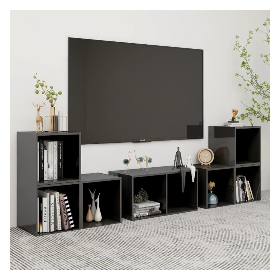 Cet ensemble de meuble TV classique est certainement conçu pour être un point de mire de votre pièce avec un design tendance mais pratique. Cet ensemble de meuble TV est équipé d'un grand espace de rangement pour garder vos magazines, livres, DVD et appareils multimédia bien organisés et à portée de main. Chaque meuble TV peut être placé horizontalement ou verticalement, ce qui en fait un complément parfait à votre espace de vie actuel. De plus, l'ensemble de meuble HiFi est facile à nettoyer avec un chiffon humide.