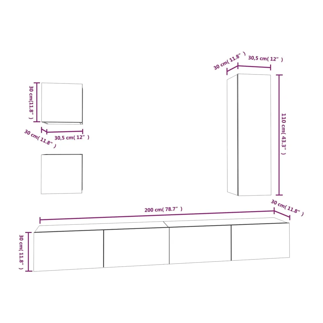 • 1 x meuble TV : 30,5 x 30 x 110 cm (L x l x H)