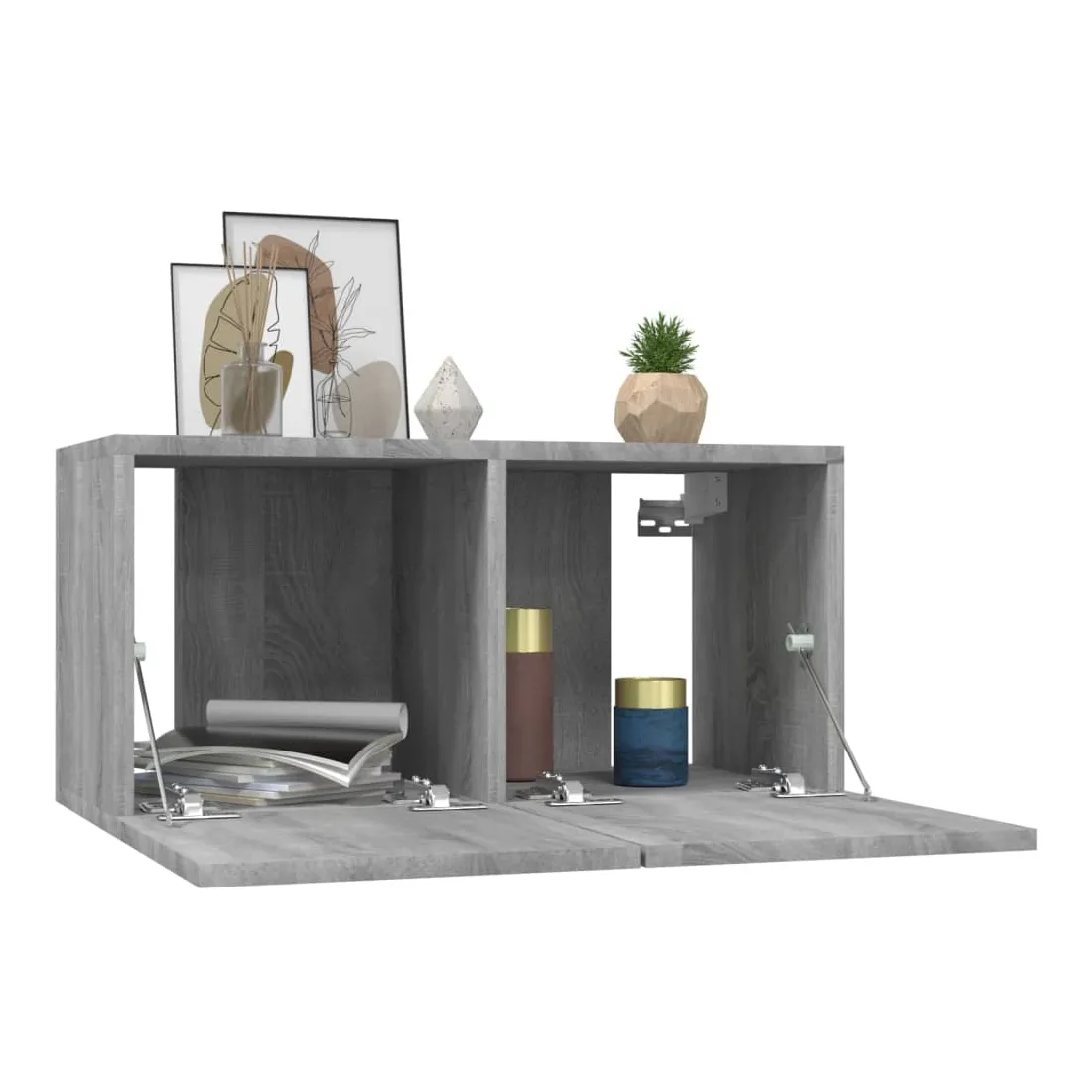 Ces meubles TV muraux présentent un design élégant et classique. Ils peuvent être facilement fixés au mur, ce qui en fait une extension décorative et pratique de votre décor. Bois d'ingénierie robuste : le bois d'ingénierie est d'une qualité exceptionnelle avec une surface lisse et présente également résistance, stabilité et résistance à l'humidité. Fabriqués en bois d'ingénierie, ces meubles TV sont faciles à nettoyer.Grand espace de rangement : chaque support TV dispose de 2 compartiments qui en font un endroit idéal pour ranger tous vos magazines, DVD ou autres objets.Design mural : ces meubles TV peuvent être fixés au mur pour ajouter de l'espace de stockage supplémentaire. De cette façon, vous pouvez maximiser votre espace au sol et garder la zone propre.Portes pratiques : les portes de l'armoire média gardent votre espace sans encombrement en cachant de petits articles essentiels derrière les portes. De plus, la porte présente un design rabattable, ce qui facilite l'obtention d'articles. Remarque :Les vis et les chevilles pour l'intérieur du mur ne sont pas incluses. Recherchez et utilisez des vis et des chevilles adaptées à vos murs. Si vous n'êtes pas sûr, demandez conseil à un professionnel. Lisez et suivez attentivement chaque étape des instructions.Chaque produit est livré avec un manuel de montage dans la boîte pour un montage facile.