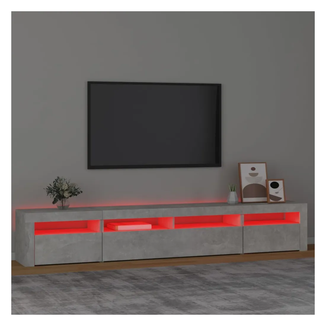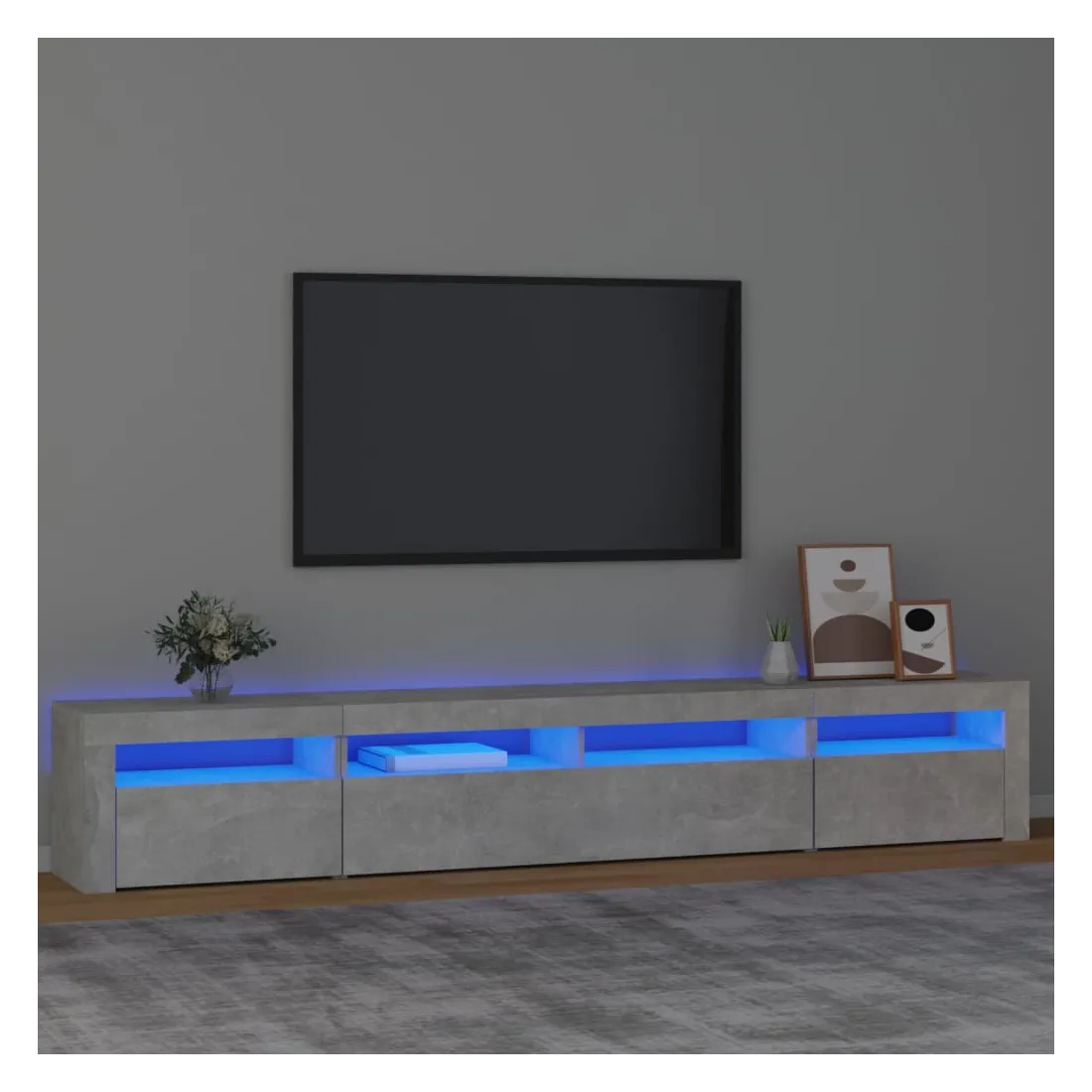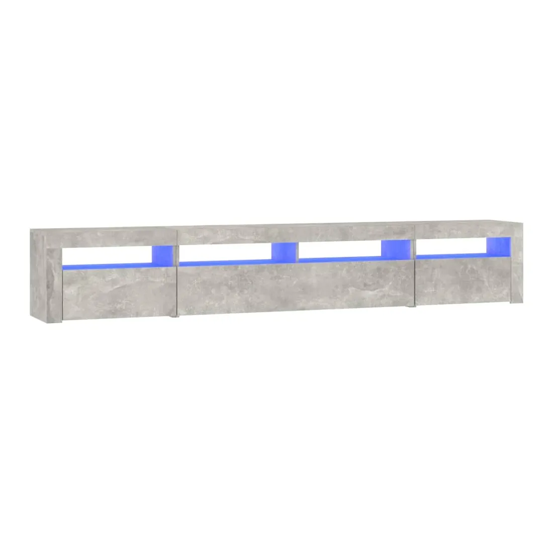 Avec un design à la fois tendance et pratique, ce meuble TV avec éclairage LED deviendra certainement un point central de votre pièce. Matériau pratique : le bois d'ingénierie est d'une qualité exceptionnelle avec une surface lisse et présente également résistance, stabilité et résistance à l'humidité.Lumières LED colorées : le meuble TV est doté de lumières LED RVB, qui ont différents menus pour changer la couleur des lumières et laisser la couleur s'ajuster automatiquement. Les lumières LED soulignent l'aspect moderne et contribuent à la sensation de tendance.Grand espace de rangement : le meuble TV offre un grand espace de rangement pour garder vos magazines, livres, télécommandes et autres petits objets bien organisés et à portée de main.Fonction d'affichage : le dessus robuste du meuble média est idéal pour exposer des objets décoratifs, des cadres photo et des plantes en pot. Remarque :Ce produit est doté d'un connecteur USB, mais la source d'alimentation certifiée de USB 5V n'est pas incluse.Chaque produit est livré avec un manuel de montage dans la boîte pour un montage facile.