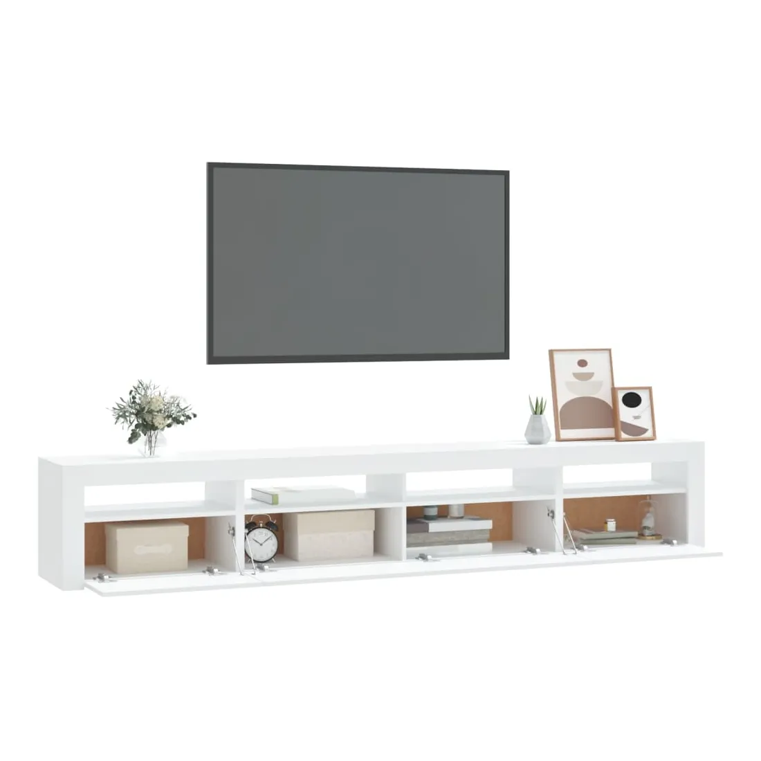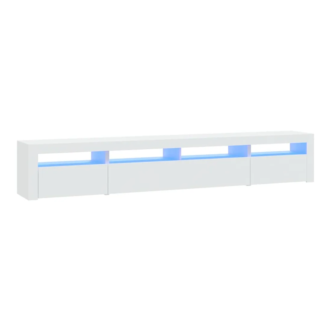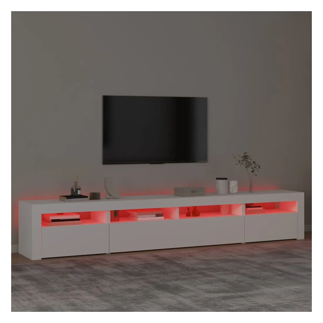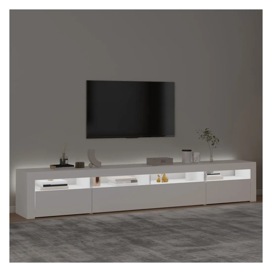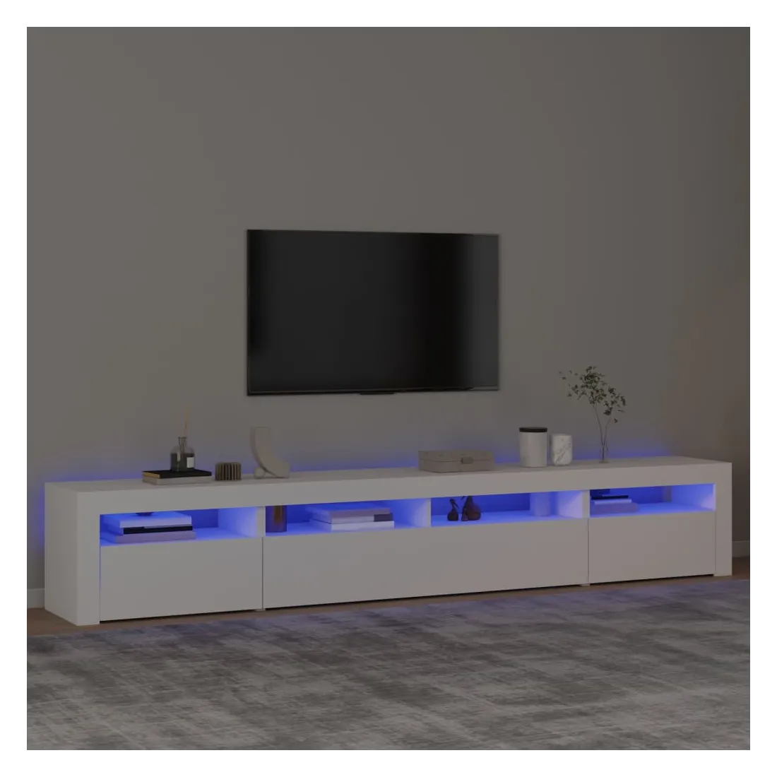 Avec un design à la fois tendance et pratique, ce meuble TV avec éclairage LED deviendra certainement un point central de votre pièce. Matériau pratique : le bois d'ingénierie est d'une qualité exceptionnelle avec une surface lisse et présente également résistance, stabilité et résistance à l'humidité.Lumières LED colorées : le meuble TV est doté de lumières LED RVB, qui ont différents menus pour changer la couleur des lumières et laisser la couleur s'ajuster automatiquement. Les lumières LED soulignent l'aspect moderne et contribuent à la sensation de tendance.Grand espace de rangement : le meuble TV offre un grand espace de rangement pour garder vos magazines, livres, télécommandes et autres petits objets bien organisés et à portée de main.Fonction d'affichage : le dessus robuste du meuble média est idéal pour exposer des objets décoratifs, des cadres photo et des plantes en pot. Remarque :Ce produit est doté d'un connecteur USB, mais la source d'alimentation certifiée de USB 5V n'est pas incluse.Chaque produit est livré avec un manuel de montage dans la boîte pour un montage facile.