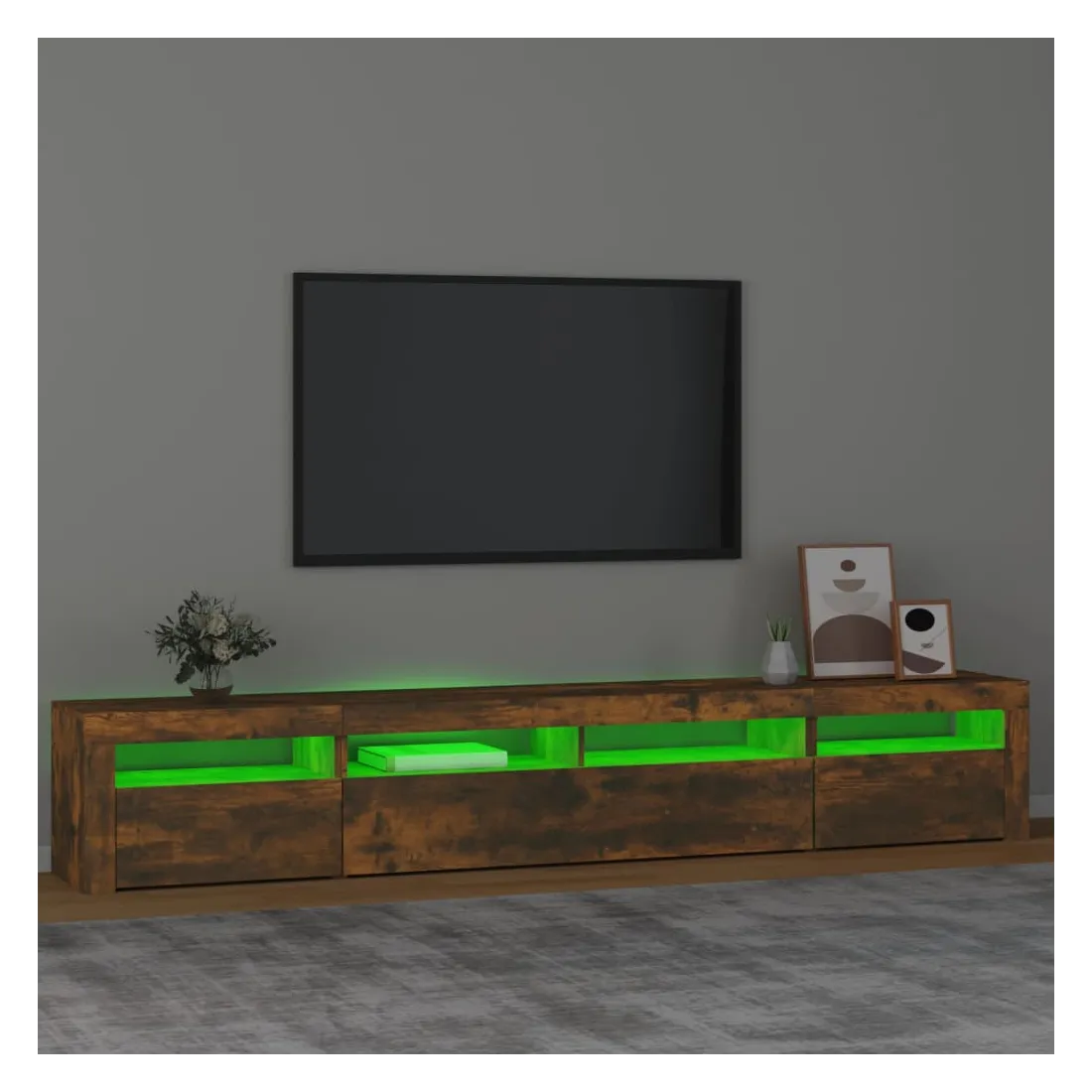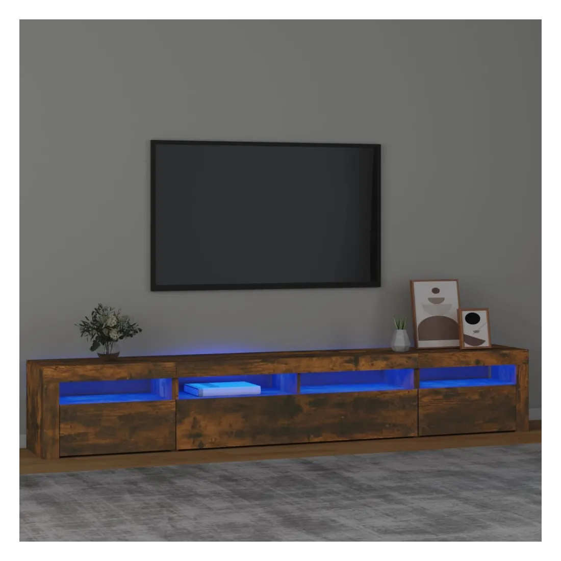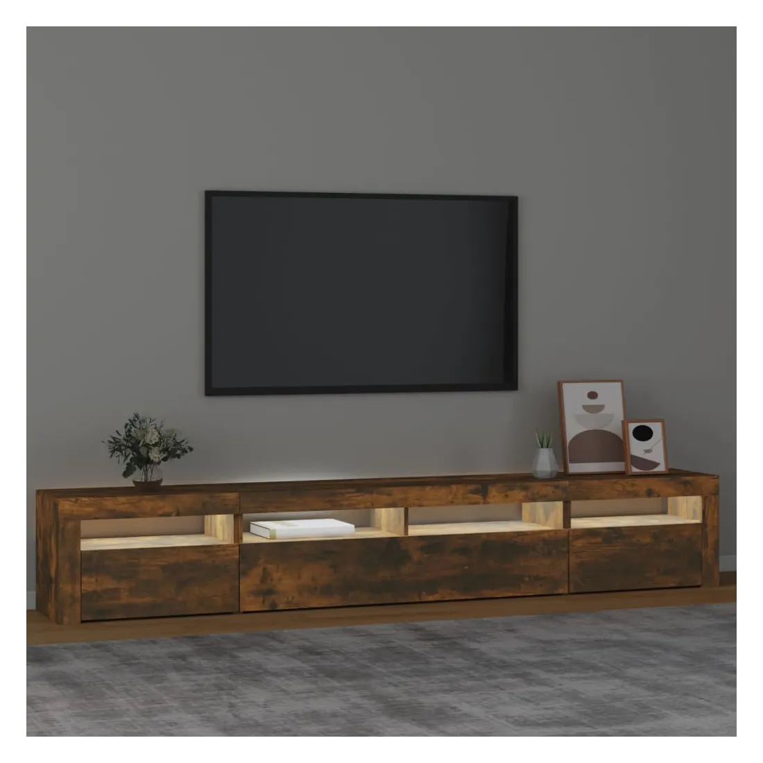 Avec un design à la fois tendance et pratique, ce meuble TV avec éclairage LED deviendra certainement un point central de votre pièce. Matériau pratique : le bois d'ingénierie est d'une qualité exceptionnelle avec une surface lisse et présente également résistance, stabilité et résistance à l'humidité.Lumières LED colorées : le meuble TV est doté de lumières LED RVB, qui ont différents menus pour changer la couleur des lumières et laisser la couleur s'ajuster automatiquement. Les lumières LED soulignent l'aspect moderne et contribuent à la sensation de tendance.Grand espace de rangement : le meuble TV offre un grand espace de rangement pour garder vos magazines, livres, télécommandes et autres petits objets bien organisés et à portée de main.Fonction d'affichage : le dessus robuste du meuble média est idéal pour exposer des objets décoratifs, des cadres photo et des plantes en pot. Remarque :Ce produit est doté d'un connecteur USB, mais la source d'alimentation certifiée de USB 5V n'est pas incluse.Chaque produit est livré avec un manuel de montage dans la boîte pour un montage facile.