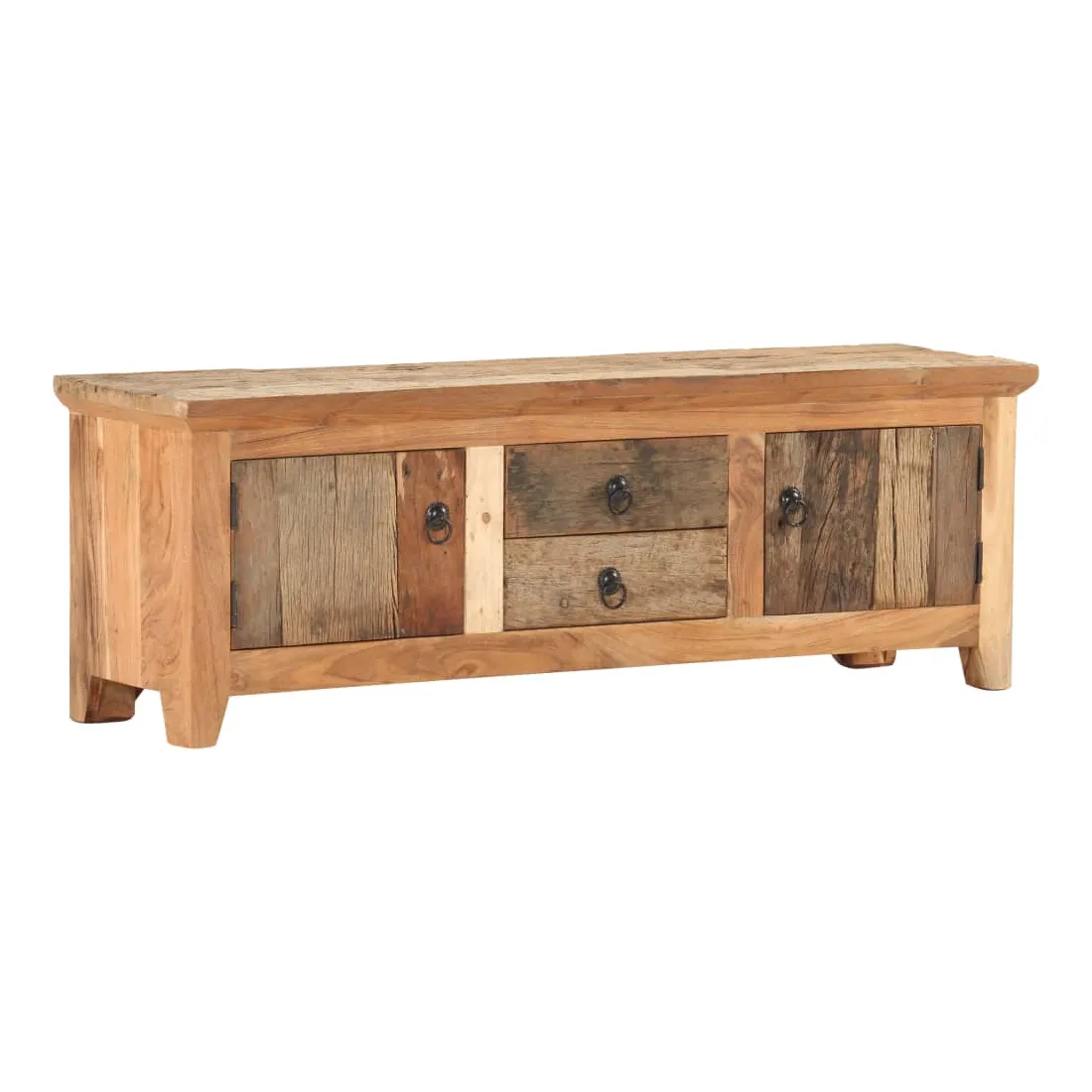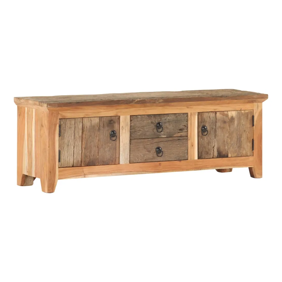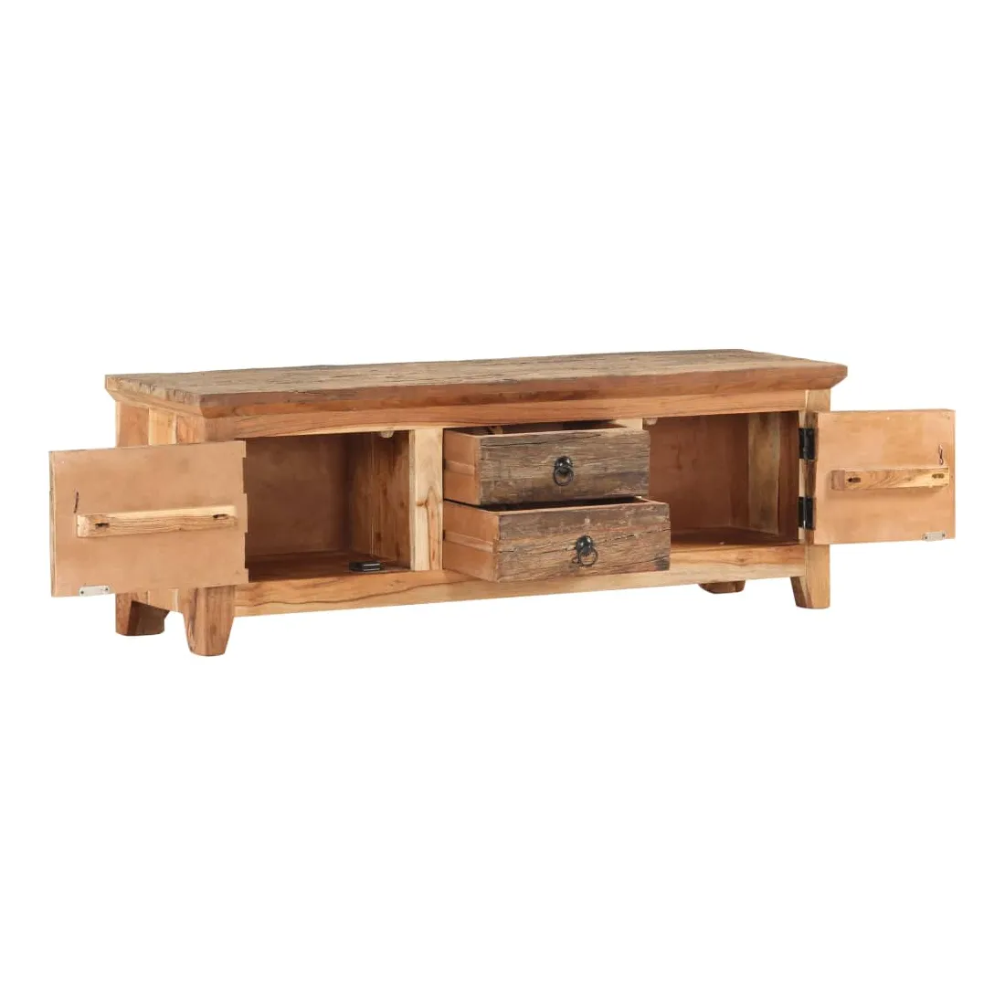 Ce meuble TV en bois est un choix parfait pour apporter un style rustique à votre espace de vie. Ce meuble TV est fait de bois d’acacia massif et de récupération massif. Le bois de récupération provient de solives, de planchers et de poutres de soutien de vieux bâtiments démolis. Donc, il peut se composer de différents types de bois comme le pin, le teck, le chêne, le bois de manguier, l’acacia, etc. Cela signifie également que le bois de récupération conserve les caractéristiques de ces types de bois. Le bois de récupération est déjà vieilli, altéré et séché, donc il ne rétrécit pas ou ne se plie pas. Ce meuble stéréo comporte 2 compartiments et 2 tiroirs, offrant suffisamment d’espace pour garder divers essentiels bien organisés et à portée de main. Remarque importante : la couleur et les grains du bois peuvent varier d'une pièce à l'autre, ce qui rend chaque pièce de meuble HiFi unique et légèrement différente l'une de l'autre.
