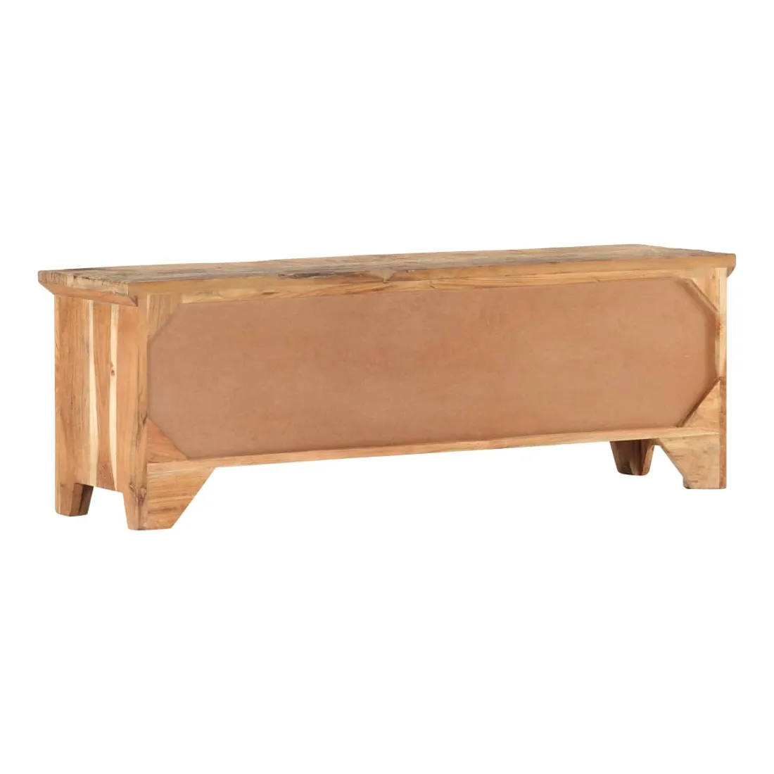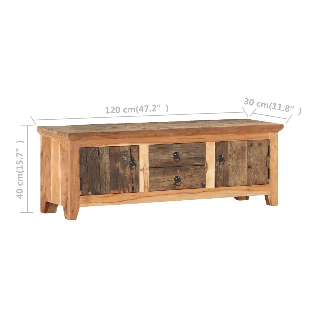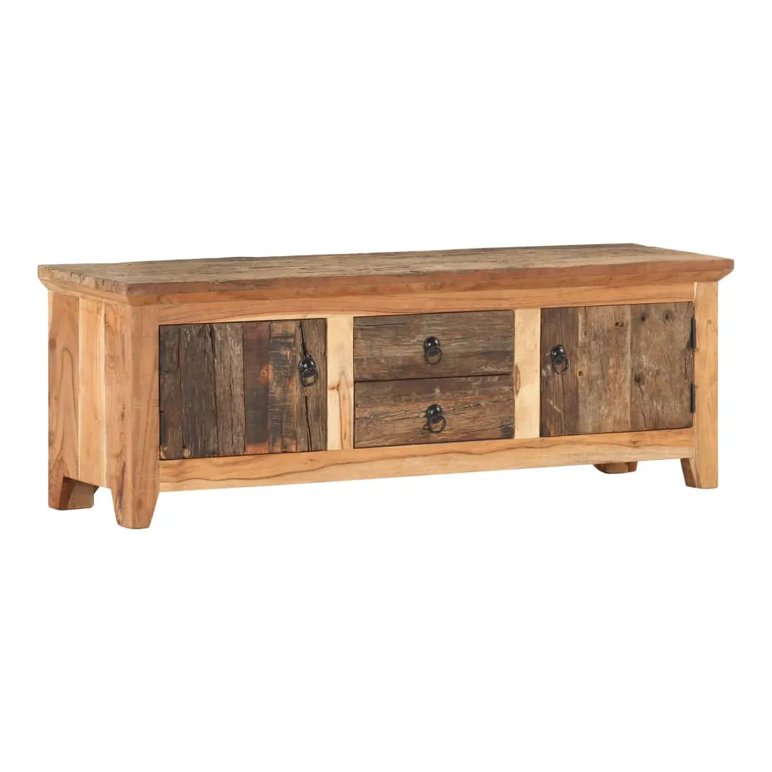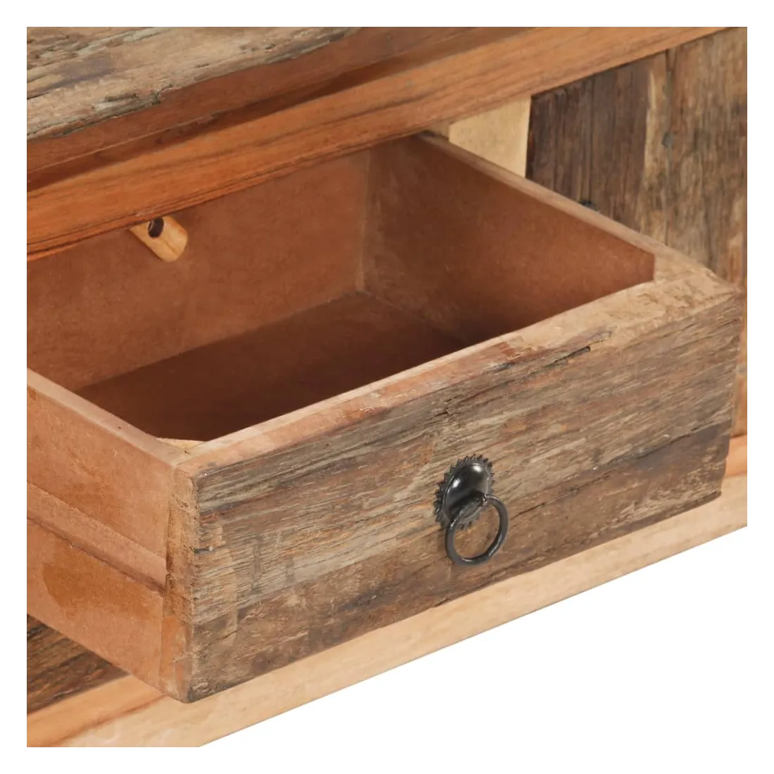 Ce meuble TV en bois est un choix parfait pour apporter un style rustique à votre espace de vie. Ce meuble TV est fait de bois d’acacia massif et de récupération massif. Le bois de récupération provient de solives, de planchers et de poutres de soutien de vieux bâtiments démolis. Donc, il peut se composer de différents types de bois comme le pin, le teck, le chêne, le bois de manguier, l’acacia, etc. Cela signifie également que le bois de récupération conserve les caractéristiques de ces types de bois. Le bois de récupération est déjà vieilli, altéré et séché, donc il ne rétrécit pas ou ne se plie pas. Ce meuble stéréo comporte 2 compartiments et 2 tiroirs, offrant suffisamment d’espace pour garder divers essentiels bien organisés et à portée de main. Remarque importante : la couleur et les grains du bois peuvent varier d'une pièce à l'autre, ce qui rend chaque pièce de meuble HiFi unique et légèrement différente l'une de l'autre.