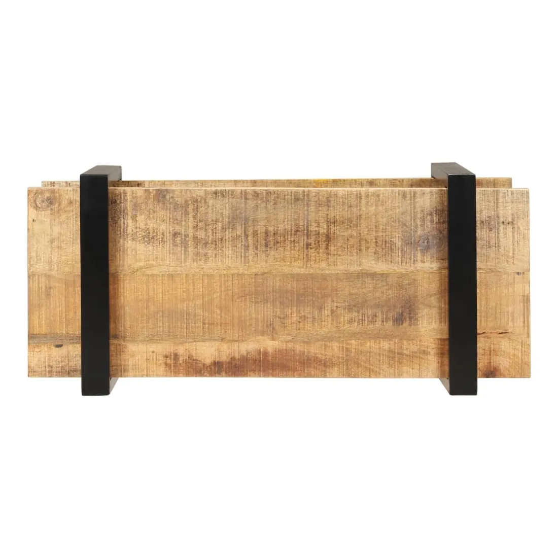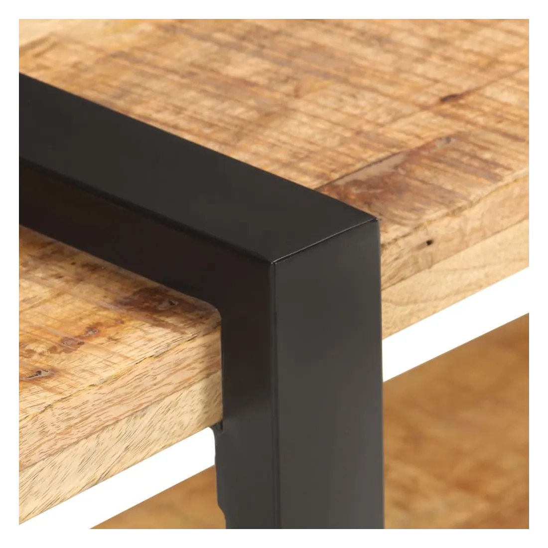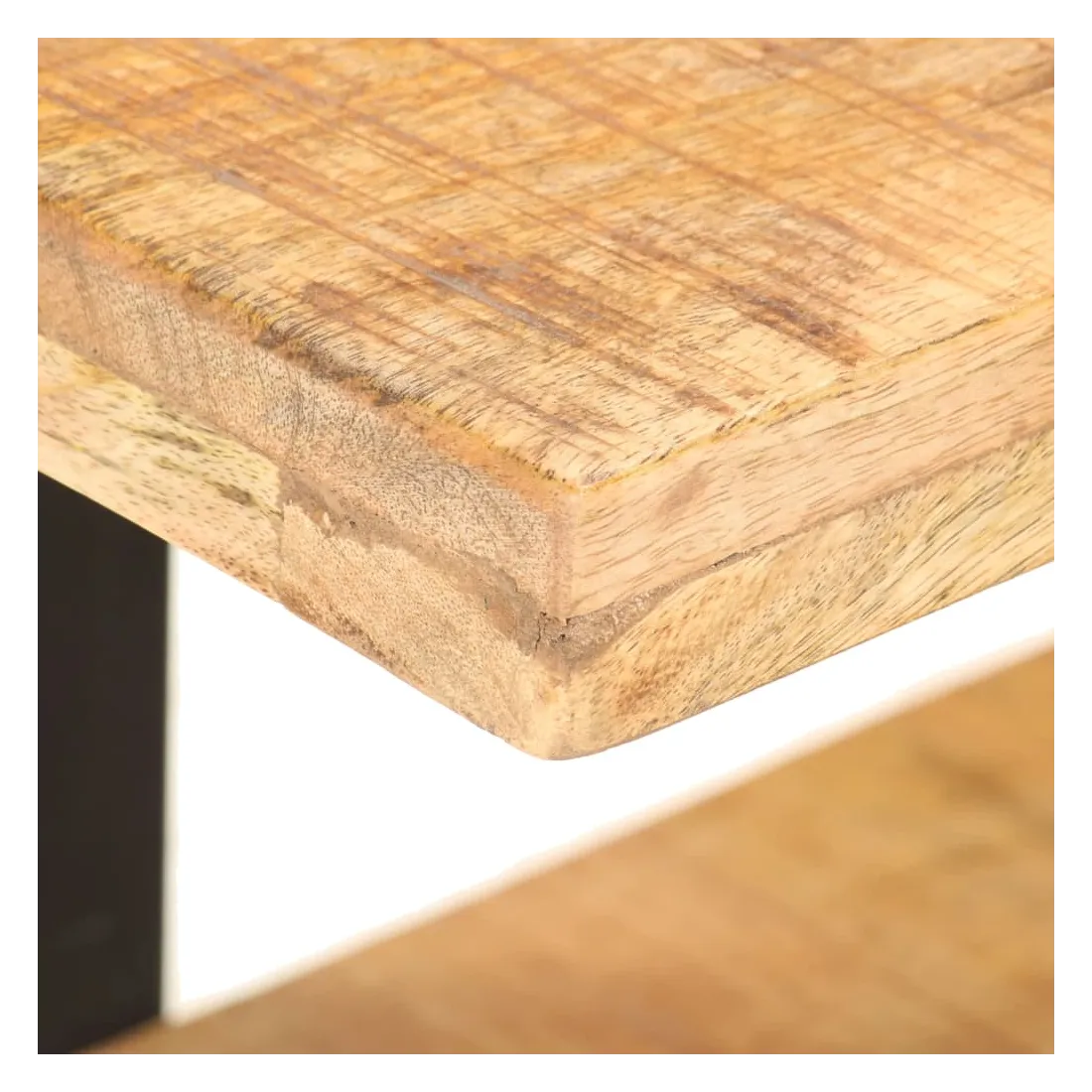 - Matériau : bois de manguier brut avec une finition naturelle, fer avec revêtement en poudre noire