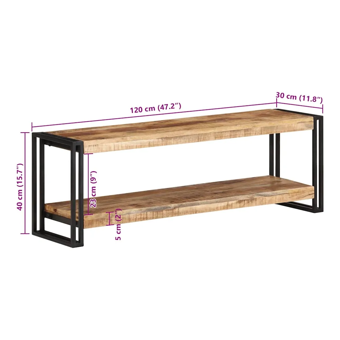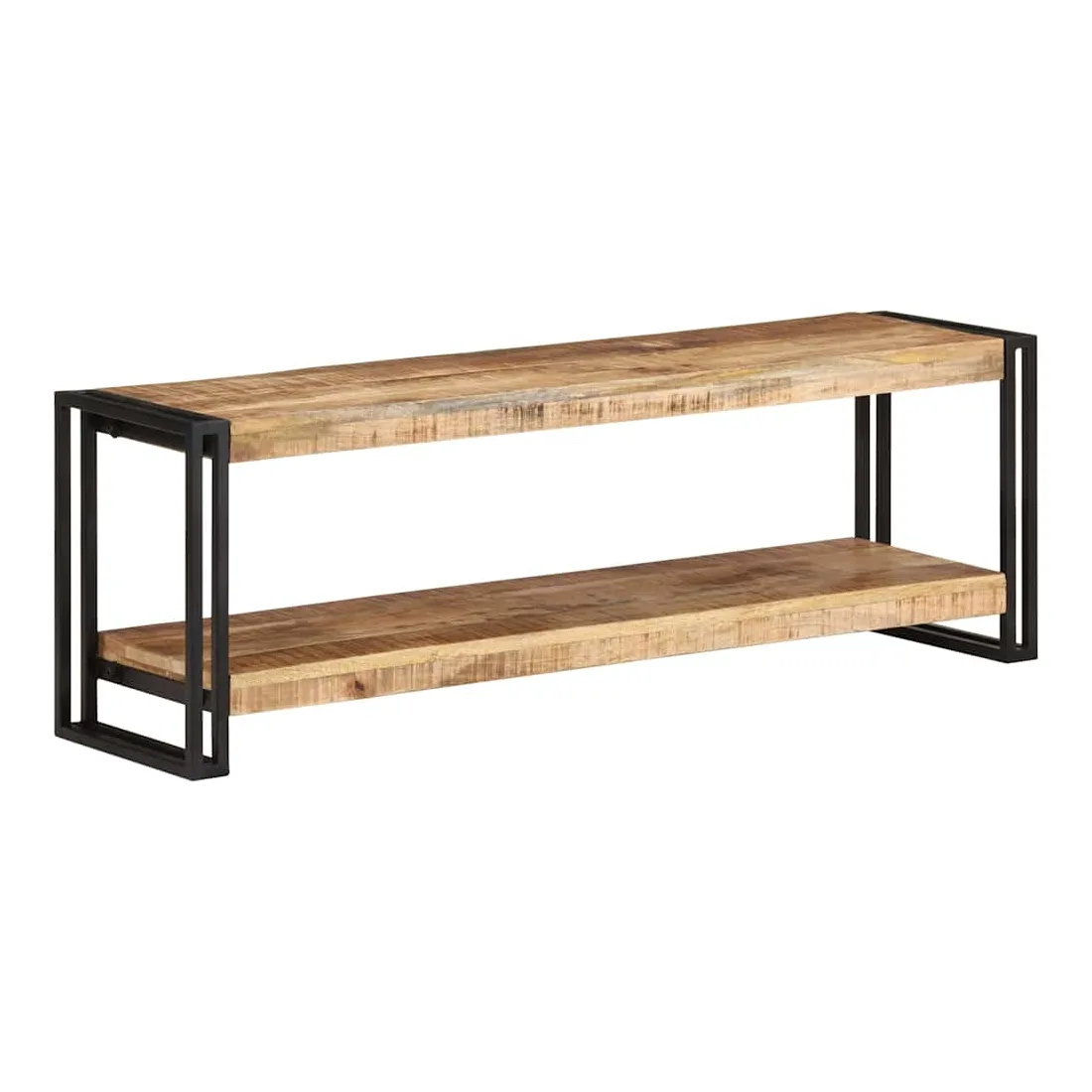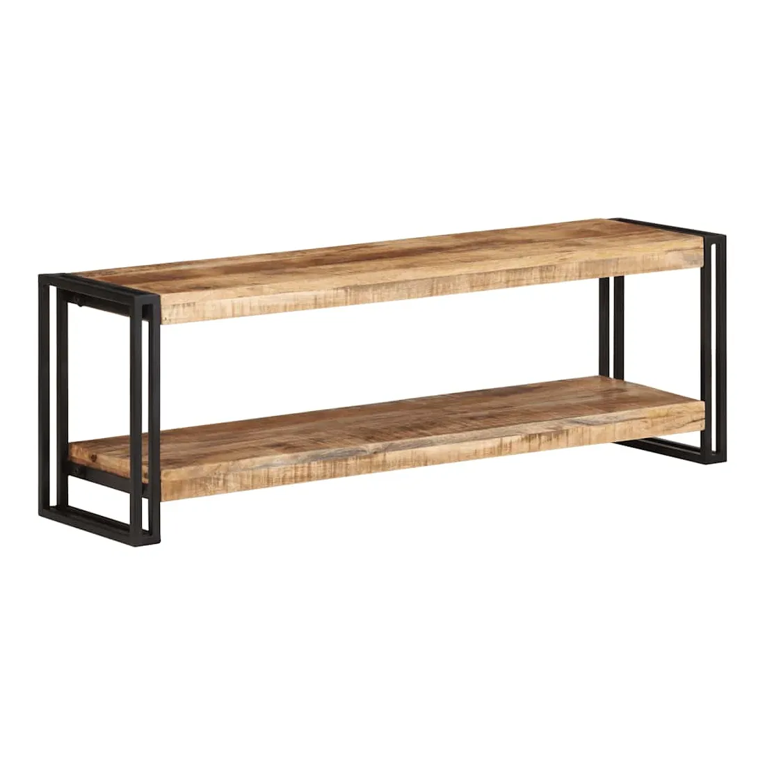 Ce meuble TV en bois ajoute un aspect industriel et convient à votre salon et votre chambre à coucher. Le meuble TV est fait de bois de manguier brut, un bois dur tropical avec la force de soutenir le poids. Il résiste également à l’usure du temps, ce qui le rend stable et durable. Le dessus robuste peut être utilisé pour mettre vos objets décoratifs. L’étagère de rangement offre également beaucoup d’espace pour stocker vos appareils multimédia, livres, ainsi que divers autres articles. Remarque importante : les couleurs et les grains varient d'une pièce à l'autre, rendant chaque pièce unique. La livraison est aléatoire, ce qui garantit l'exclusivité et l'individualité de votre produit.
