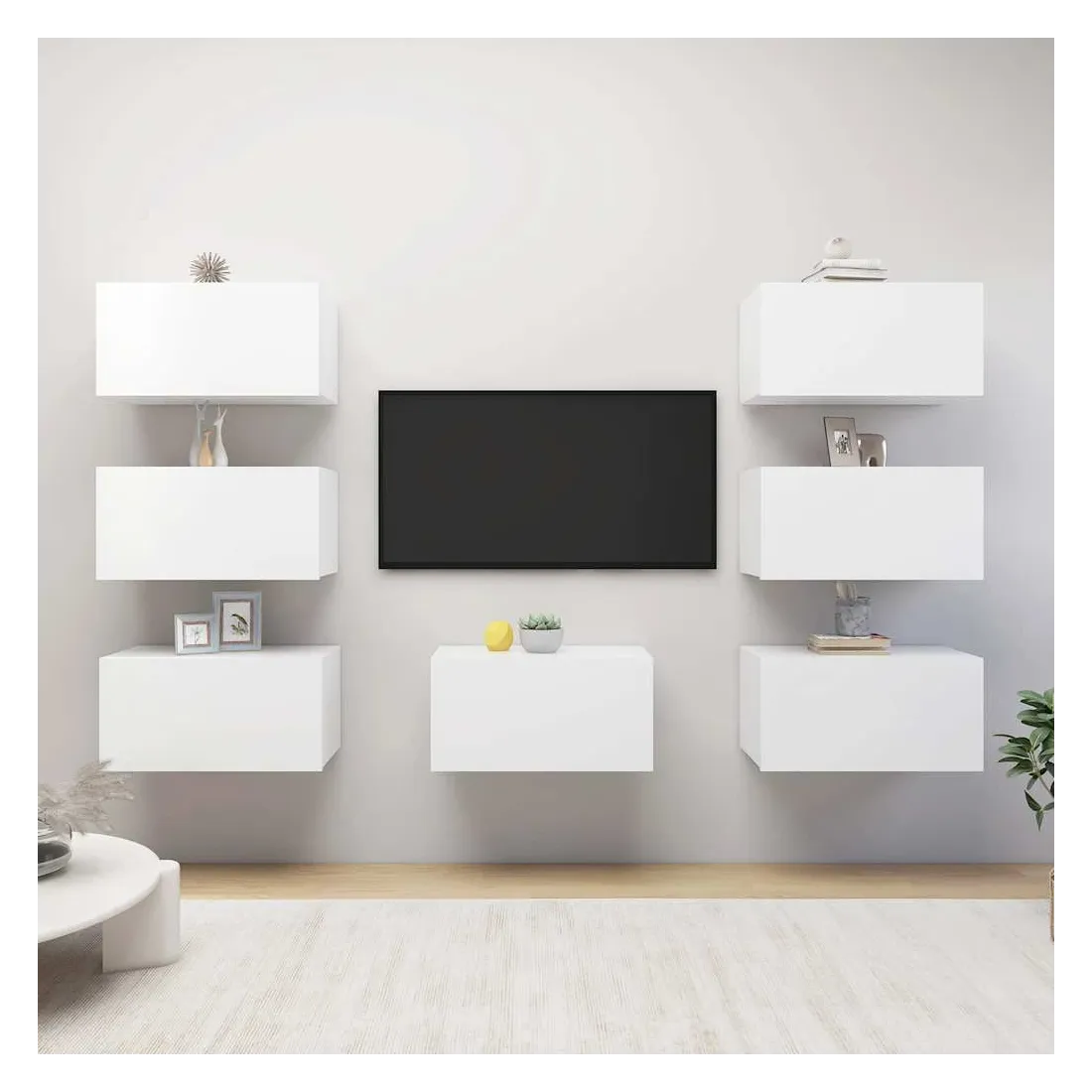 Cet ensemble de meuble TV suspendu est destiné à être le point de mire de votre salon avec un design à la fois tendance et pratique. Ces armoires TV murales sont en bois d'ingénierie, ce qui les rend robustes et stables. Chaque armoire dispose de 2 compartiments, ce qui en fait un endroit idéal pour ranger tous vos livres, magazines, DVD ou autres objets. Ces armoires murales sont également faciles à nettoyer avec un chiffon humide.