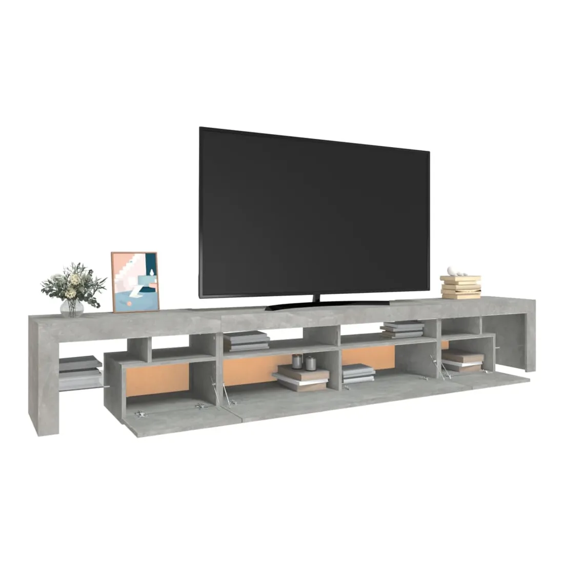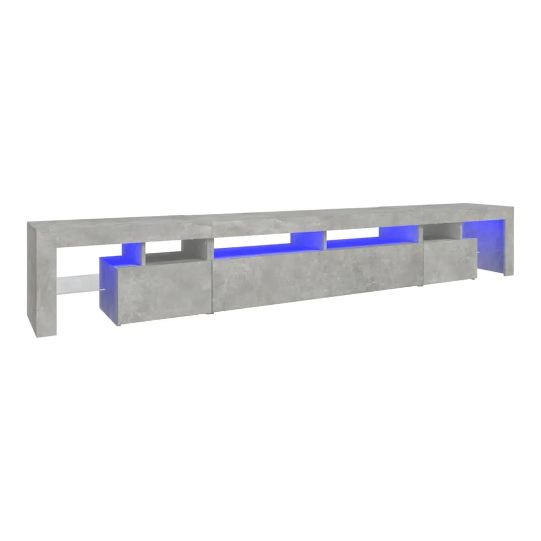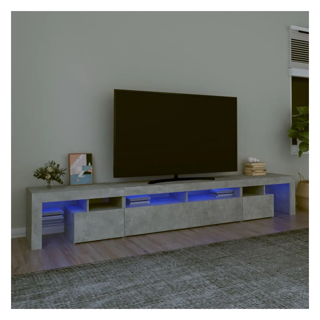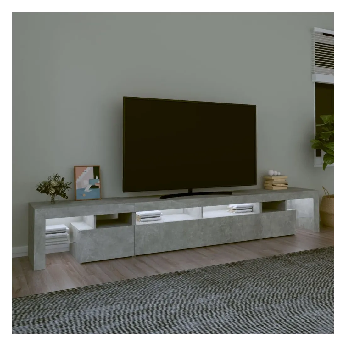 Avec un design à la fois tendance et pratique, ce meuble TV avec éclairage LED deviendra certainement un point central de votre pièce. Matériau pratique : le bois d'ingénierie est d'une qualité exceptionnelle avec une surface lisse et présente également résistance, stabilité et résistance à l'humidité. Lumières LED colorées : le meuble TV est doté de lumières LED RVB, qui ont différents menus pour changer la couleur des lumières et laisser la couleur s'ajuster automatiquement. Les lumières LED soulignent l'aspect moderne et contribuent à la sensation de tendance.Grand espace de rangement : le meuble TV offre un grand espace de rangement pour garder vos magazines, livres, télécommandes et autres petits objets bien organisés et à portée de main.Fonction d'affichage : le dessus robuste du meuble média est idéal pour exposer des objets décoratifs, des cadres photo et des plantes en pot. Remarque :Ce produit est doté d'un connecteur USB, mais la source d'alimentation certifiée de USB 5V n'est pas incluse.Chaque produit est livré avec un manuel de montage dans la boîte pour un montage facile.