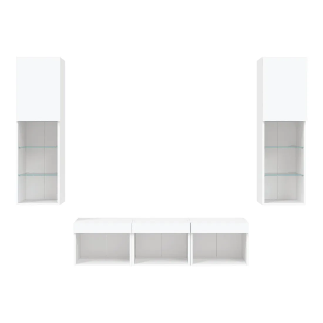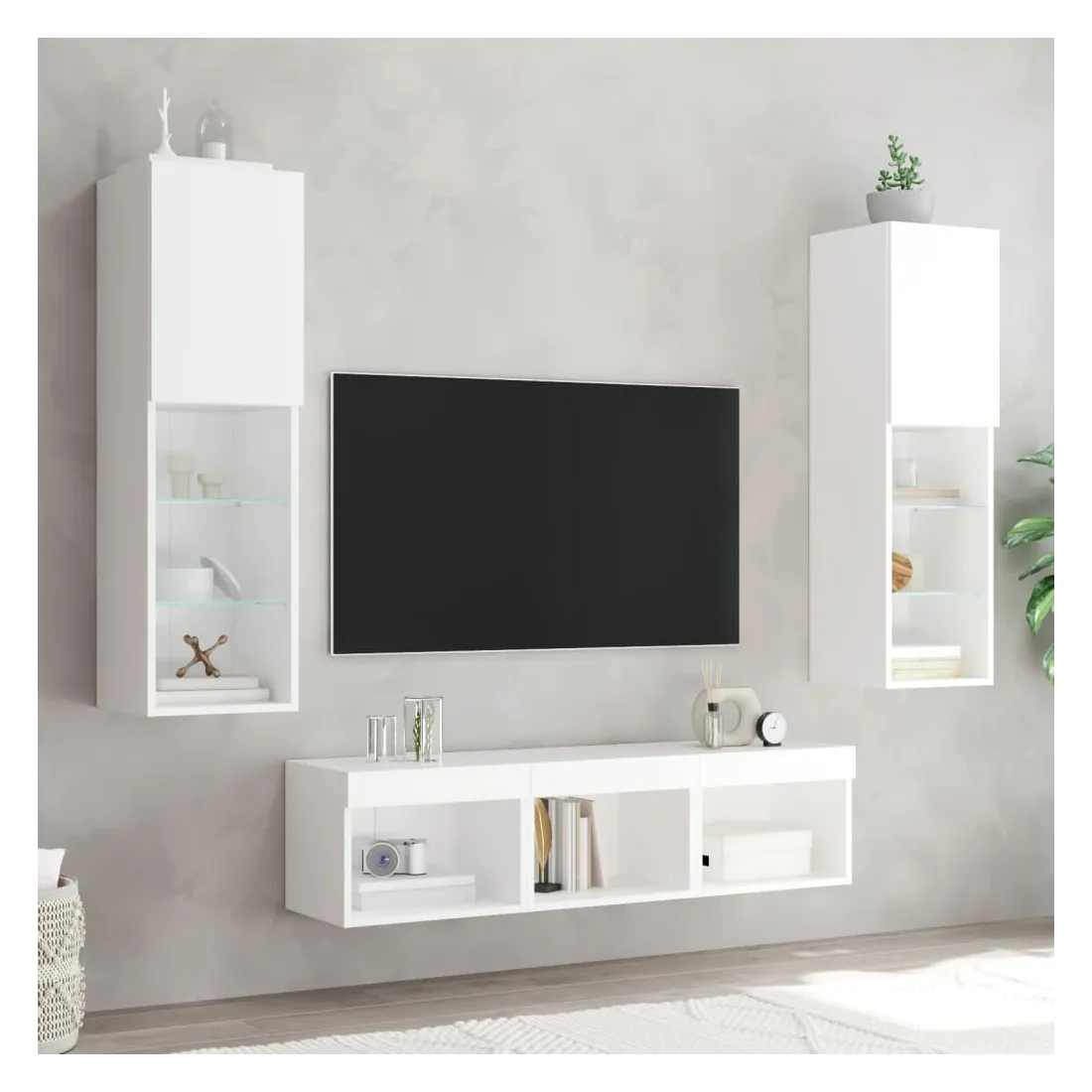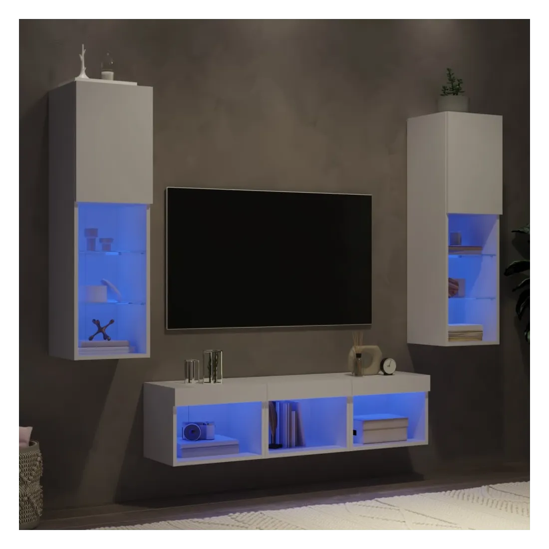 Ces unités murales TV sont la solution parfaite pour votre espace de vie afin de maximiser l'espace et de garder les surfaces au sol sans encombrement. Matériau robuste : le bois d'ingénierie est d'une qualité exceptionnelle avec une surface lisse et présente également résistance, stabilité et résistance à l'humidité.Lumières LED RVB : la unité TV est équipée de lumières LED RVB vibrantes. Avec divers menus personnalisables, vous pouvez changer sans effort la couleur des lumières et même les régler automatiquement. Ces lumières LED renforcent non seulement l'aspect contemporain du meuble TV flottant, mais aussi son attrait pour la mode.Design mural : le meuble de télévision peut être fixé au mur pour ajouter un espace de stockage supplémentaire. De cette façon, vous pouvez maximiser votre espace au sol et garder la zone propre.Grand espace de rangement : le meuble TV flottant est doté de différentes options de rangement, offrant ainsi un grand espace pour ranger vos objets quotidiens tels que les livres, les DVD, les accessoires multimédias et d'autres articles bien organisés et à portée de main.Design polyvalent : vous pouvez l'utiliser comme meuble TV ou le monter sur le mur du lieu de travail pour un rangement pratique des outils ou d'autres articles divers. En outre, il transforme un mur vide en élément de design. Bon à savoir :Les vis et les chevilles pour l'intérieur du mur ne sont pas incluses. Nous vous conseillons de trouver et d'utiliser des vis et des chevilles adaptées spécifiquement à vos murs. Si vous n'êtes pas sûr, vous pouvez consulter un professionnel. Veuillez lire et suivre chaque étape des instructions.Ce produit est doté d'un connecteur USB qui nécessite une source d'alimentation USB de 5V certifiée (non incluse).