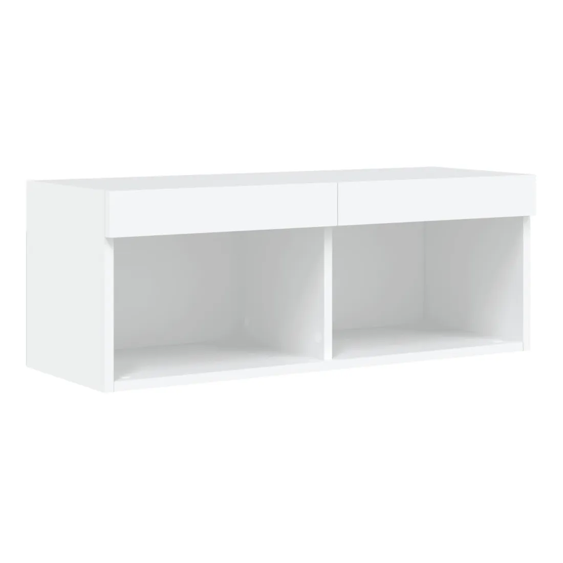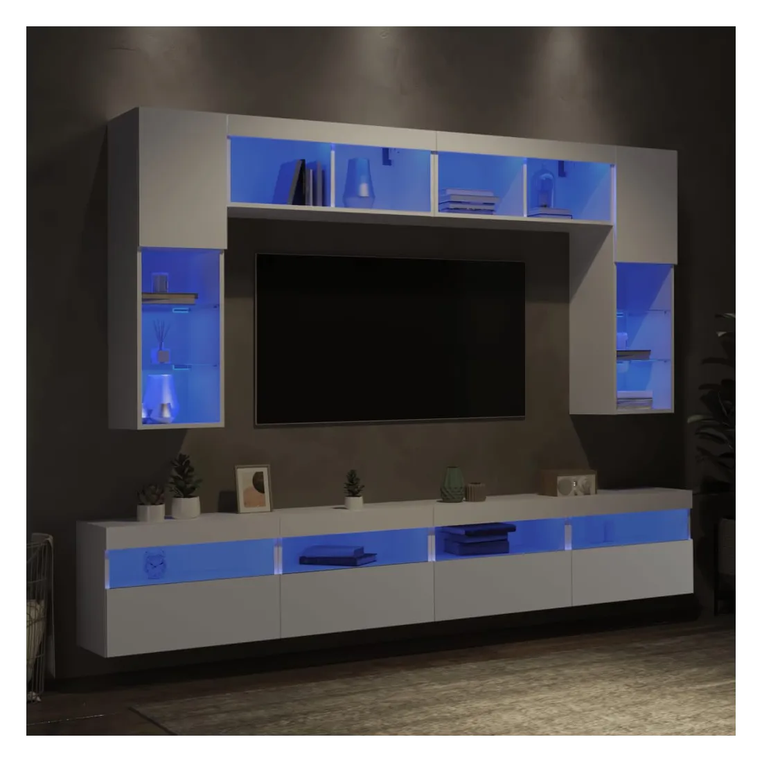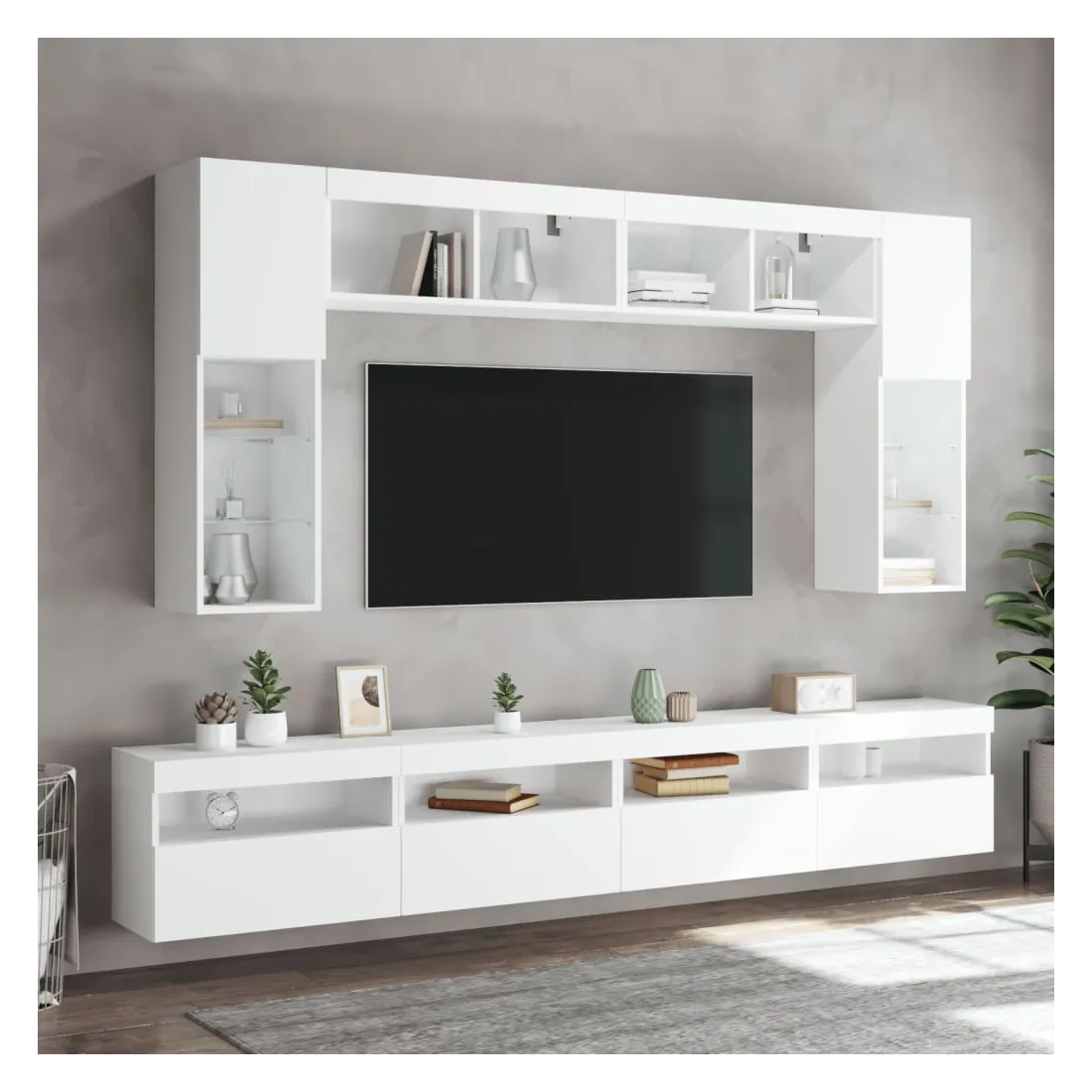 Cet ensemble de meuble TV mural est la solution parfaite pour votre espace de vie afin de maximiser l'espace et de garder les surfaces au sol sans encombrement. Matériau robuste : le bois d'ingénierie est d'une qualité exceptionnelle avec une surface lisse et présente également résistance, stabilité et résistance à l'humidité.Lumières LED RVB : l'unité multimédia murale est équipée de lumières LED RVB vibrantes. Avec divers menus personnalisables, vous pouvez changer sans effort la couleur des lumières et même les régler automatiquement. Ces lumières LED renforcent non seulement l'aspect contemporain du meuble TV flottant, mais aussi son attrait pour la mode.Design mural : l'armoire LED peut être fixée au mur pour ajouter de l'espace de rangement supplémentaire. De cette façon, vous pouvez maximiser votre espace au sol et garder la zone propre.Grand espace de rangement : le meuble TV mural est doté de différentes options de rangement, offrant ainsi un grand espace pour ranger vos objets quotidiens tels que les livres, les DVD, les accessoires multimédias et d'autres articles bien organisés et à portée de main.Design polyvalent : vous pouvez l'utiliser comme meuble TV ou le monter sur le mur du lieu de travail pour un rangement pratique des outils ou d'autres articles divers. De plus, il transforme un mur vide en un élément de décoration. Bon à savoir :Les vis et les chevilles pour l'intérieur du mur ne sont pas incluses. Nous vous conseillons de trouver et d'utiliser des vis et des chevilles adaptées spécifiquement à vos murs. Si vous n'êtes pas sûr, vous pouvez consulter un professionnel. Veuillez lire et suivre chaque étape des instructions.Ce produit est doté d'un connecteur USB qui nécessite une source d'alimentation USB de 5V certifiée (non incluse).