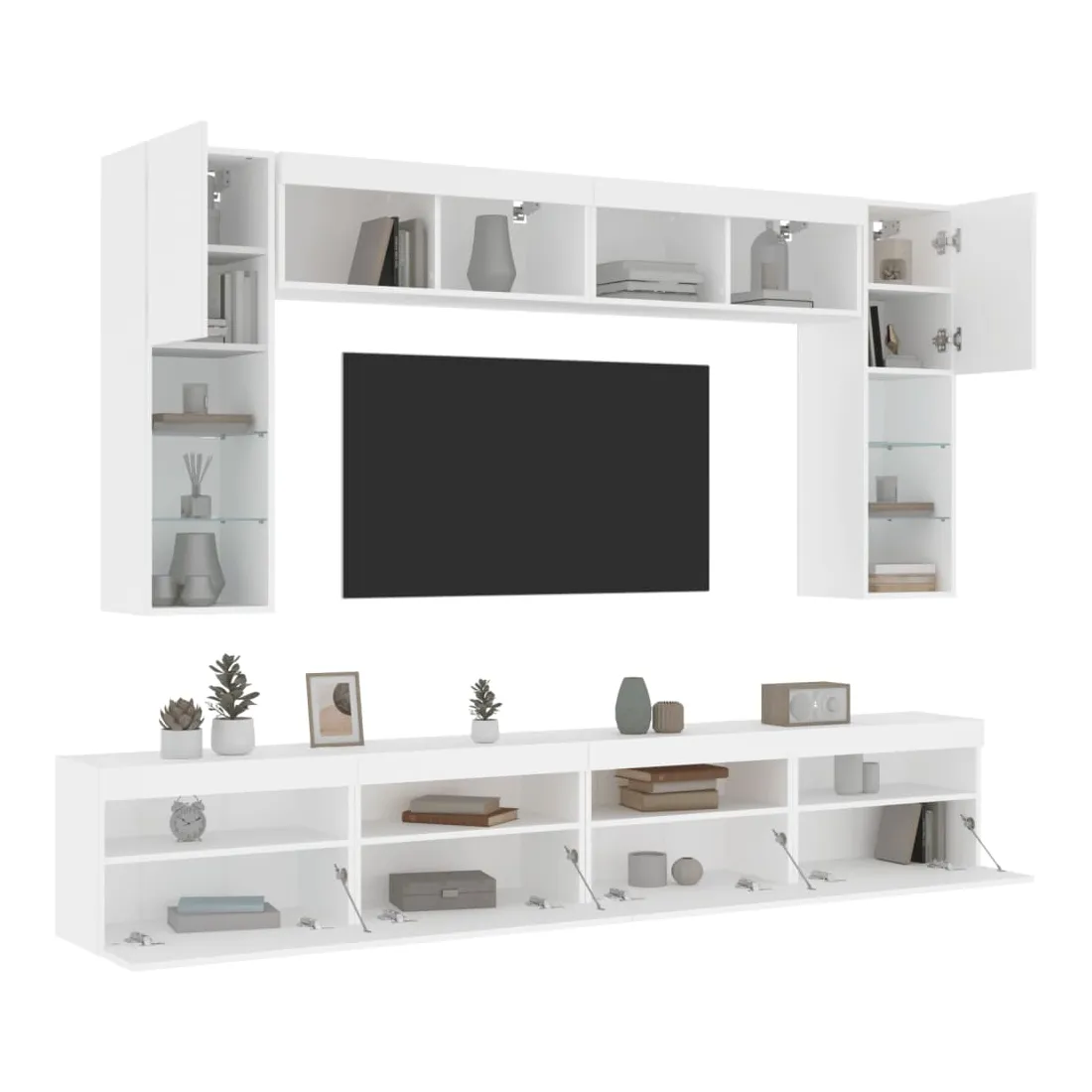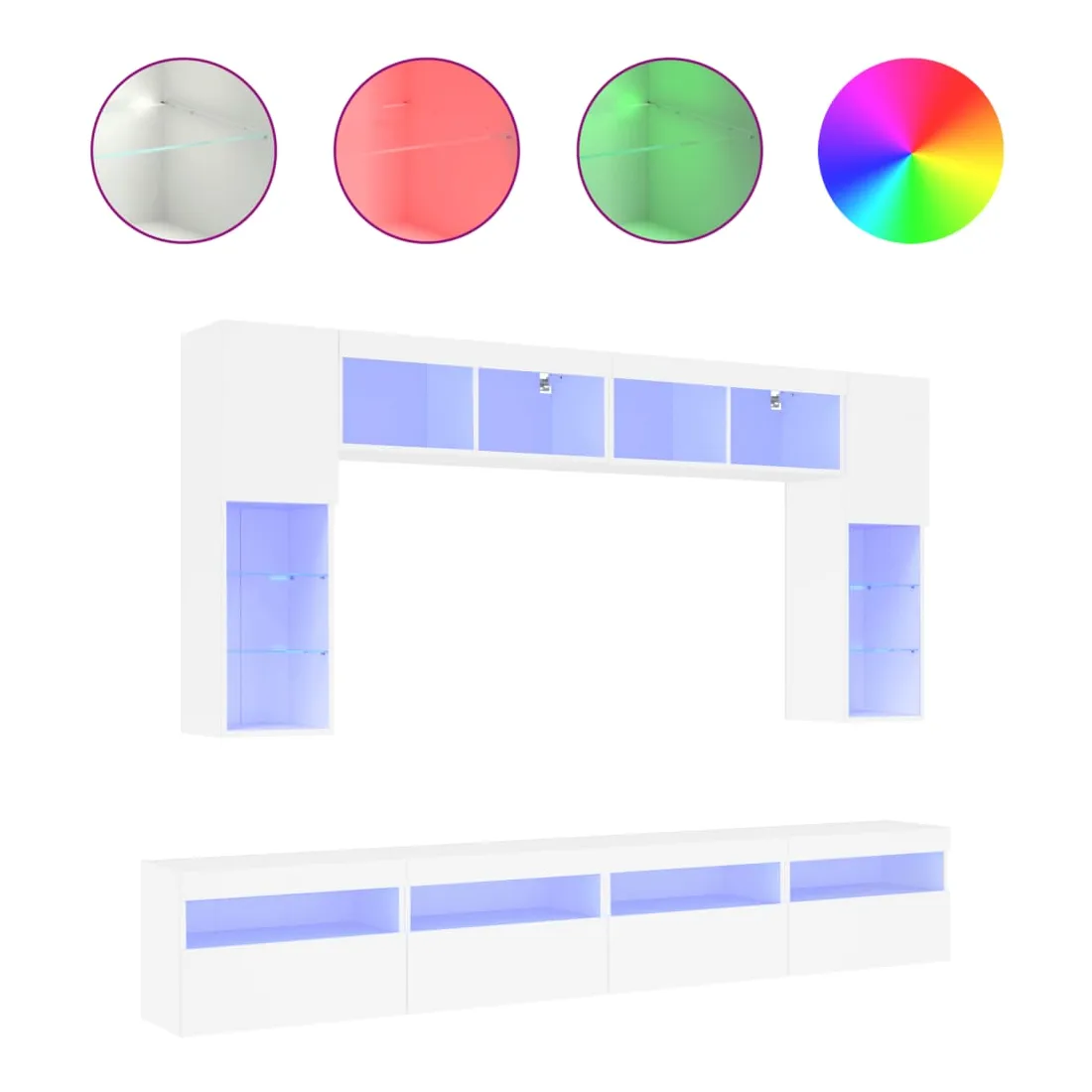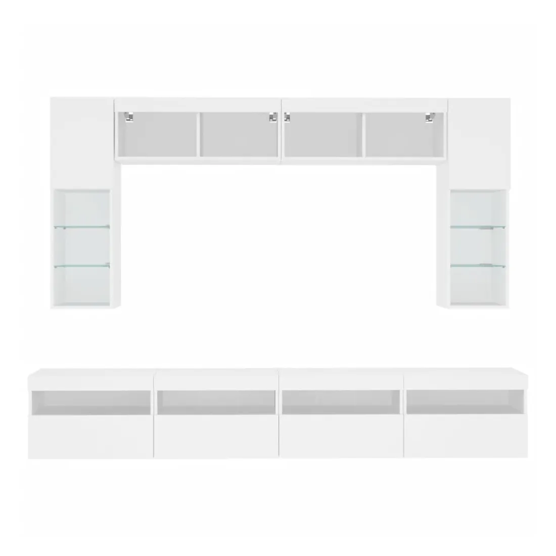 Cet ensemble de meuble TV mural est la solution parfaite pour votre espace de vie afin de maximiser l'espace et de garder les surfaces au sol sans encombrement. Matériau robuste : le bois d'ingénierie est d'une qualité exceptionnelle avec une surface lisse et présente également résistance, stabilité et résistance à l'humidité.Lumières LED RVB : l'unité multimédia murale est équipée de lumières LED RVB vibrantes. Avec divers menus personnalisables, vous pouvez changer sans effort la couleur des lumières et même les régler automatiquement. Ces lumières LED renforcent non seulement l'aspect contemporain du meuble TV flottant, mais aussi son attrait pour la mode.Design mural : l'armoire LED peut être fixée au mur pour ajouter de l'espace de rangement supplémentaire. De cette façon, vous pouvez maximiser votre espace au sol et garder la zone propre.Grand espace de rangement : le meuble TV mural est doté de différentes options de rangement, offrant ainsi un grand espace pour ranger vos objets quotidiens tels que les livres, les DVD, les accessoires multimédias et d'autres articles bien organisés et à portée de main.Design polyvalent : vous pouvez l'utiliser comme meuble TV ou le monter sur le mur du lieu de travail pour un rangement pratique des outils ou d'autres articles divers. De plus, il transforme un mur vide en un élément de décoration. Bon à savoir :Les vis et les chevilles pour l'intérieur du mur ne sont pas incluses. Nous vous conseillons de trouver et d'utiliser des vis et des chevilles adaptées spécifiquement à vos murs. Si vous n'êtes pas sûr, vous pouvez consulter un professionnel. Veuillez lire et suivre chaque étape des instructions.Ce produit est doté d'un connecteur USB qui nécessite une source d'alimentation USB de 5V certifiée (non incluse).