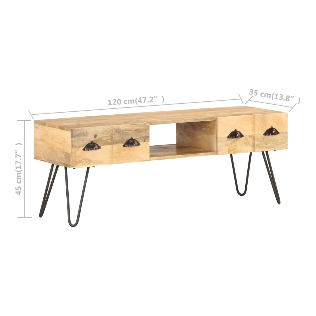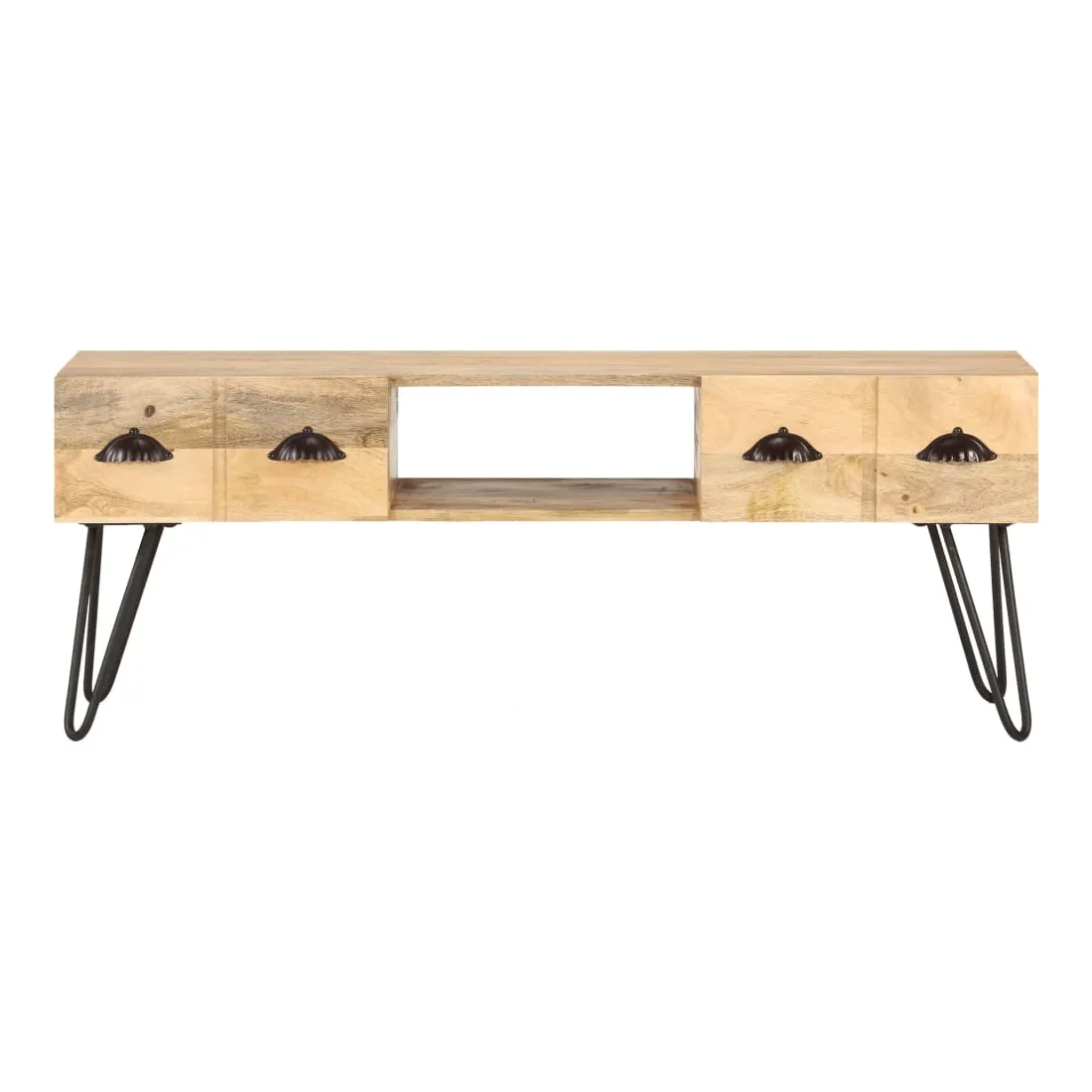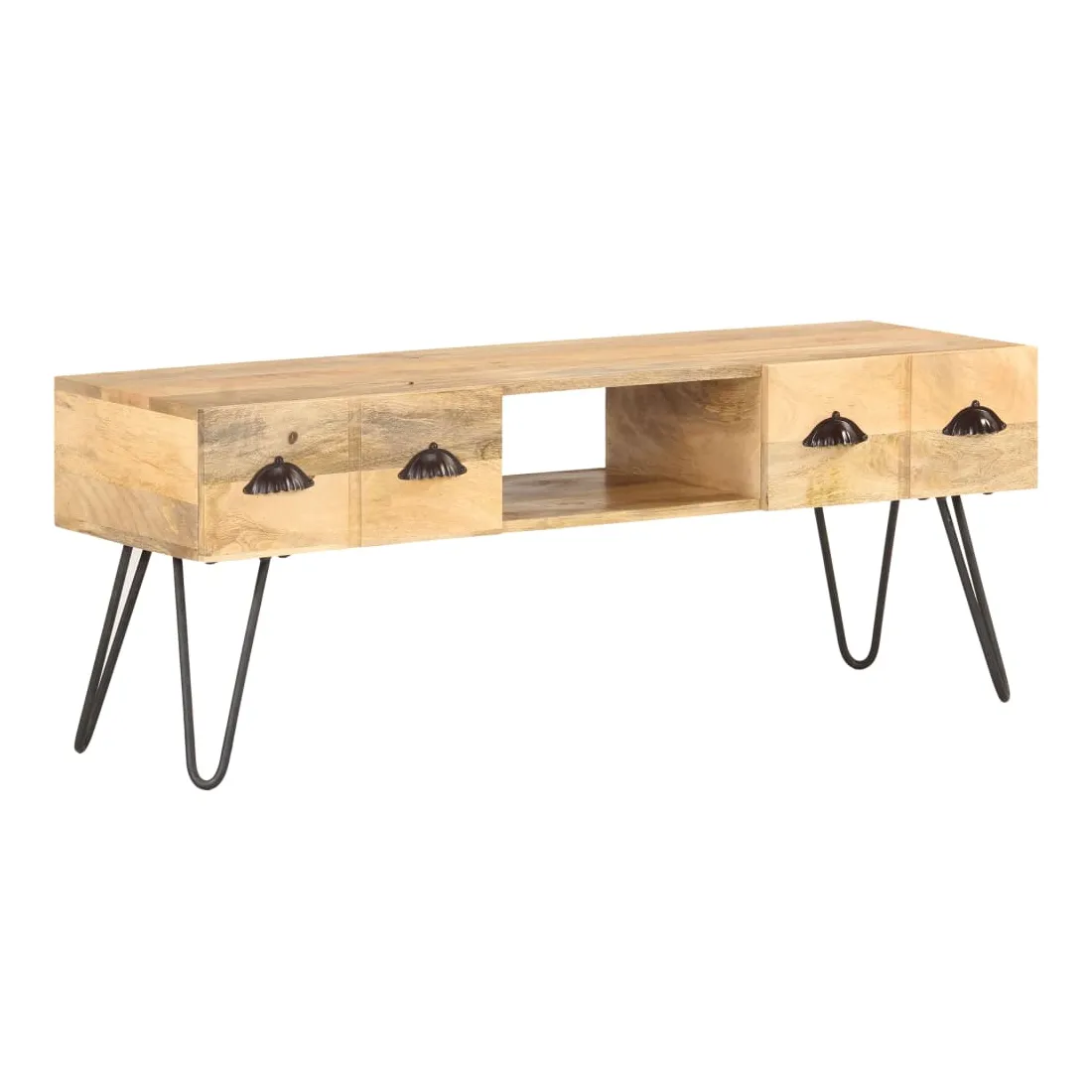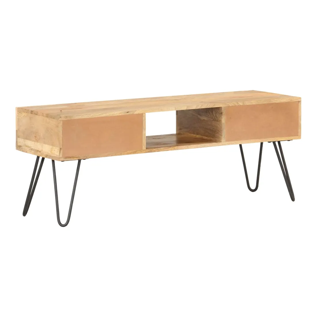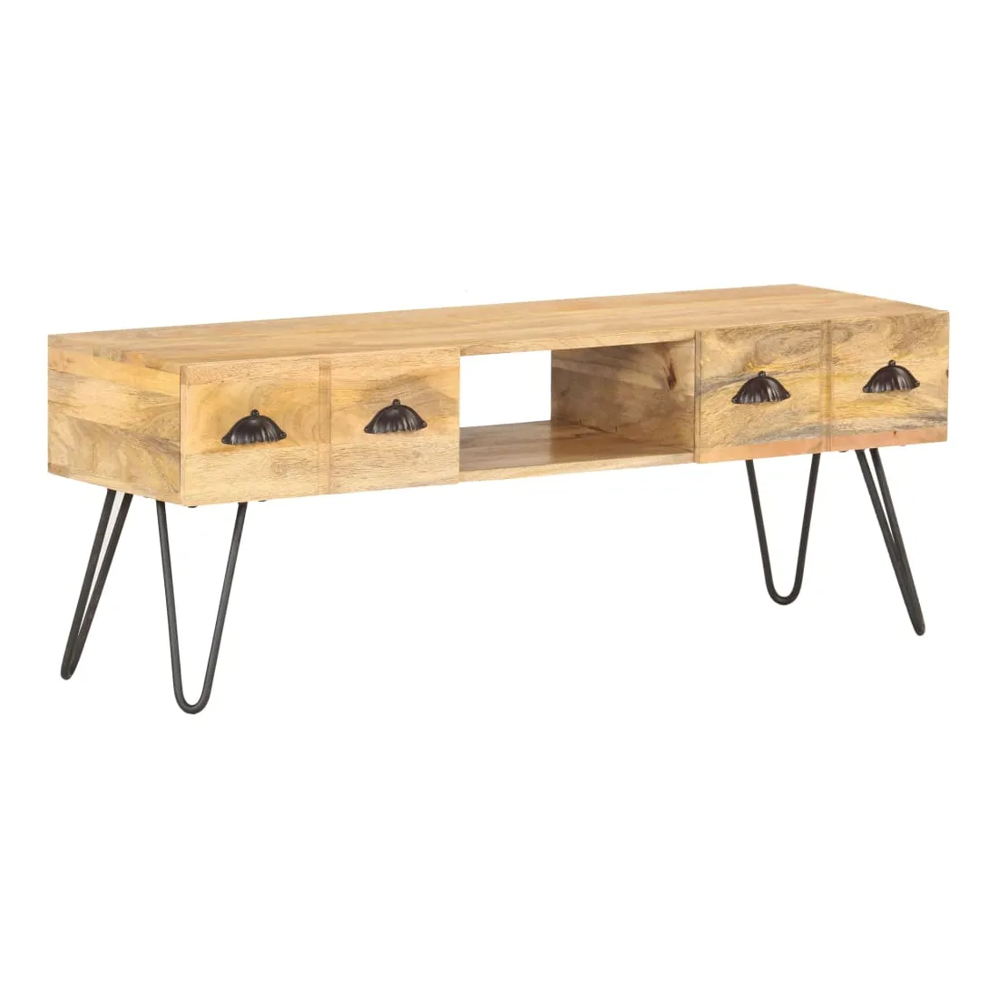 Le meuble TV en bois ajoute un aspect industriel et constitue un excellent supplément décoratif à votre chambre à coucher ou salon. Le meuble TV est fait de bois de manguier massif, un bois dur tropical avec la force de soutenir le poids. Il résiste également à l'usure du temps, ce qui le rend stable et durable. Le savoir-faire et les beaux grains de bois rendent chaque meuble unique et légèrement différent l'un de l'autre. L'armoire latérale comprend 2 tiroirs et 1 compartiment ouvert, offrant un espace de rangement suffisant pour garder vos articles essentiels organisés et à portée de main. Remarque importante : les couleurs et les grains varient d'une pièce à l'autre, rendant chaque pièce unique. La livraison est aléatoire, ce qui garantit l'exclusivité et l'individualité de votre produit.