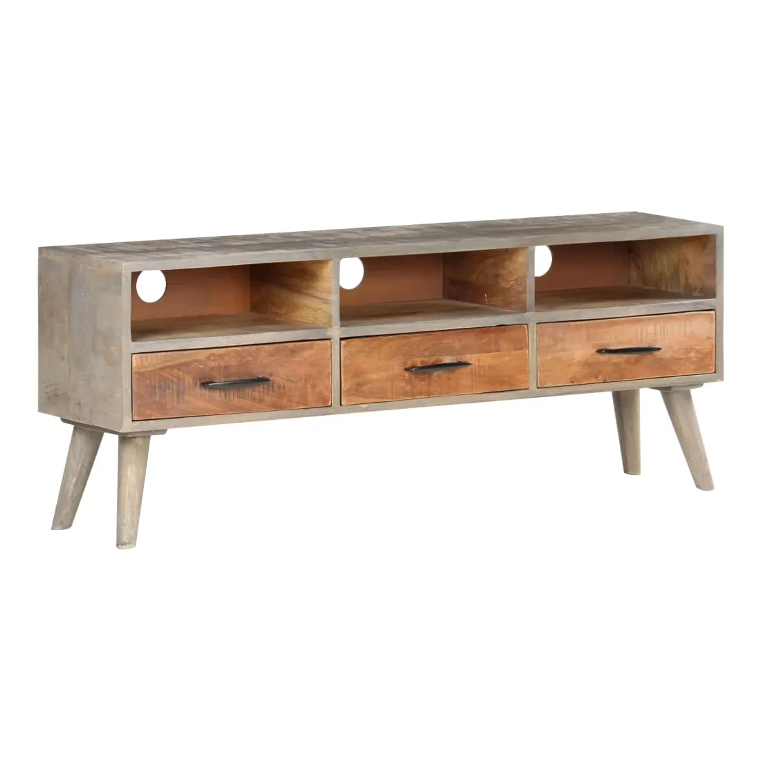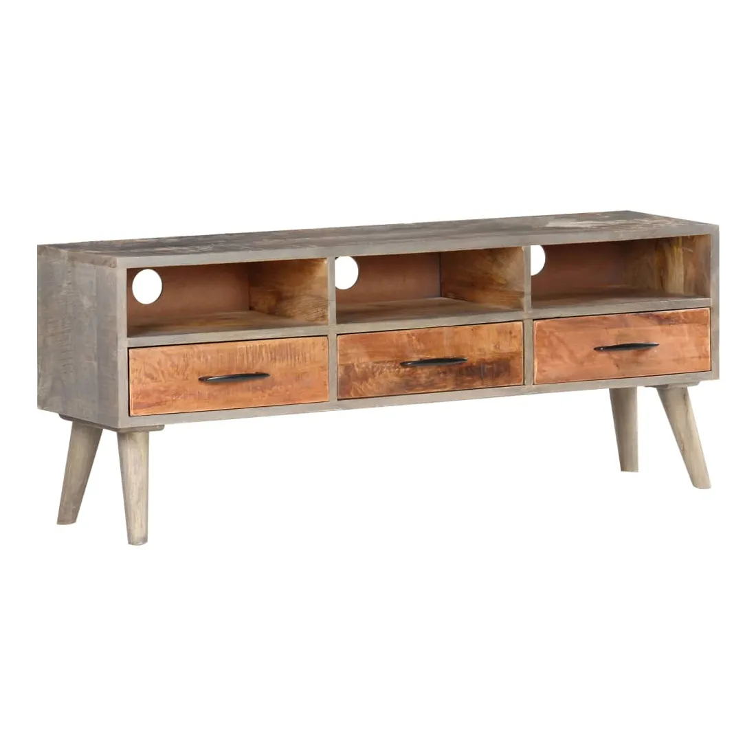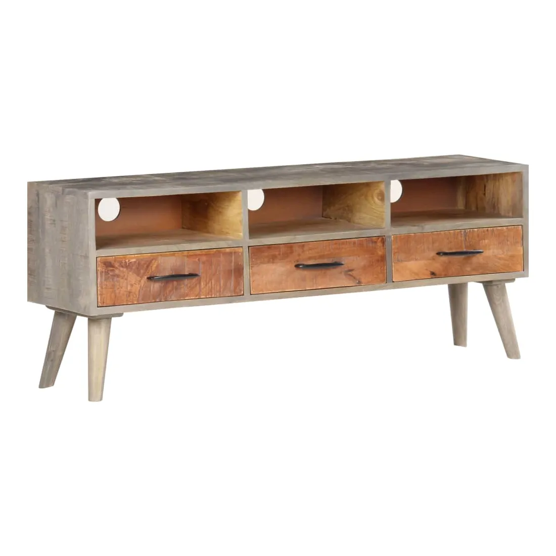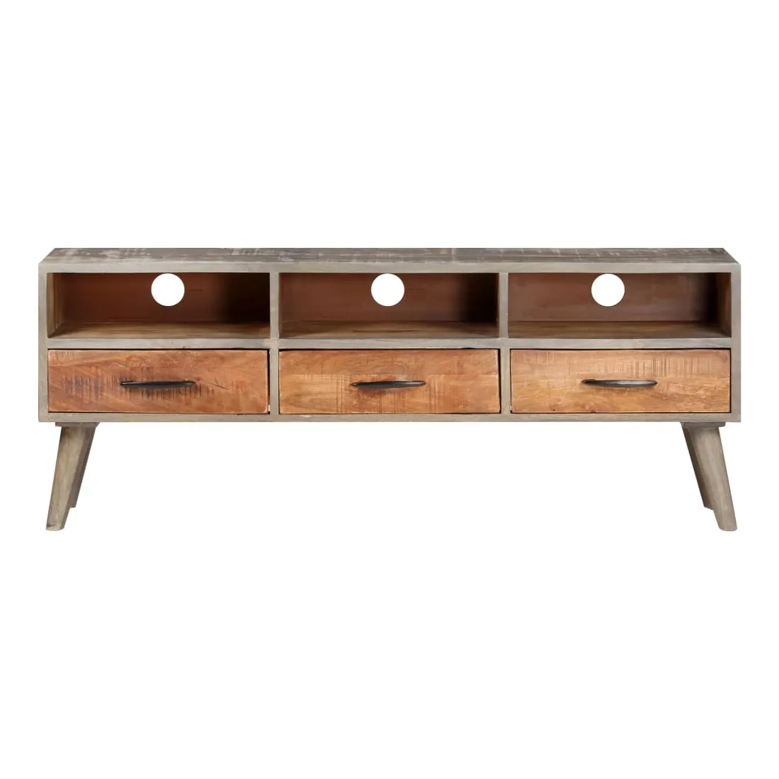 Cet élégant meuble TV en bois offrant un grand espace de rangement est destiné à être le point de mire de votre salon ou de votre zone de divertissement. Ce meuble TV est fait de bois de manguier massif, un bois dur tropical. Il a la force de soutenir le poids et résiste également à l'usure du temps. De plus, le savoir-faire exquis et les beaux grains de bois rendent chaque pièce légèrement différente l'une de l'autre. Cette armoire stéréo comprend 3 compartiments et 3 tiroirs, offrant un espace de rangement suffisant pour garder vos DVD, appareils multimédia, livres et petits articles essentiels organisés et à portée de main. Remarque importante : les couleurs varient d'une pièce à l'autre, rendant chaque pièce unique. La livraison est aléatoire, garantissant l'exclusivité et l'individualité de votre produit.