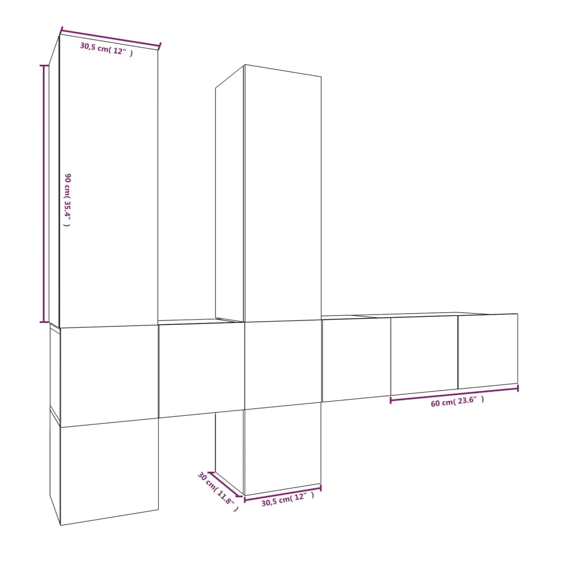 - Meuble TV (milieu) : 60 x 30 x 30 cm (l x P x H)