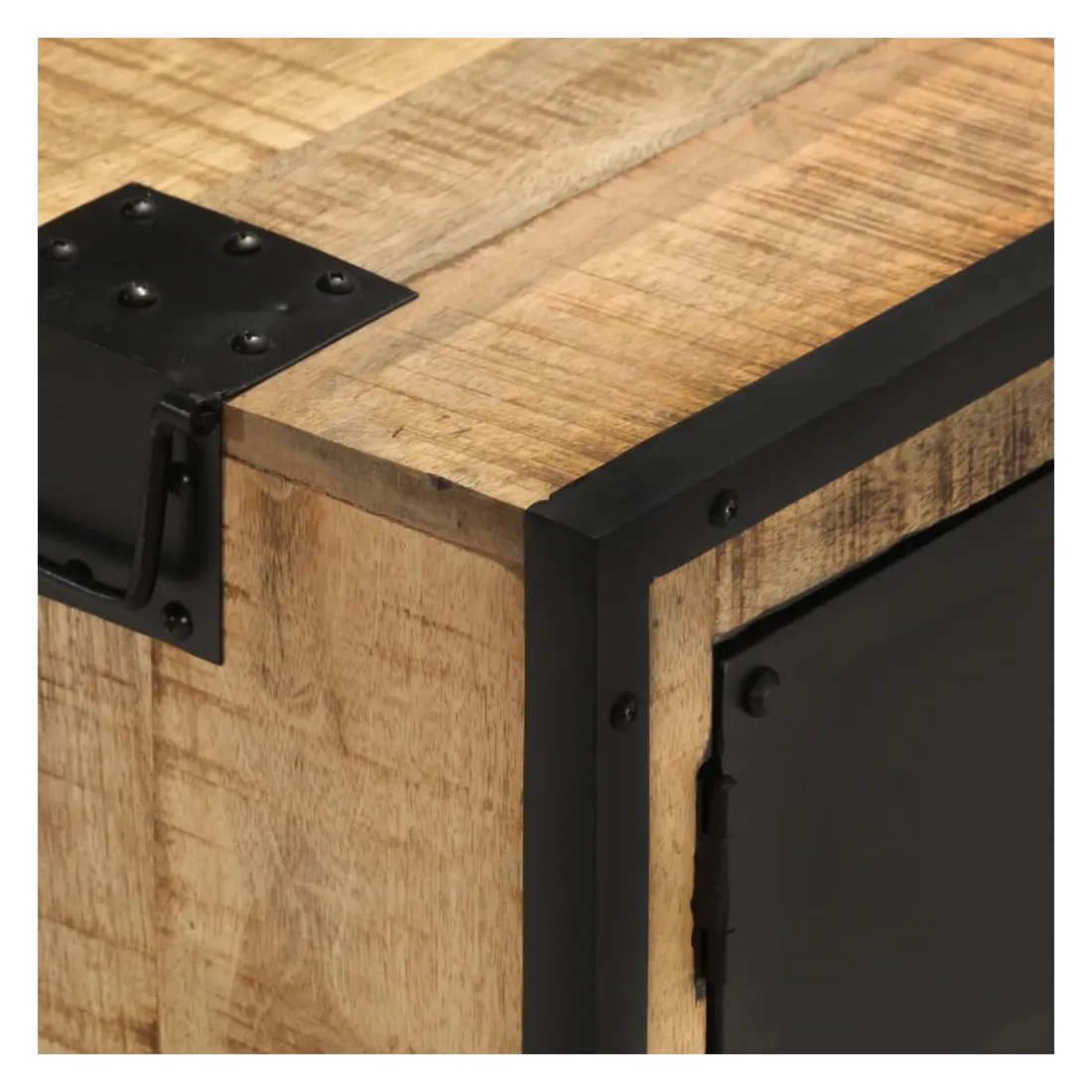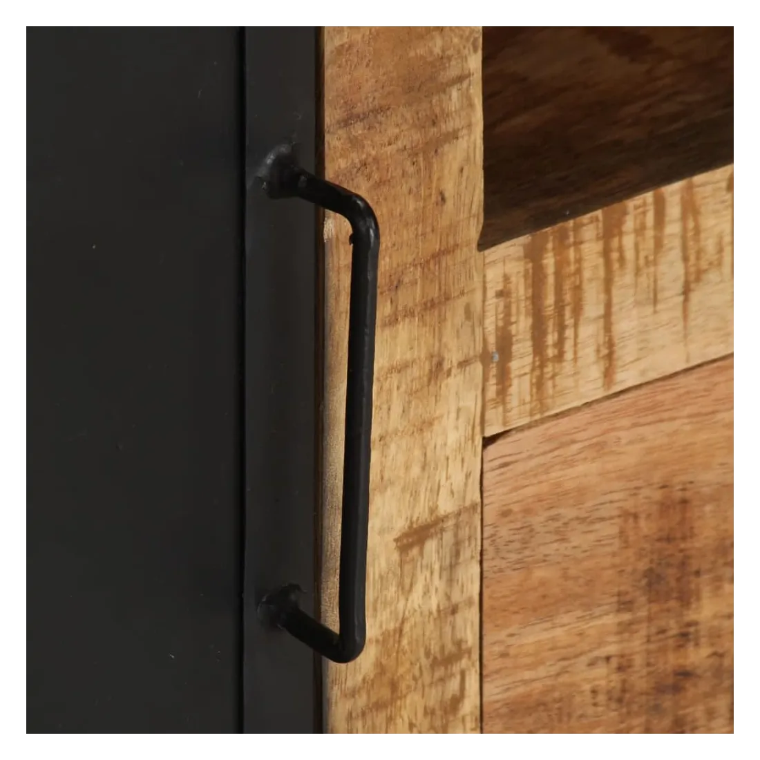 - Matériau : bois de manguier brut avec une finition naturelle, fer avec revêtement en poudre noire