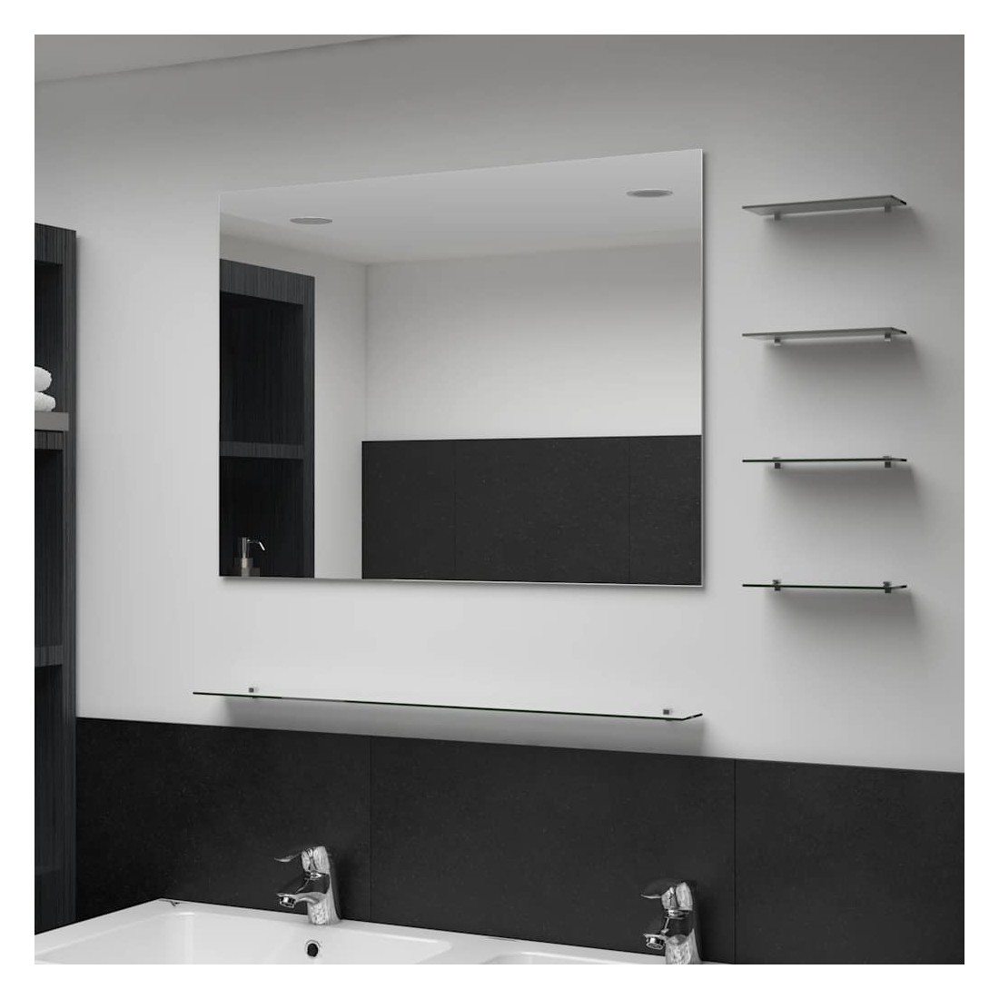 Notre miroir mural avec étagères est orné d'un design élégant. Il sera un supplément pratique et décoratif à votre salle de bain, salon ou chambre à coucher. Fabriqué en verre trempé de qualité, ce meuble de salle de bain est durable et facile à nettoyer. Le miroir rectangulaire encadré au design minimal et contemporain mettra en valeur n'importe quelle pièce, tandis que les quatre petites étagères et la grande étagère en font une pièce pratique pour un rangement supplémentaire. Vous pouvez ranger et exposer les essentiels de la décoration ou du dressing de manière propre et ordonnée. Ce miroir est facile à assembler.