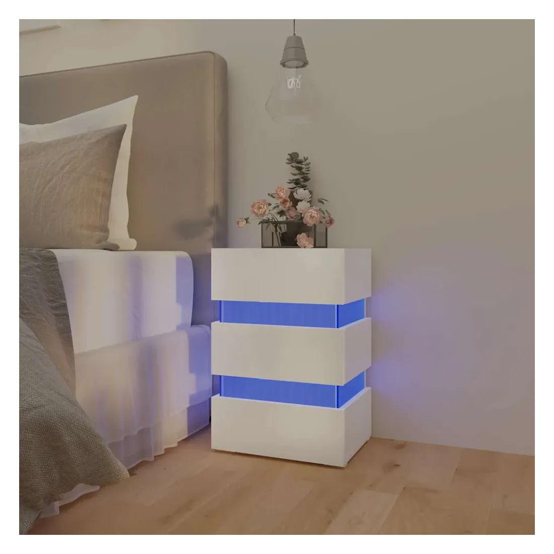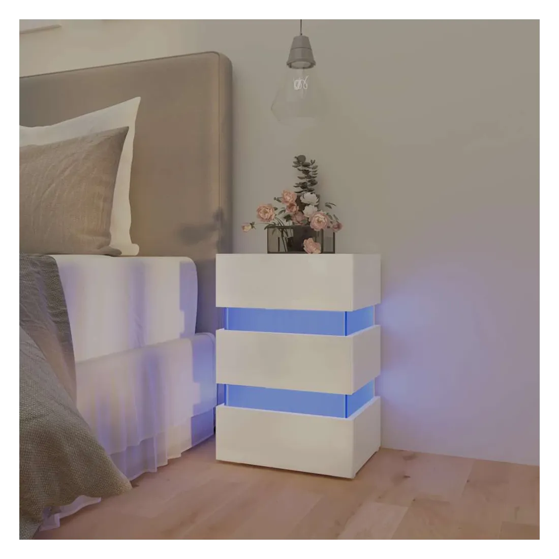 Vous en avez assez de tâtonner dans le noir à la recherche d'un interrupteur au milieu de la nuit ? Avec cette table de chevet à LED, votre problème est résolu ! Fabriquée en bois d'ingénierie de qualité, la table de chevet est stable et facile à nettoyer avec un chiffon humide. Cette armoire de lit offre un grand espace de rangement pour garder vos magazines, livres, télécommandes et autres petits objets bien organisés et à portée de main. De plus, vous pouvez ajouter une touche de modernité supplémentaire grâce à la lumière LED qui est également incluse. Cette table de chevet a tout ce que vous recherchez ! Remarque : ce produit est doté d'un connecteur USB, mais la source d'alimentation certifiée de USB 5V n'est pas incluse.